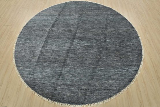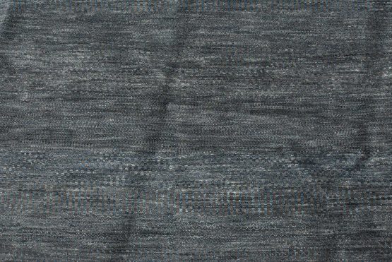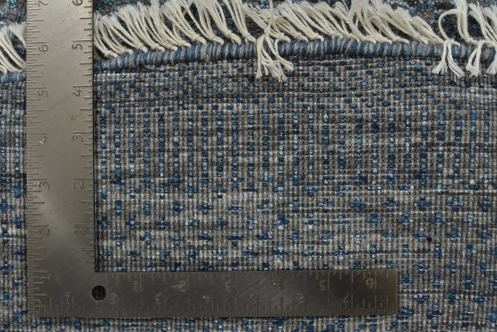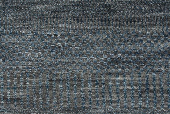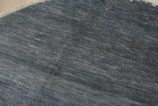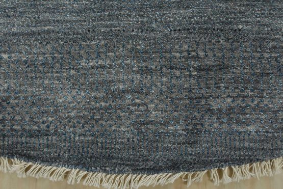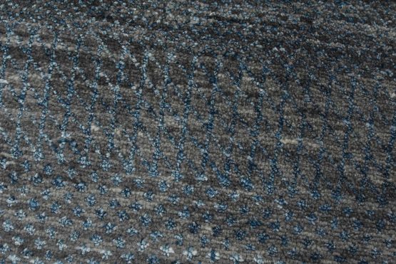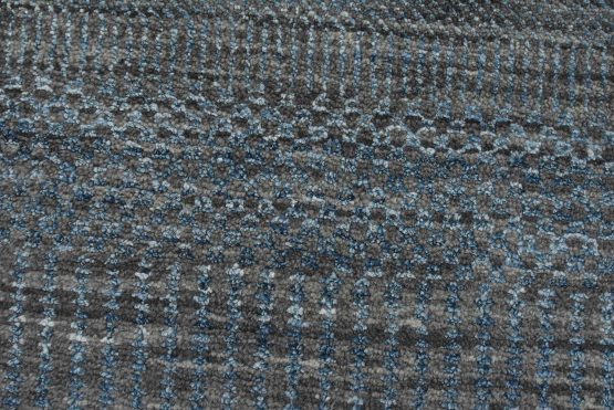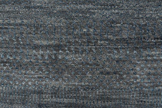 A contemporary area rug hand-knotted with an all-wool pile on a cotton foundation. This finely woven oriental rug features small-scale geometric patterns set against a gray background. It is new and in excellent condition.