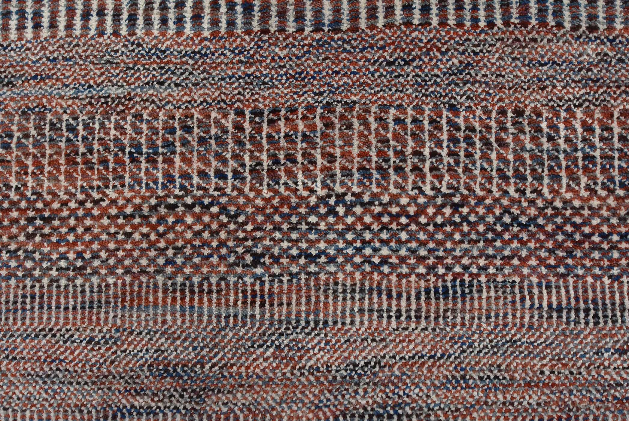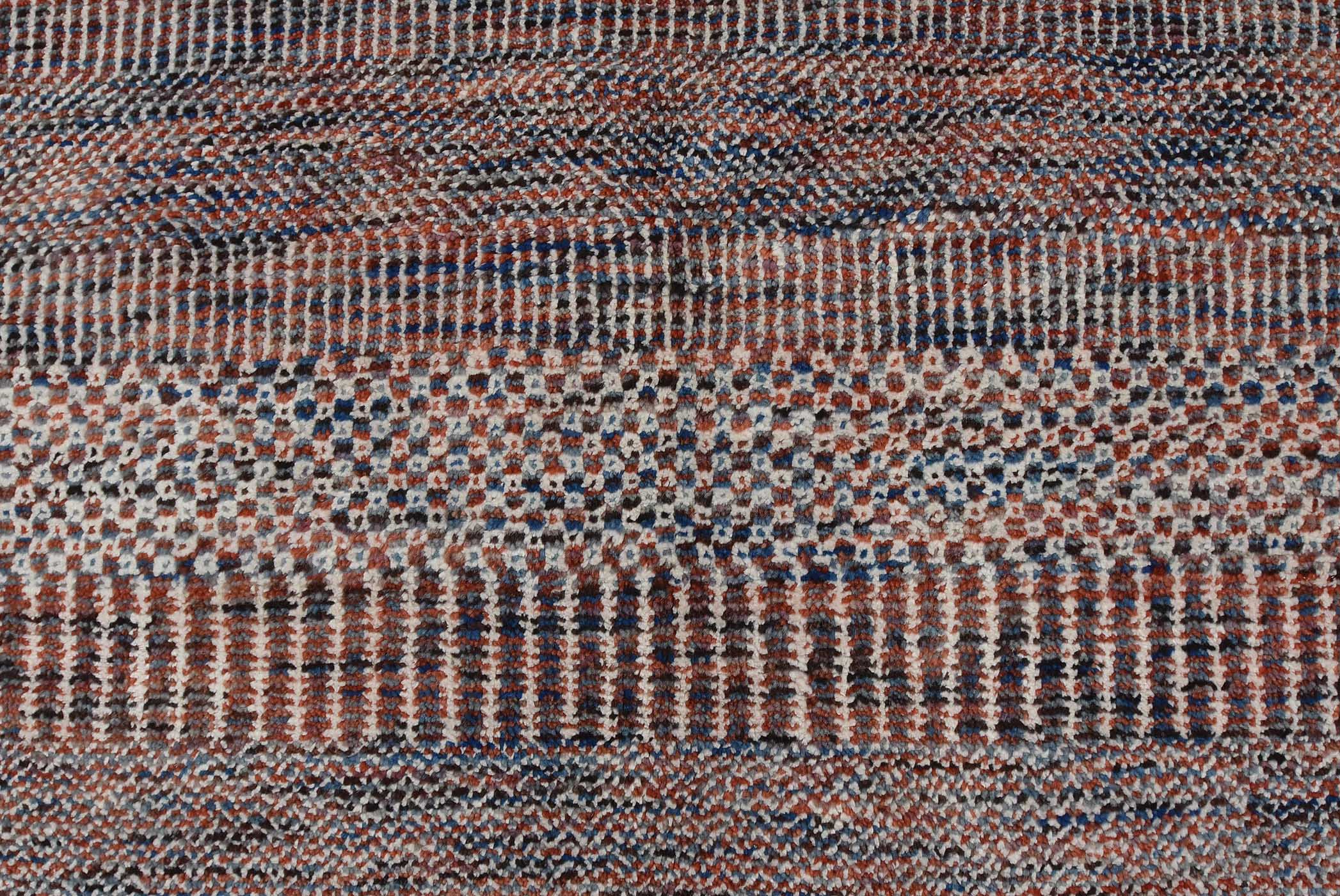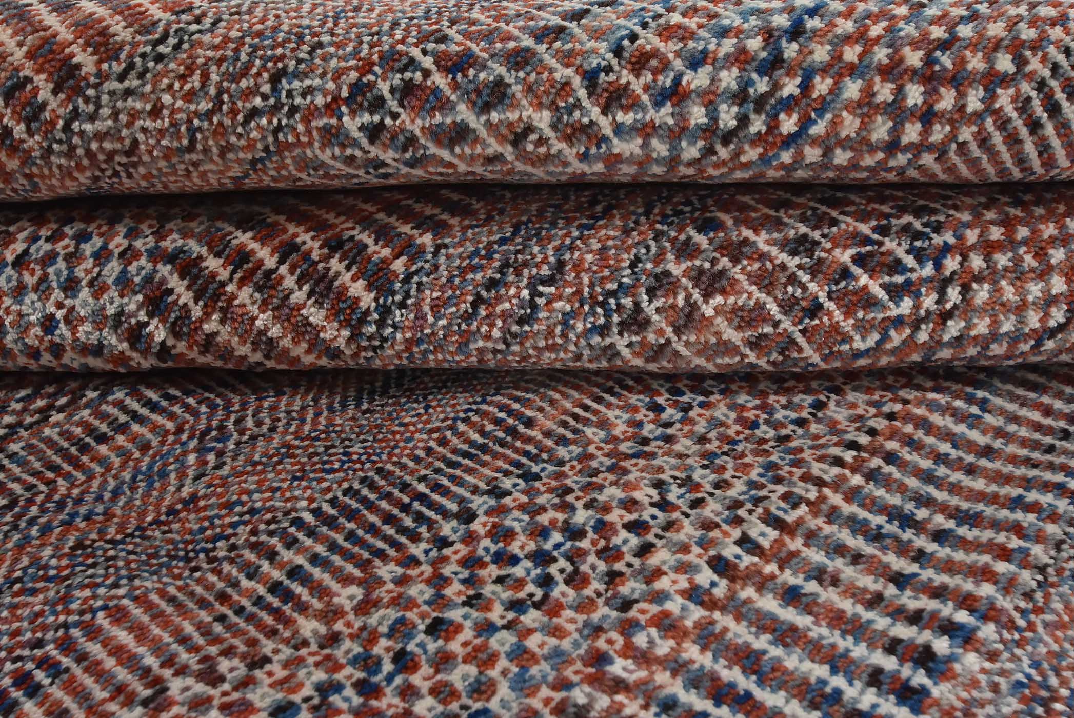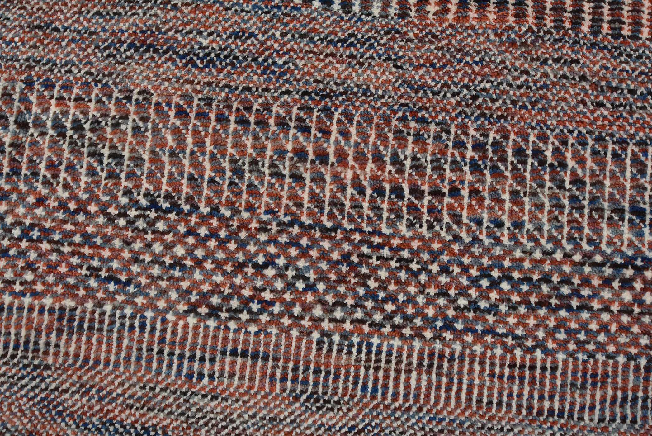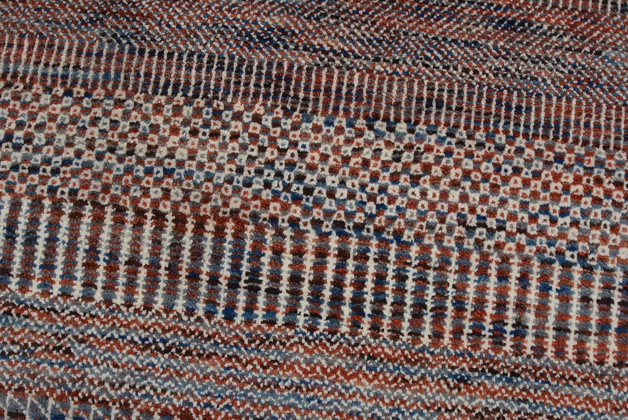 A contemporary rug hand-knotted with an all-wool pile on a cotton foundation. This finely woven area rug features small-scale geometric patterns in a variety of colors. It is new and in excellent condition.