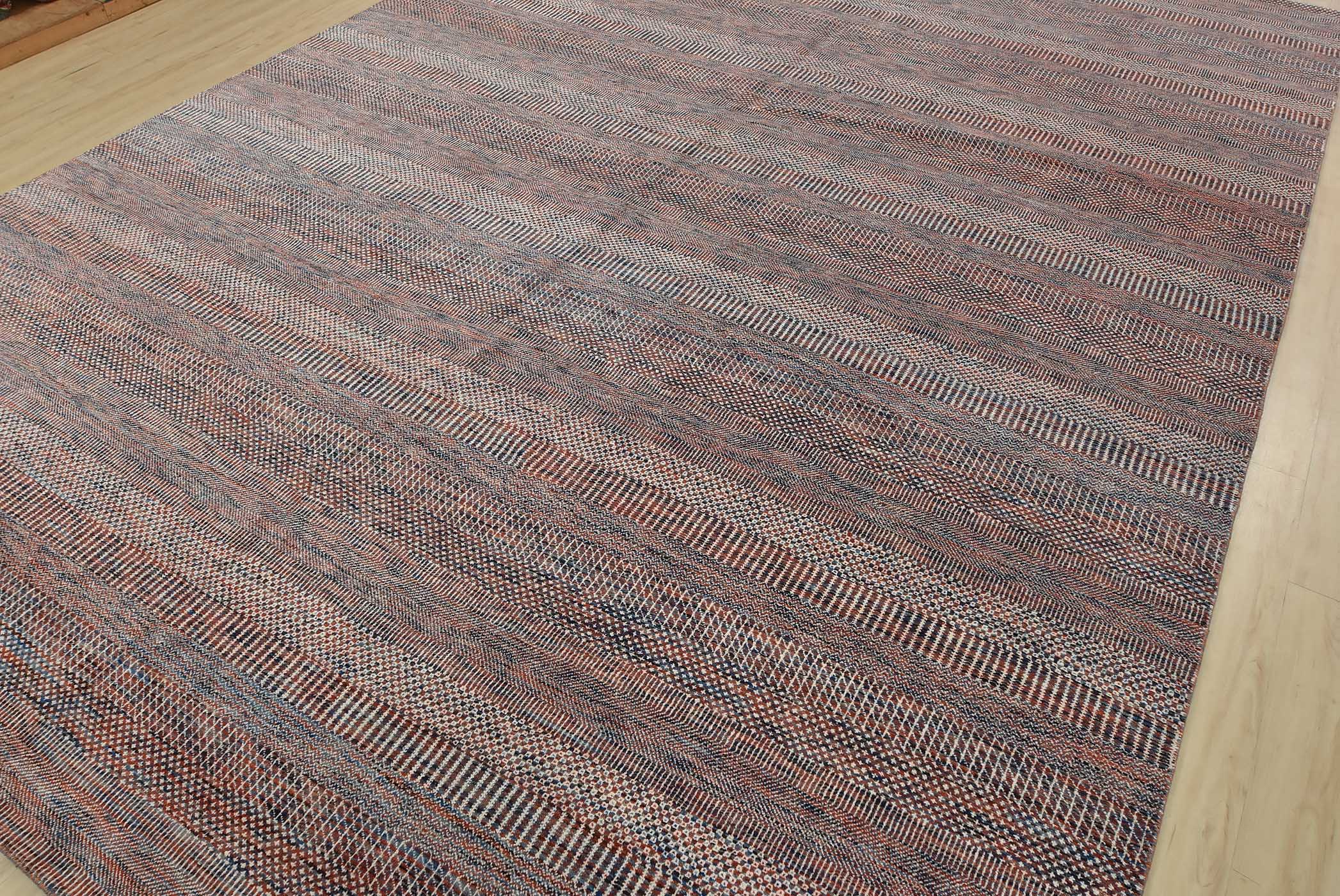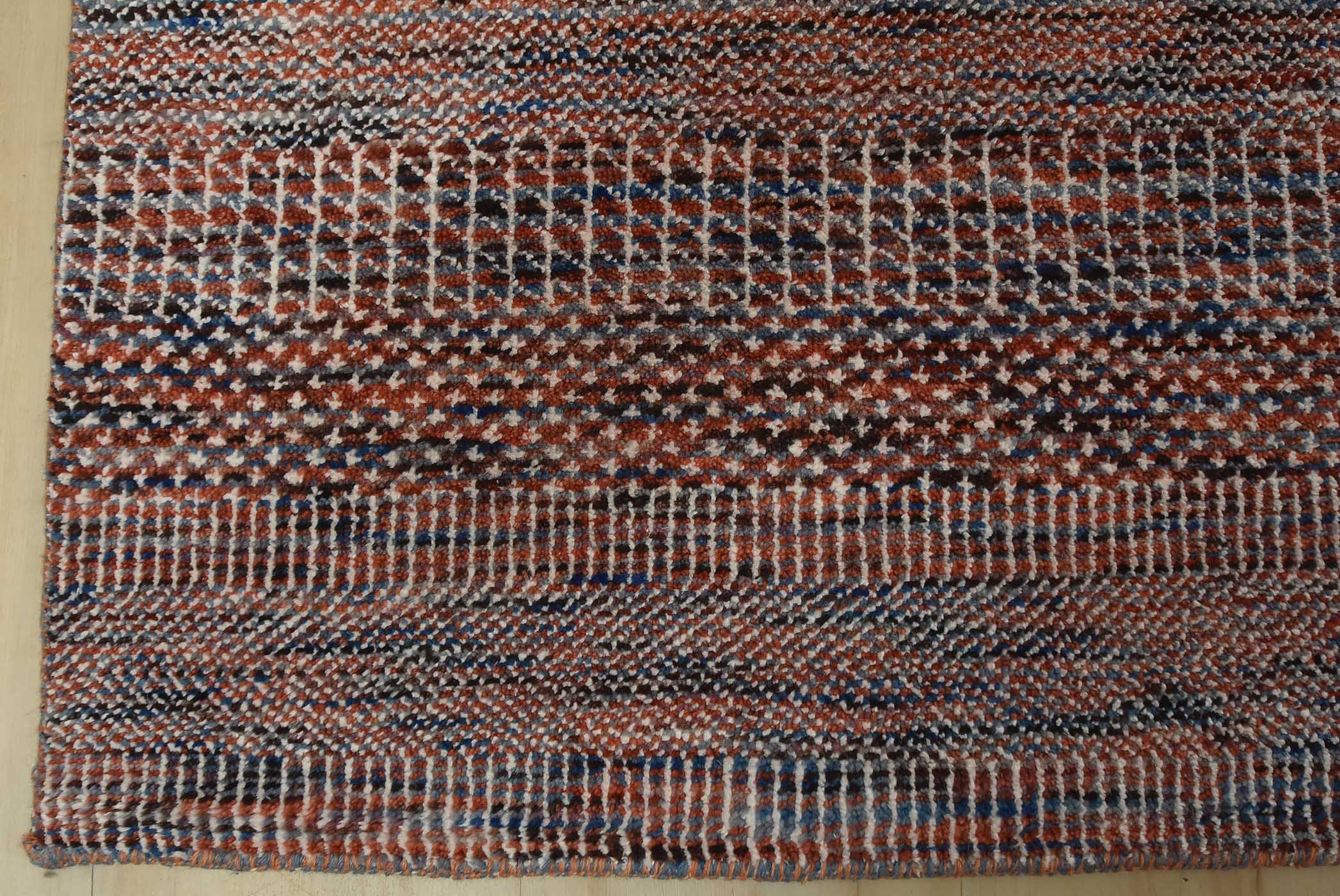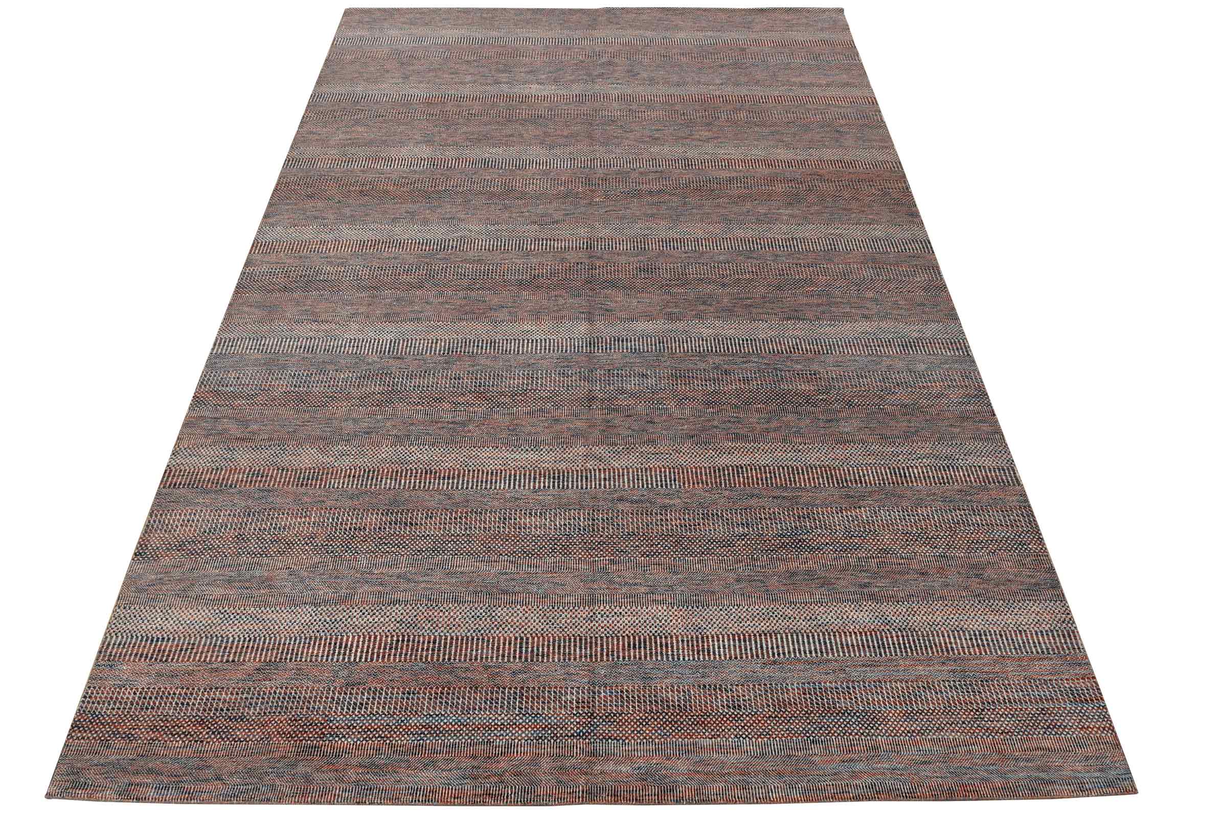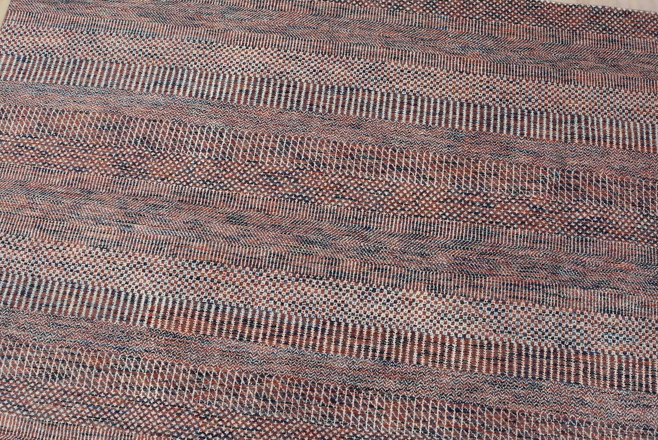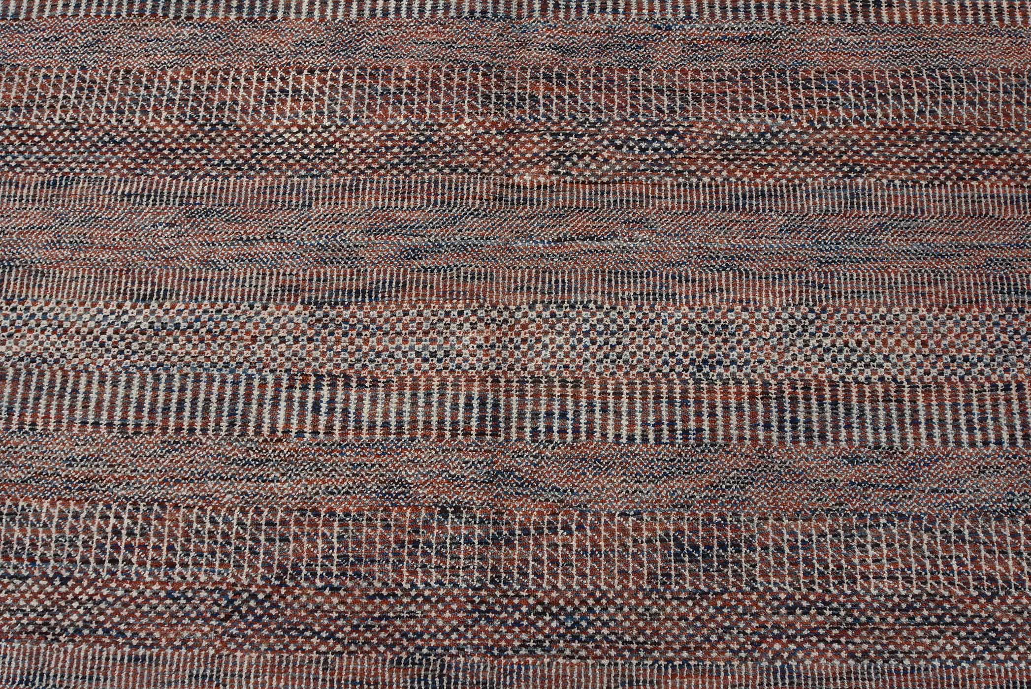 A contemporary rug hand-knotted with an all-wool pile on a cotton foundation. This finely woven area rug features small-scale geometric patterns in a variety of colors. It is new and in excellent condition.