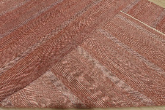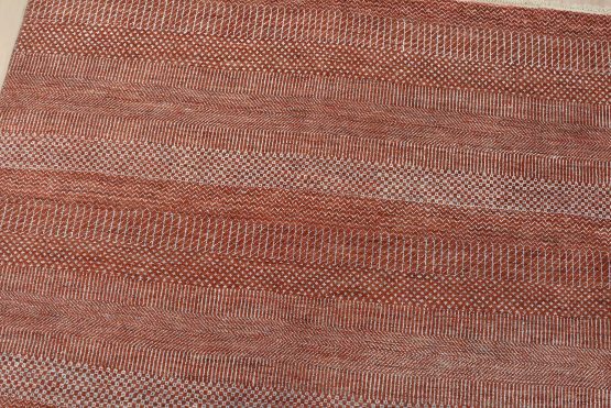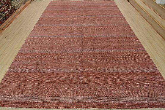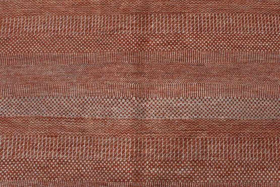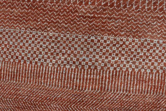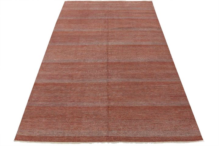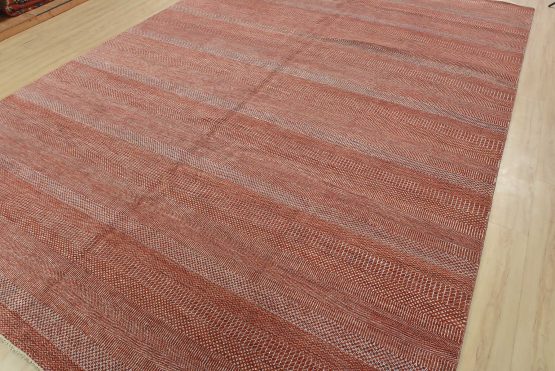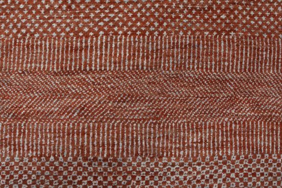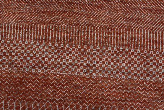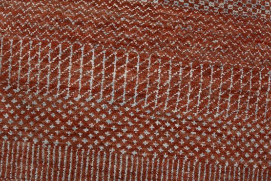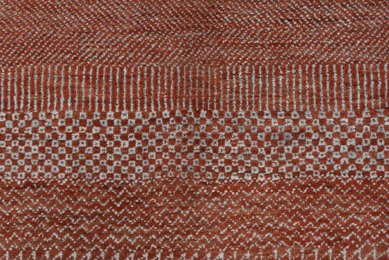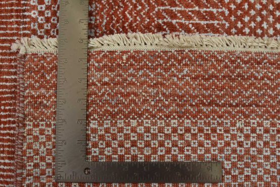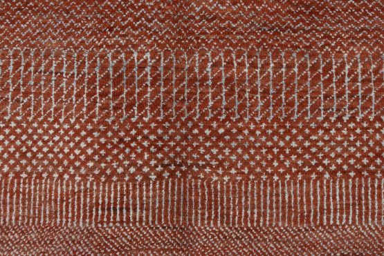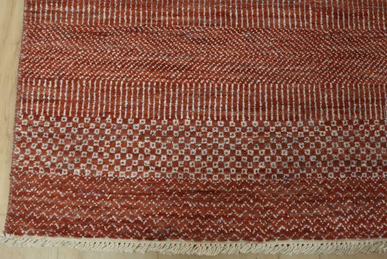 A contemporary area rug hand-knotted with an all-wool pile on a cotton foundation. This finely woven oriental rug features intricate geometric patterns set against a red background. It is new and in excellent condition.