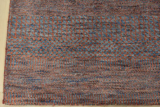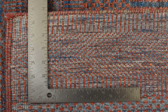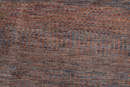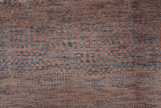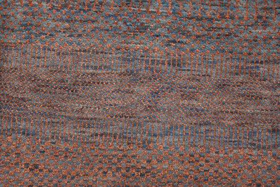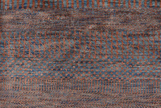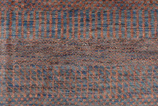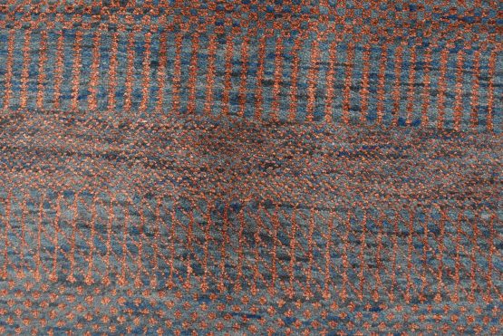 A contemporary area rug hand-knotted with an all-wool pile on a cotton foundation. This finely woven oriental rug features intricate geometric patterns set against a blue background. It is new and in excellent condition.
