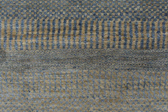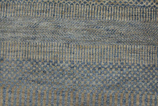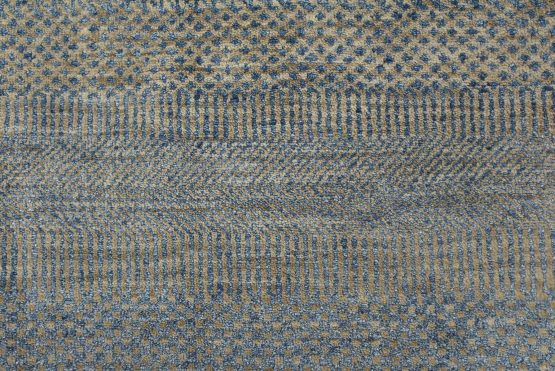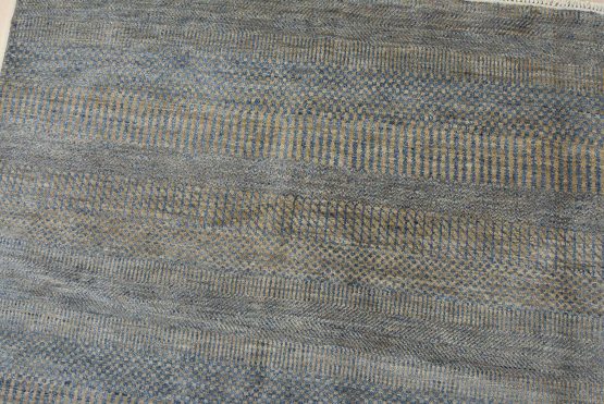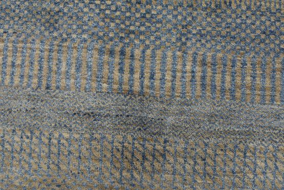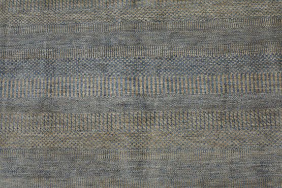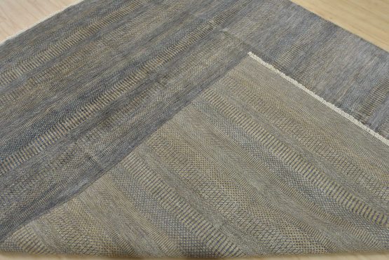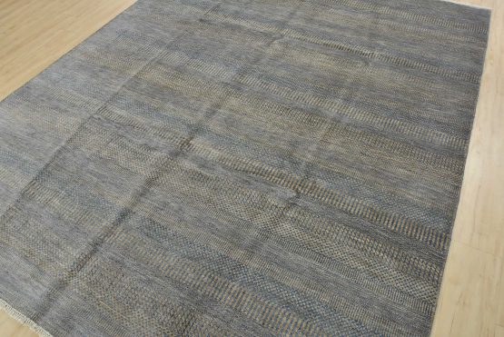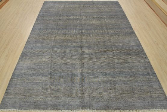 A contemporary area rug hand-knotted with an all-wool pile on a cotton foundation. This finely woven oriental rug features intricate geometric patterns set against a gray background. It is new and in excellent condition.