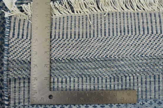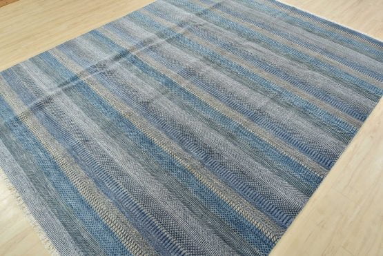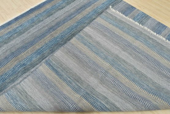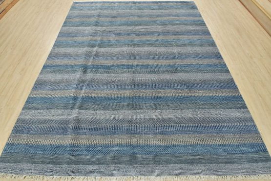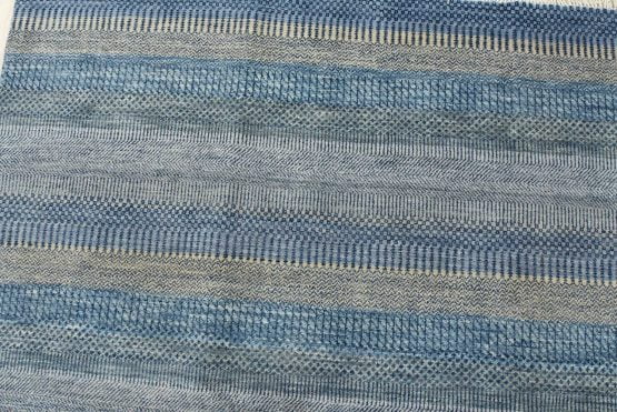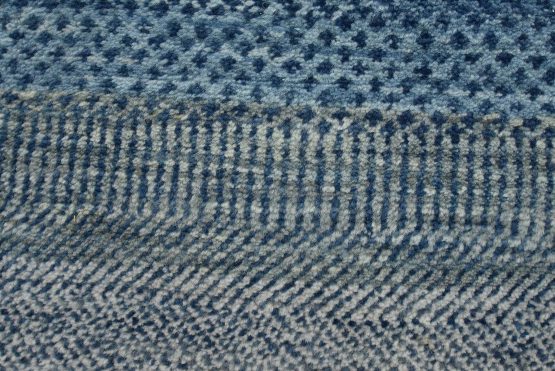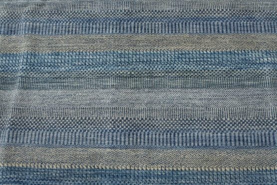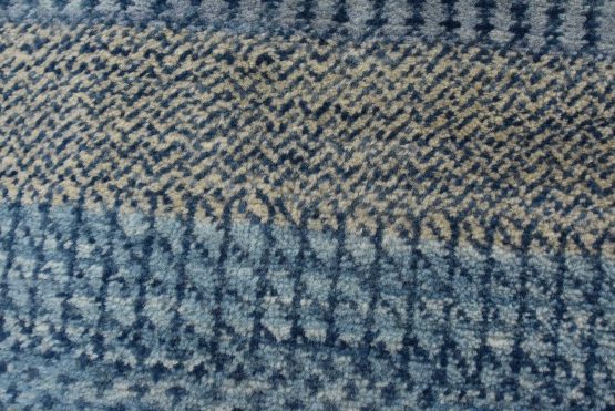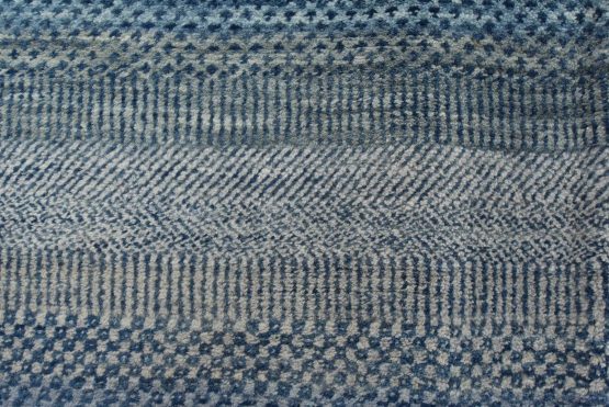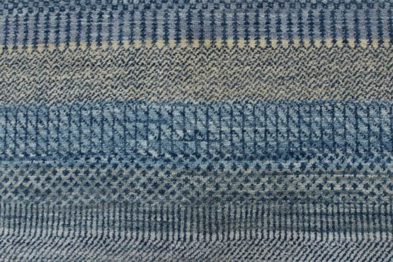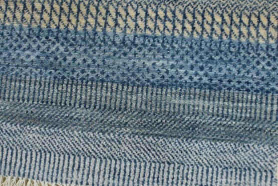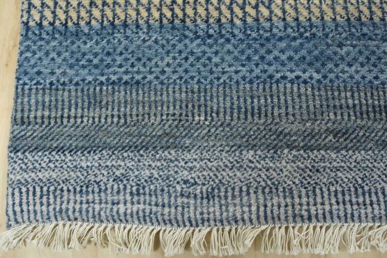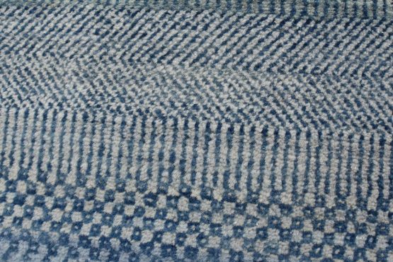 A contemporary rug hand-knotted with an all-wool pile on a cotton foundation. This finely woven area rug features intricate geometric patterns set against a blue background. It is new and in excellent condition.