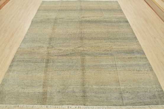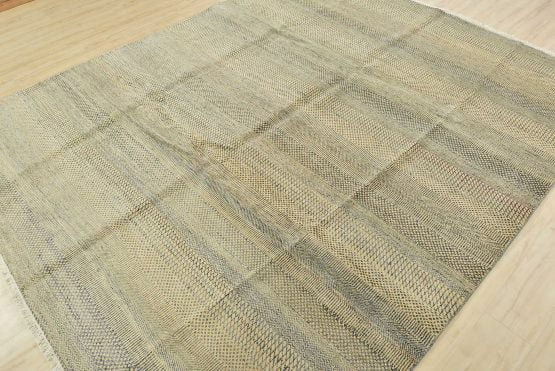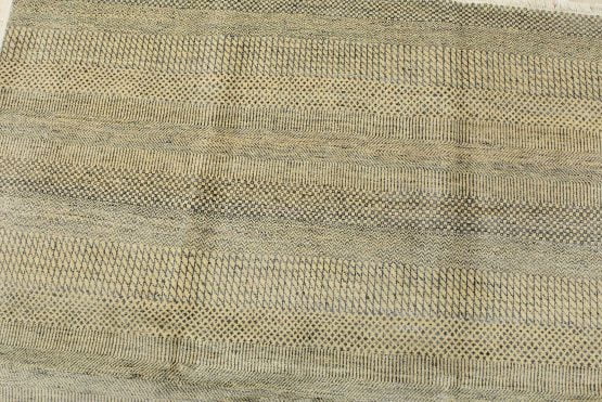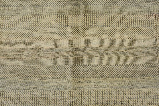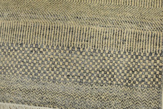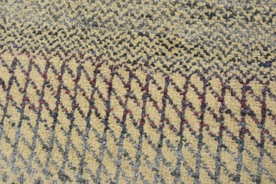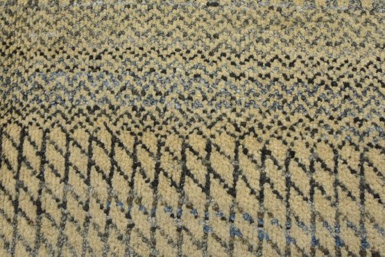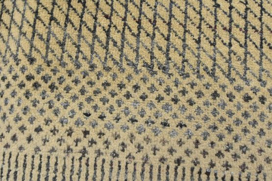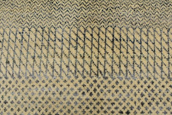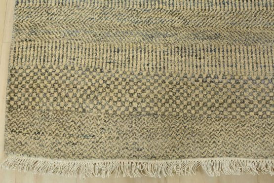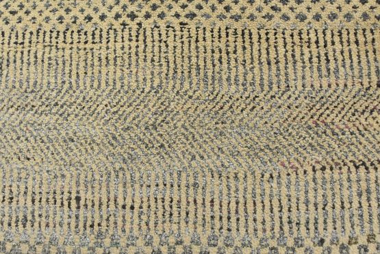 A contemporary area rug hand-knotted with an all-wool pile on a cotton foundation. This finely woven area rug features an all-over small-scale geometric pattern set against a beige background. It is new and in excellent condition.