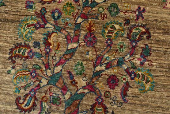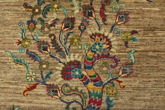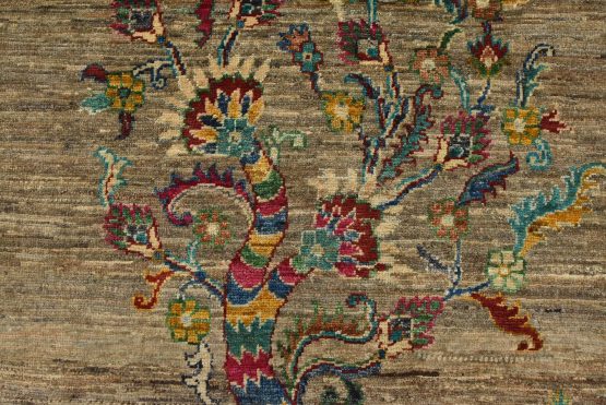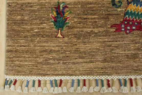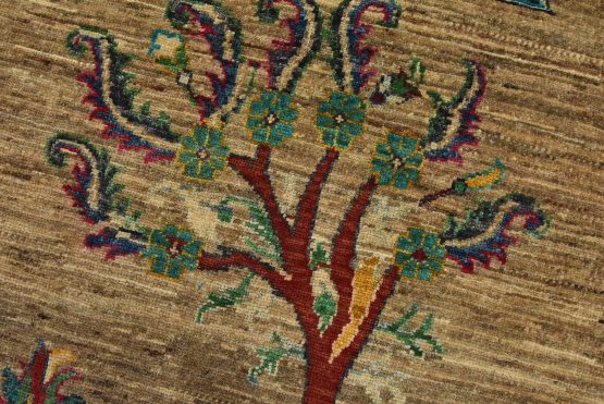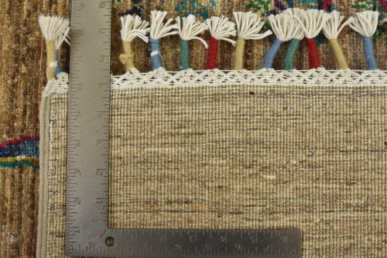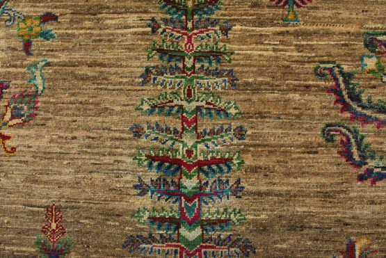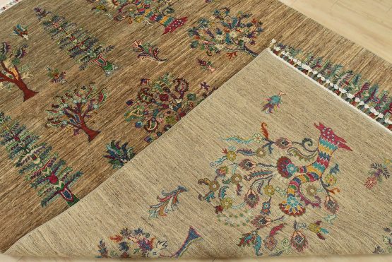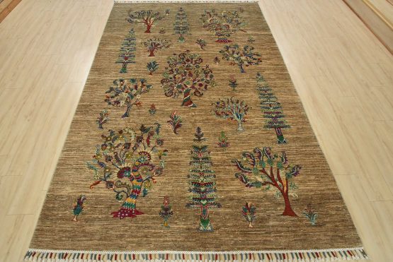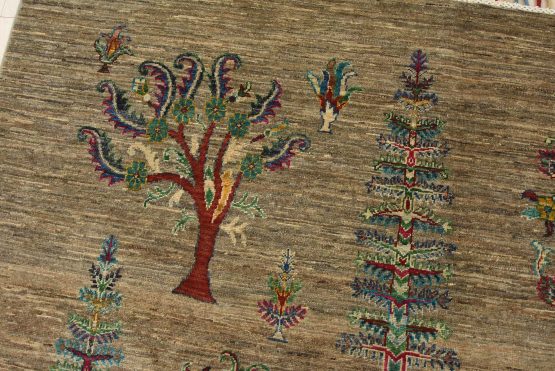A traditional Gabbeh rug hand-knotted with fine wool on a cotton foundation. This oriental rug features various types of trees set against a gray background. It is new and in excellent condition.