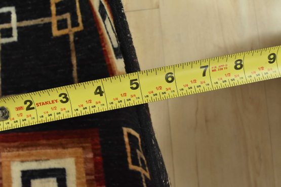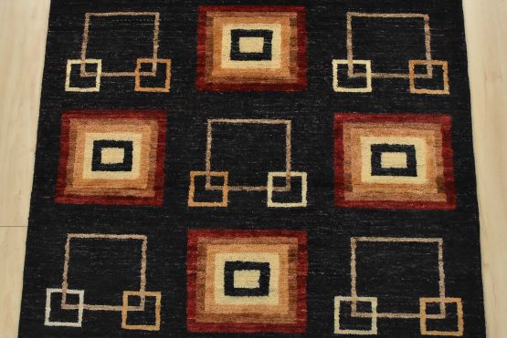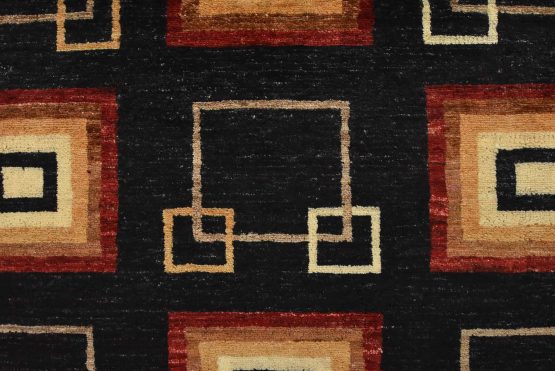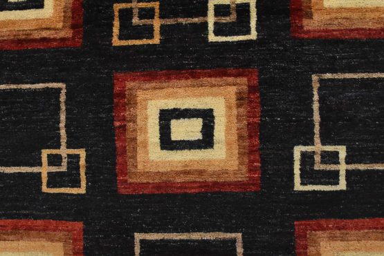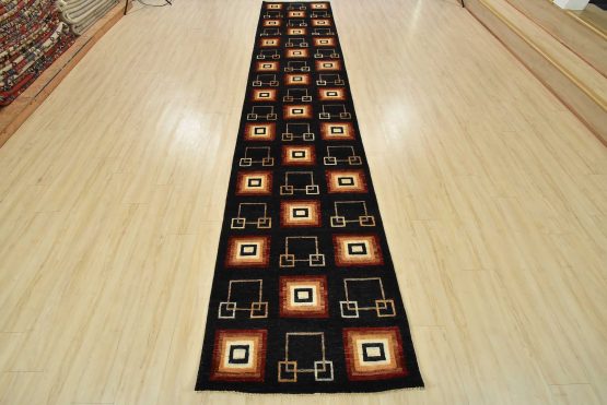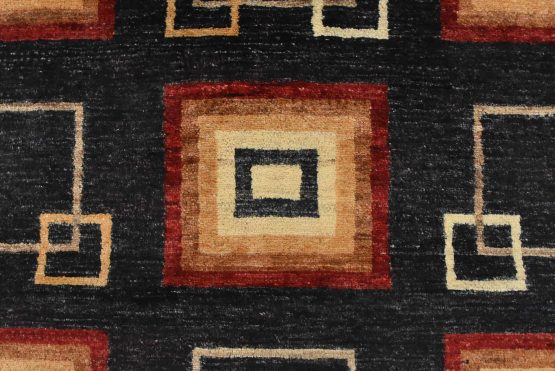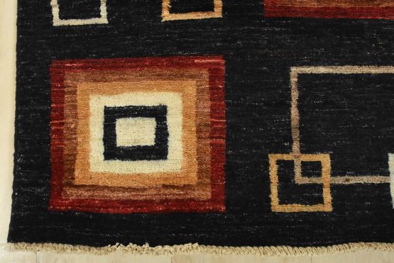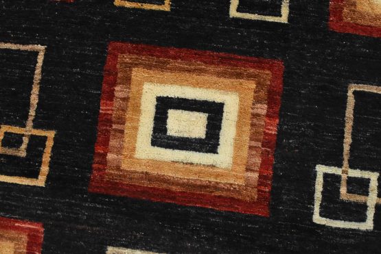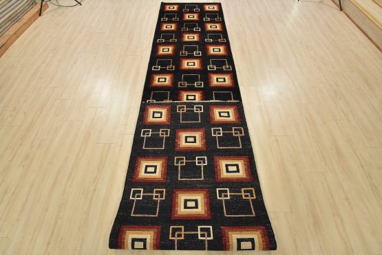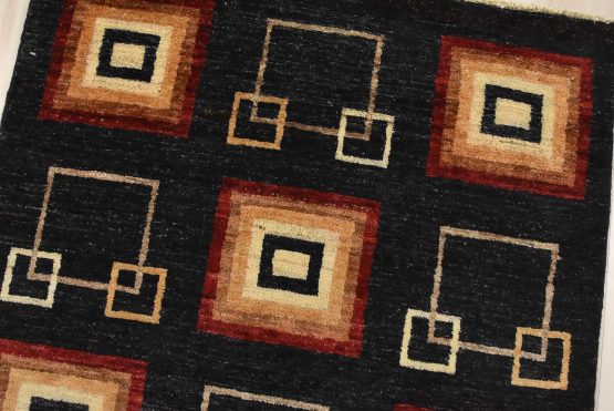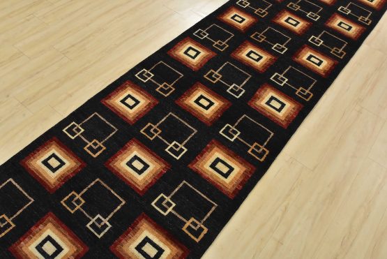 A contemporary Gabbeh runner hand-knotted with fine wool on a cotton foundation. This rug features an all-over pattern of squares set against a black background. It is new and in excellent condition.