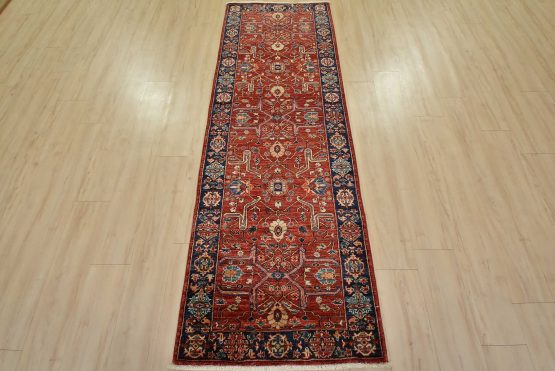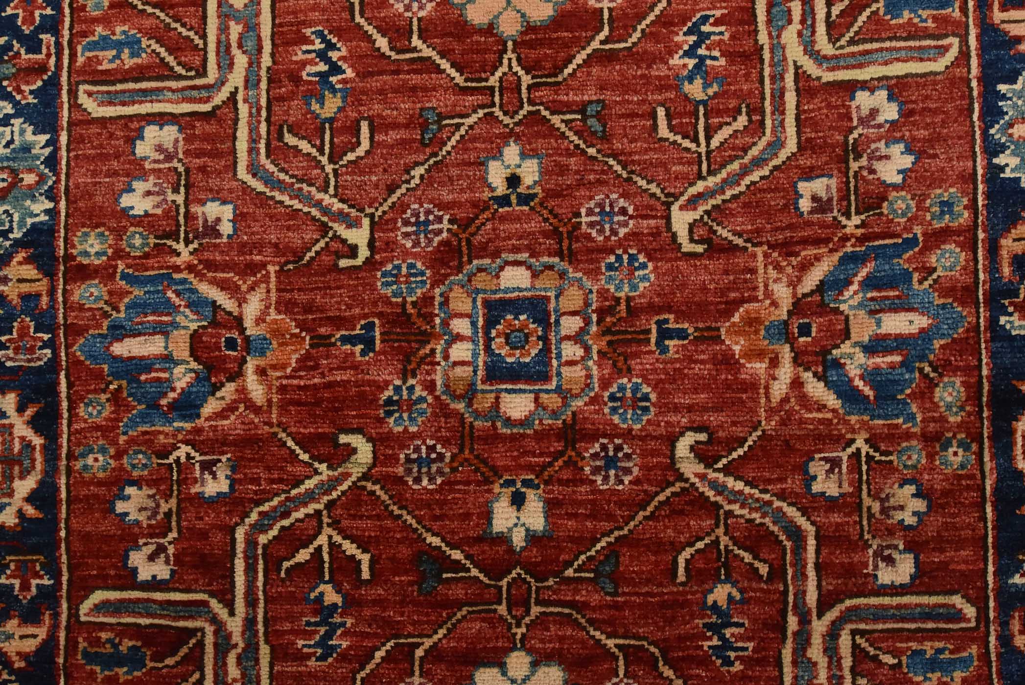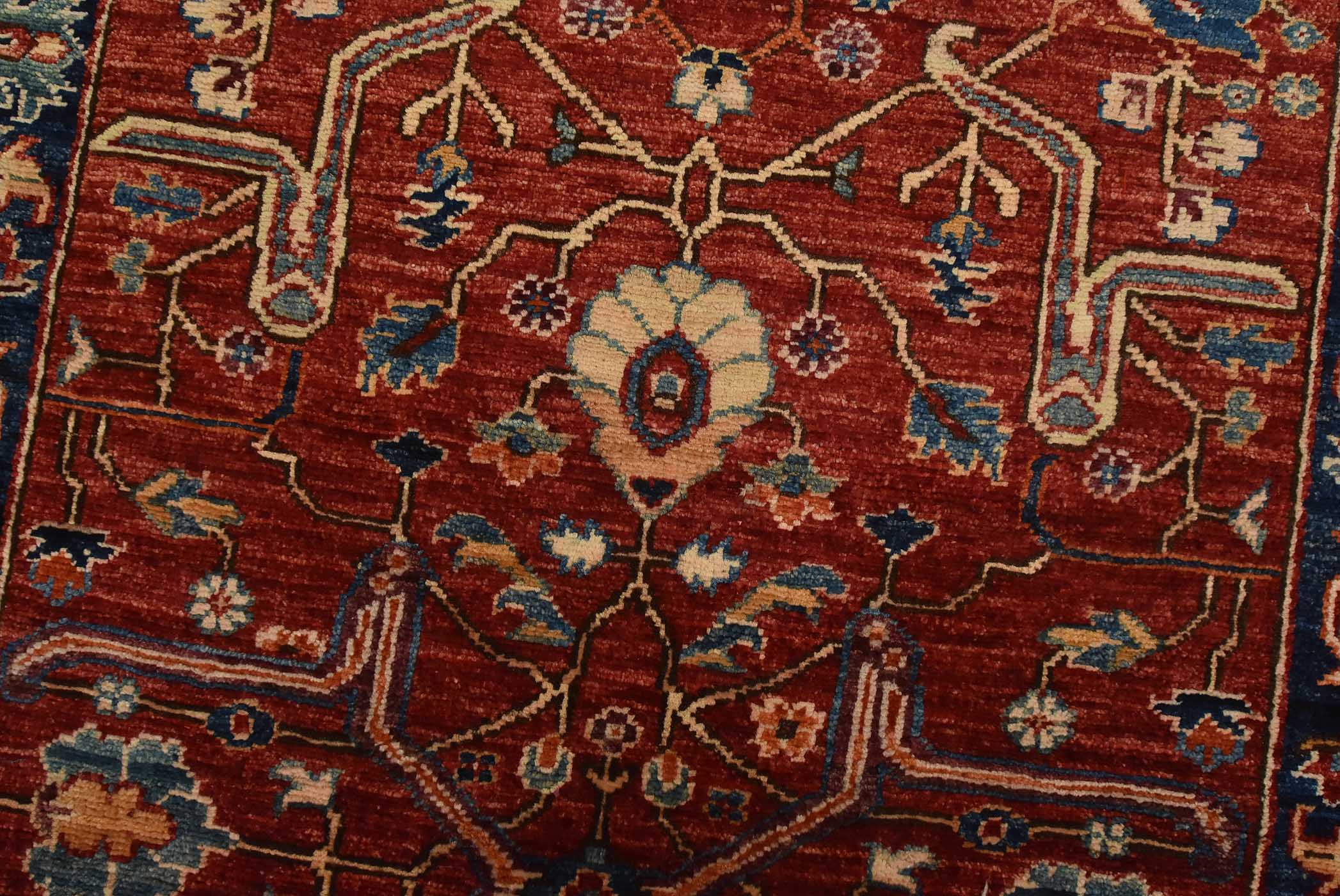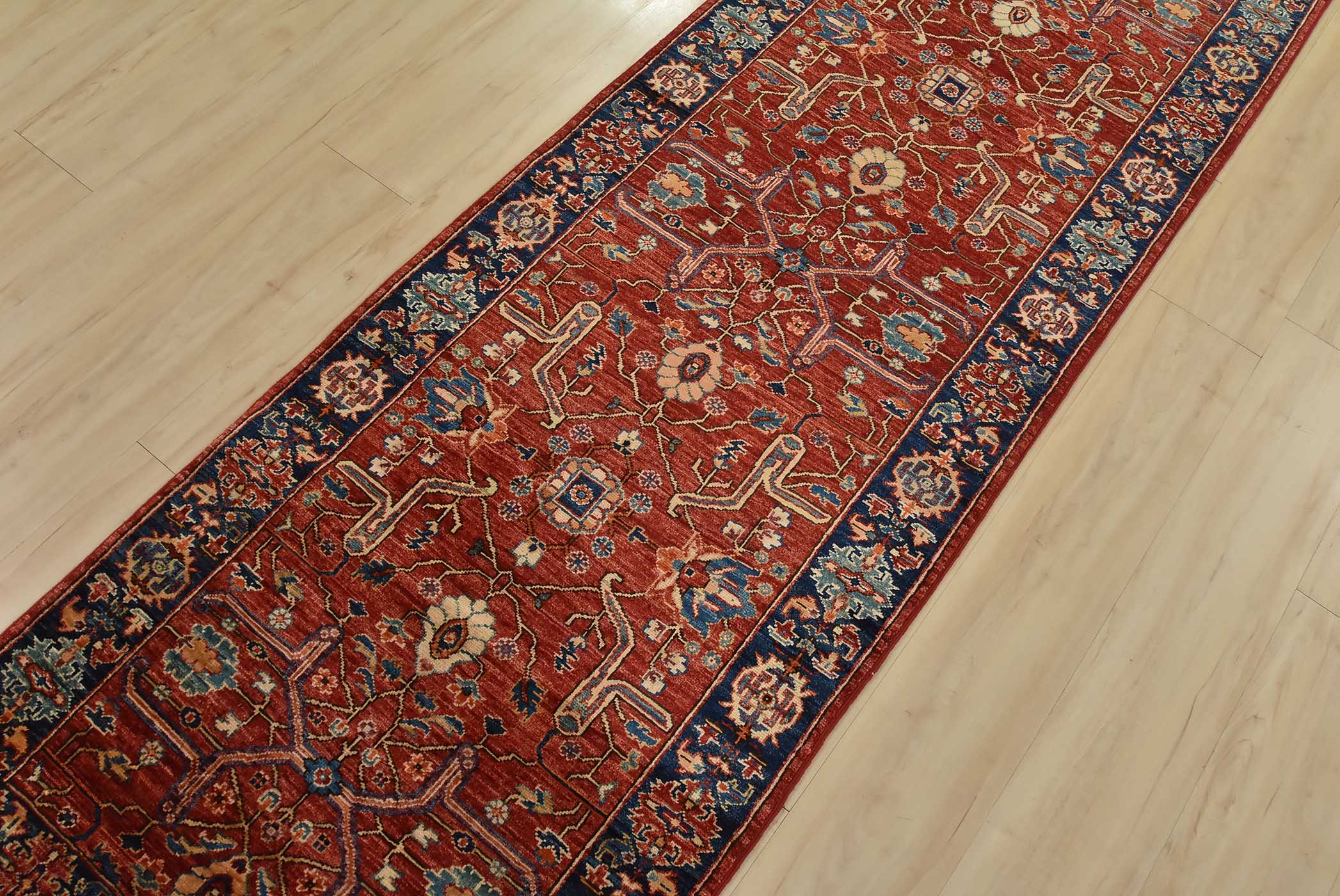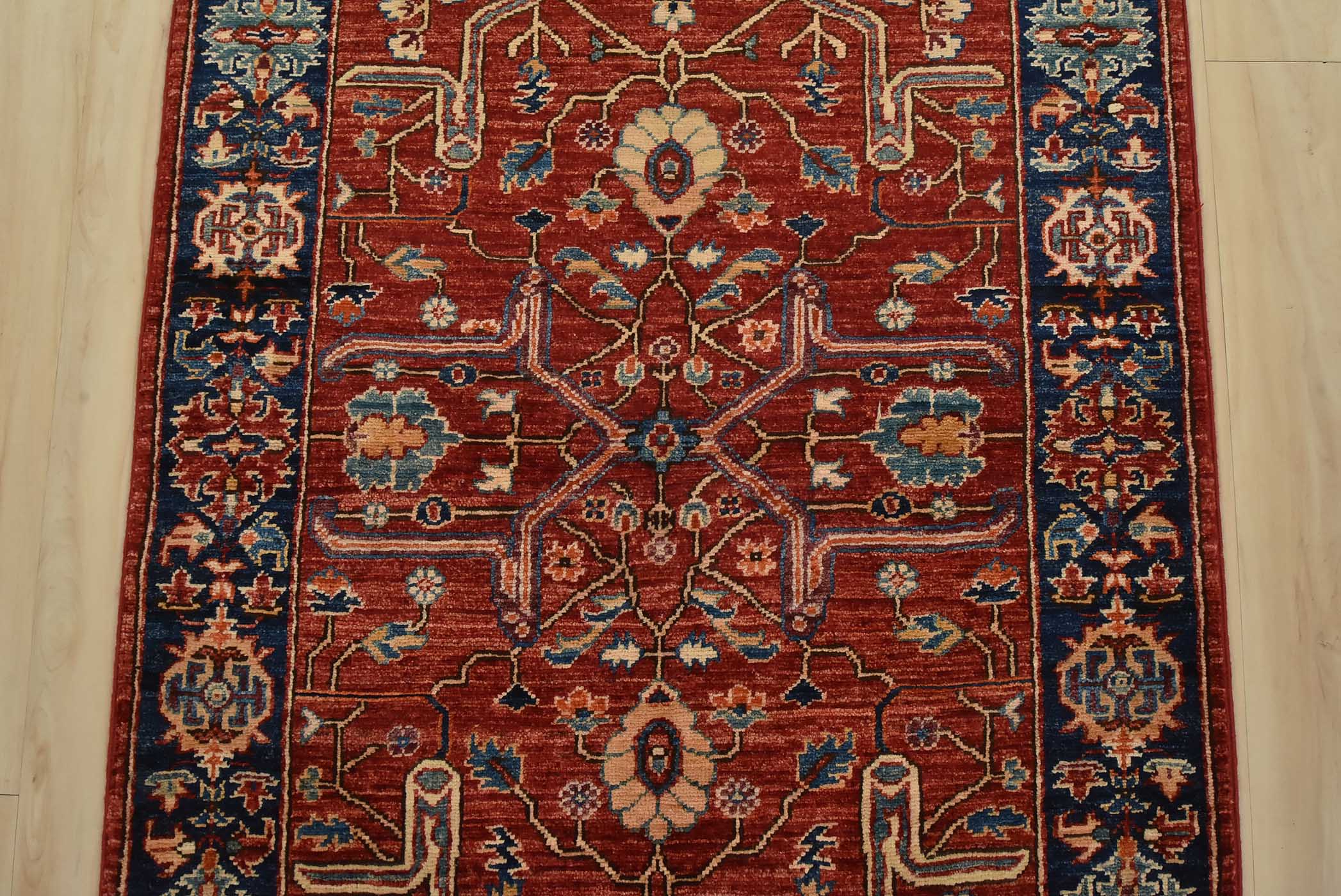 A traditional Heriz runner hand-knotted with fine wool on a cotton foundation. This oriental rug features a botanical design set against a red background. It is new and in excellent condition.
