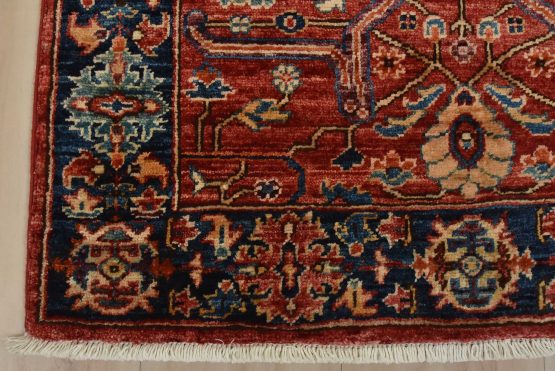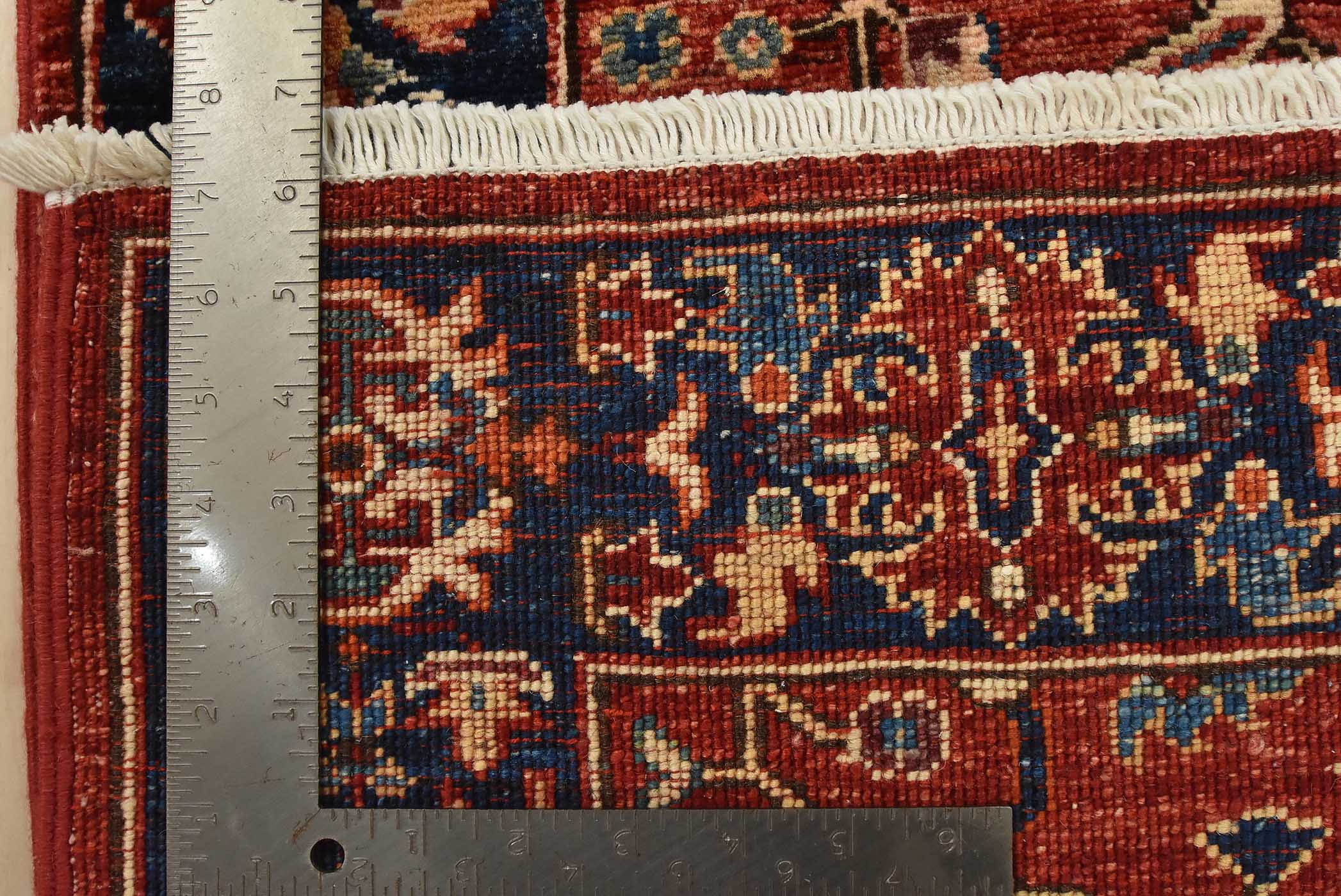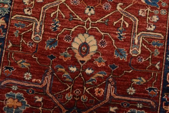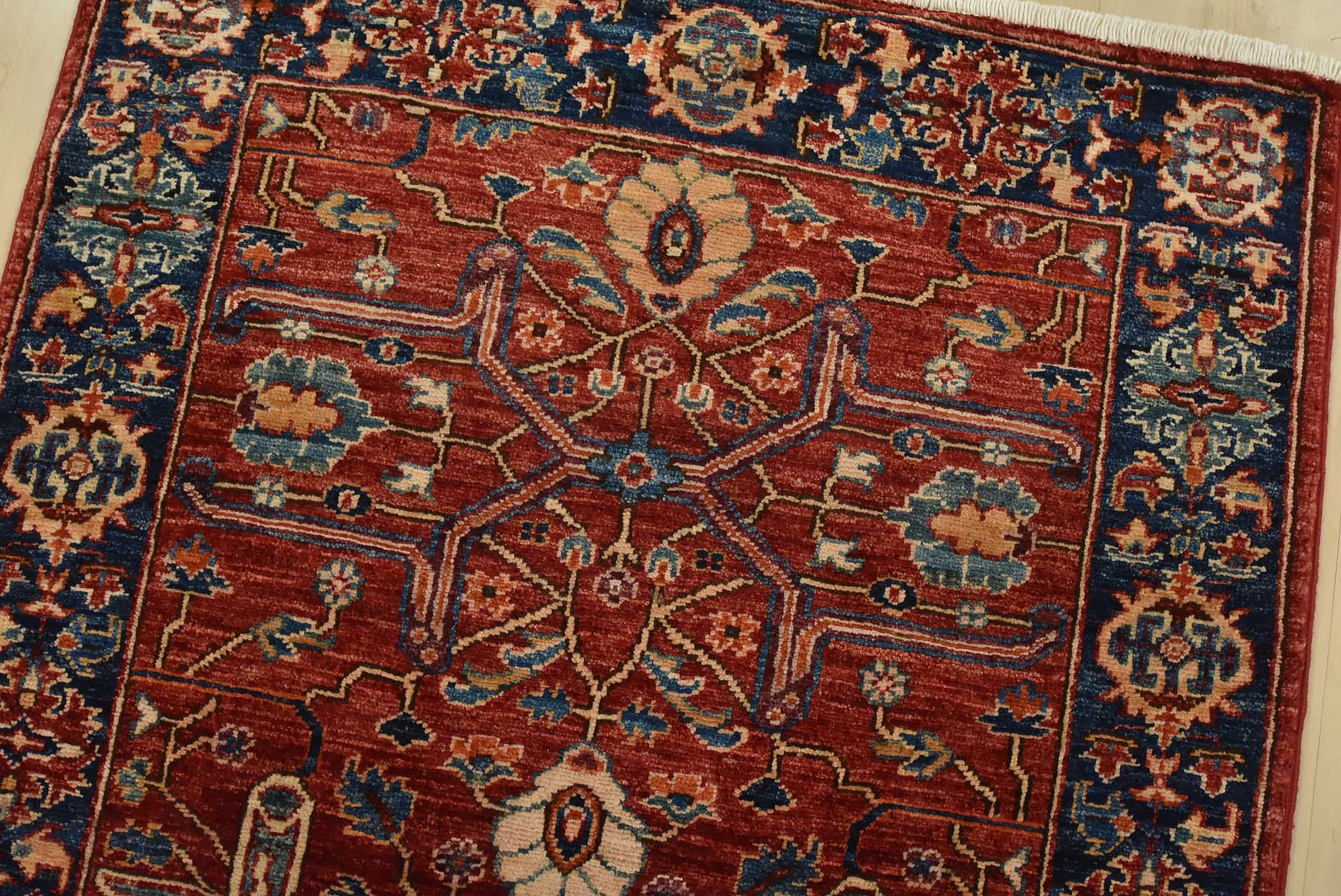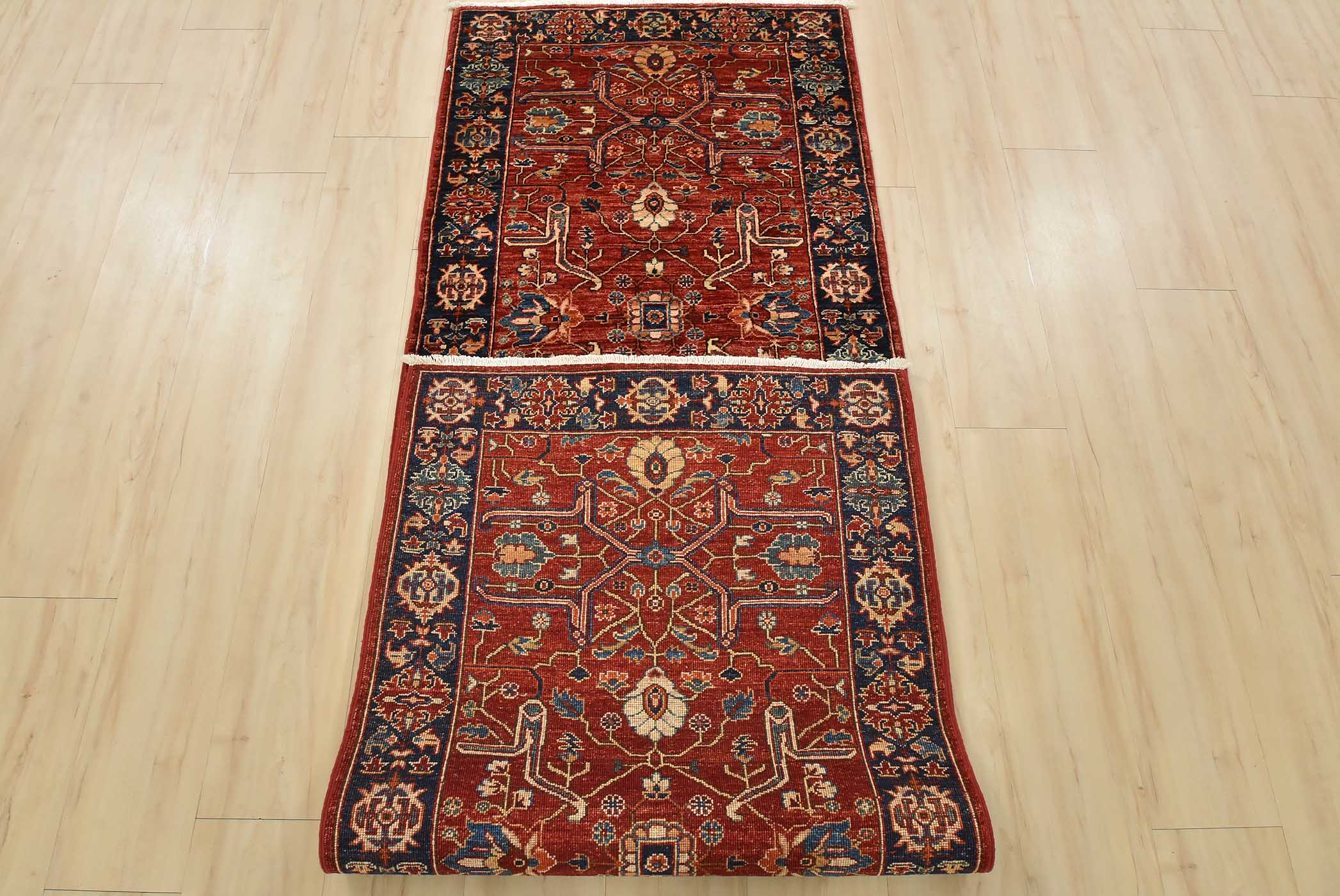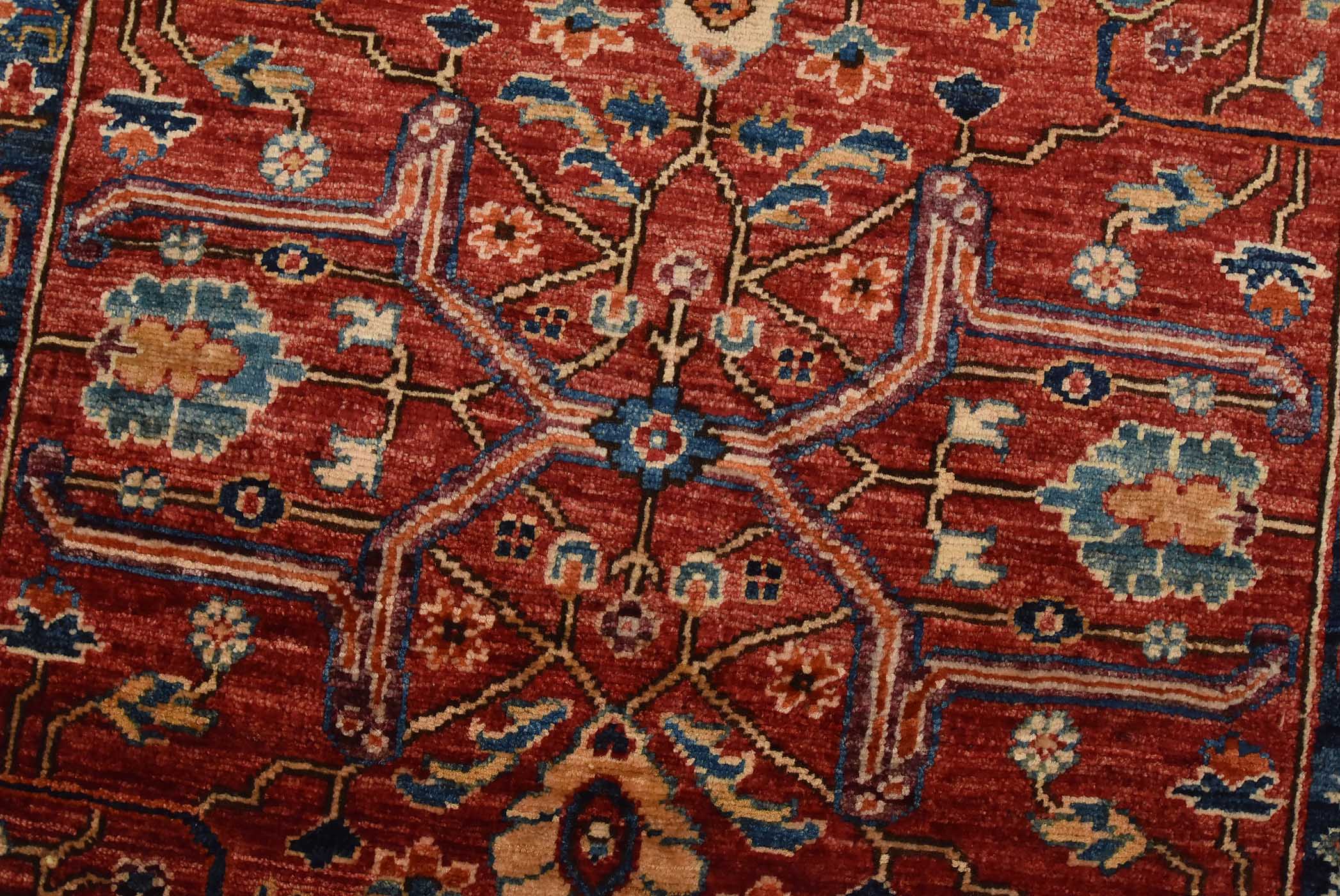 A traditional Heriz runner hand-knotted with fine wool on a cotton foundation. This oriental rug features a botanical design set against a red background. It is new and in excellent condition.