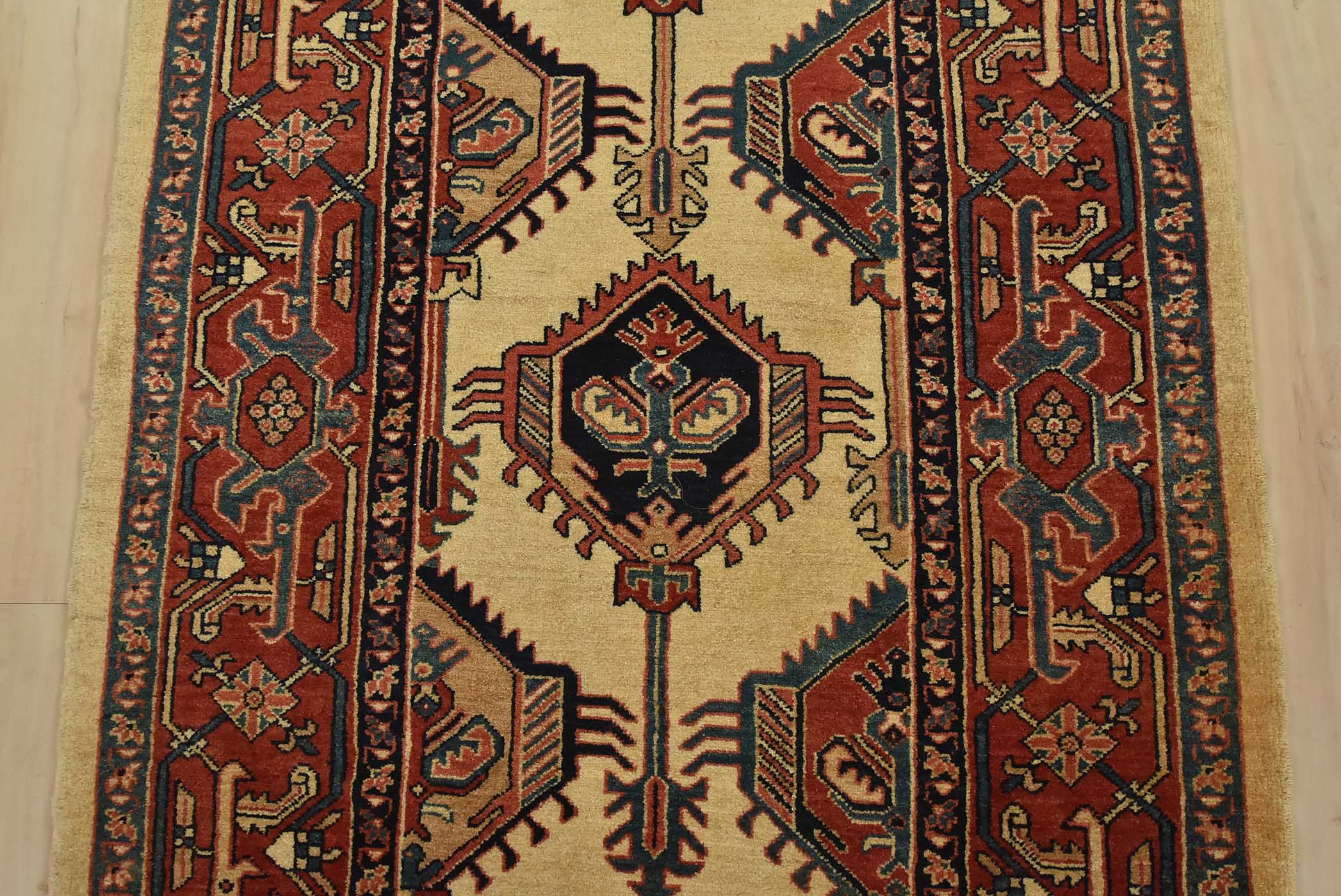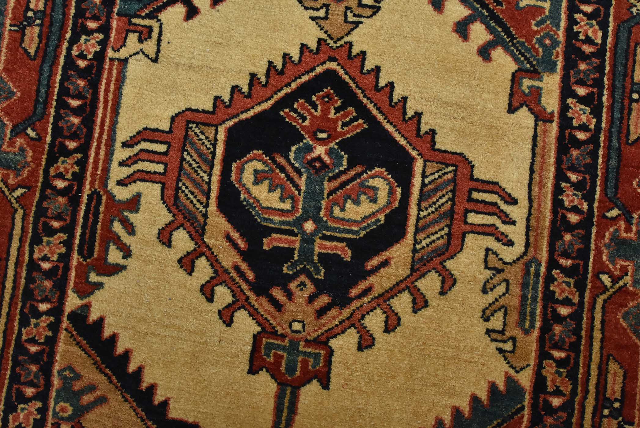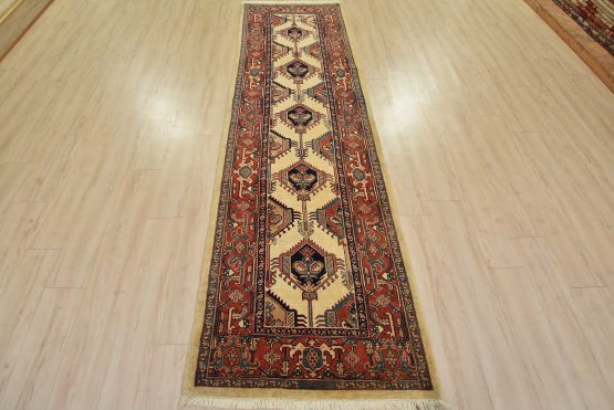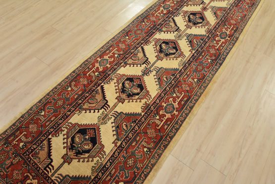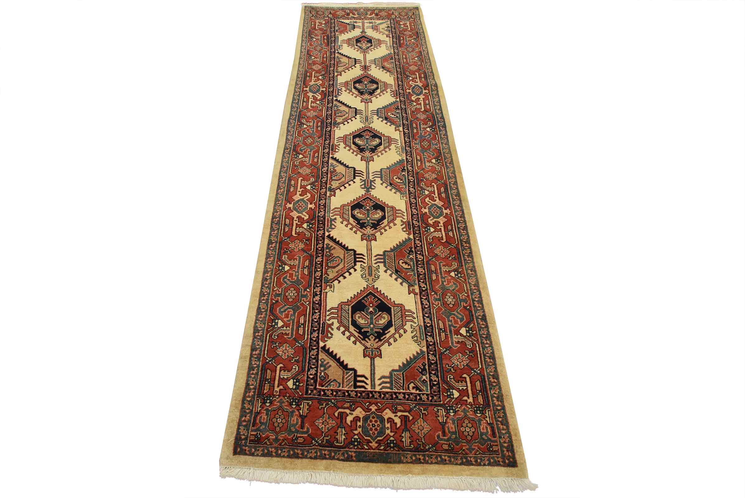 An authentic vintage tribal Heriz runner hand-knotted with fine wool and silk highlights and natural dyes. This intricately woven oriental rug features a row of geometric medallions set against a beige background. It has a full wool pile with no worn areas and is in very good condition.