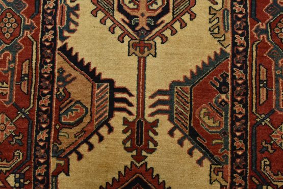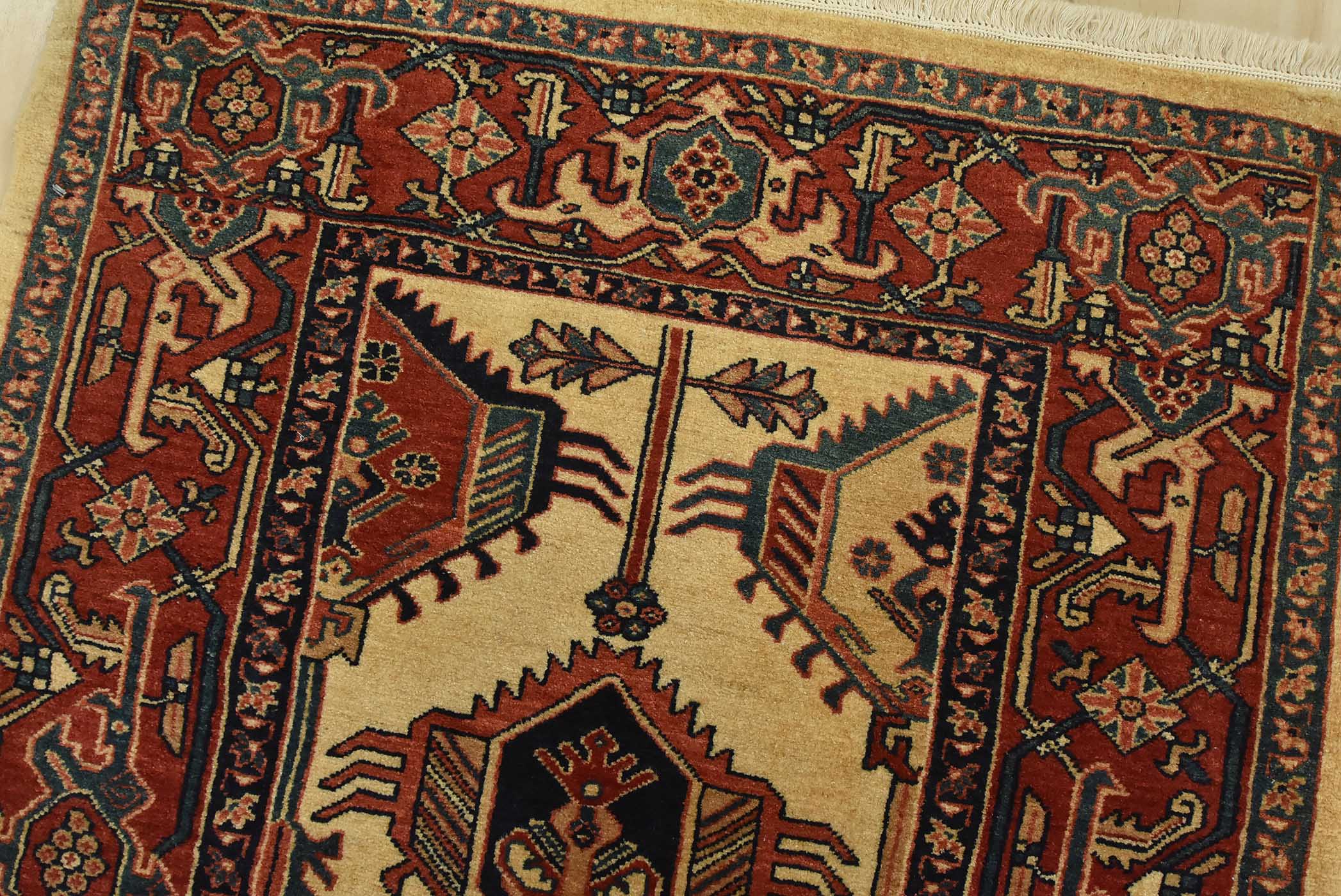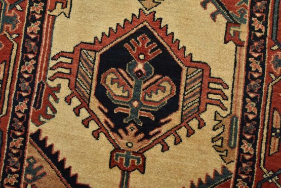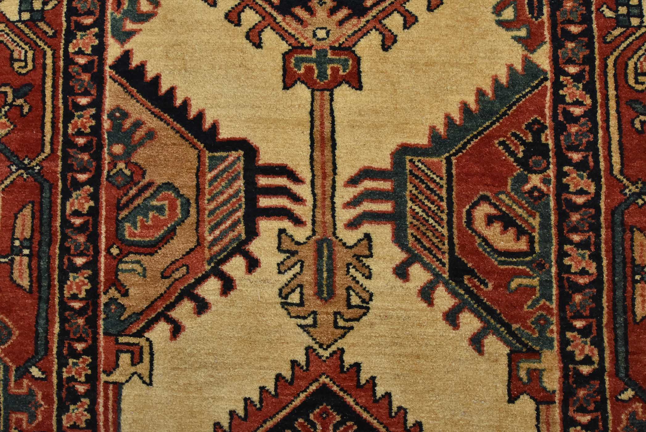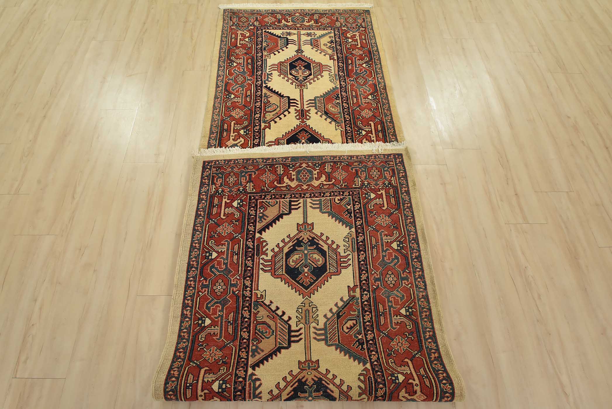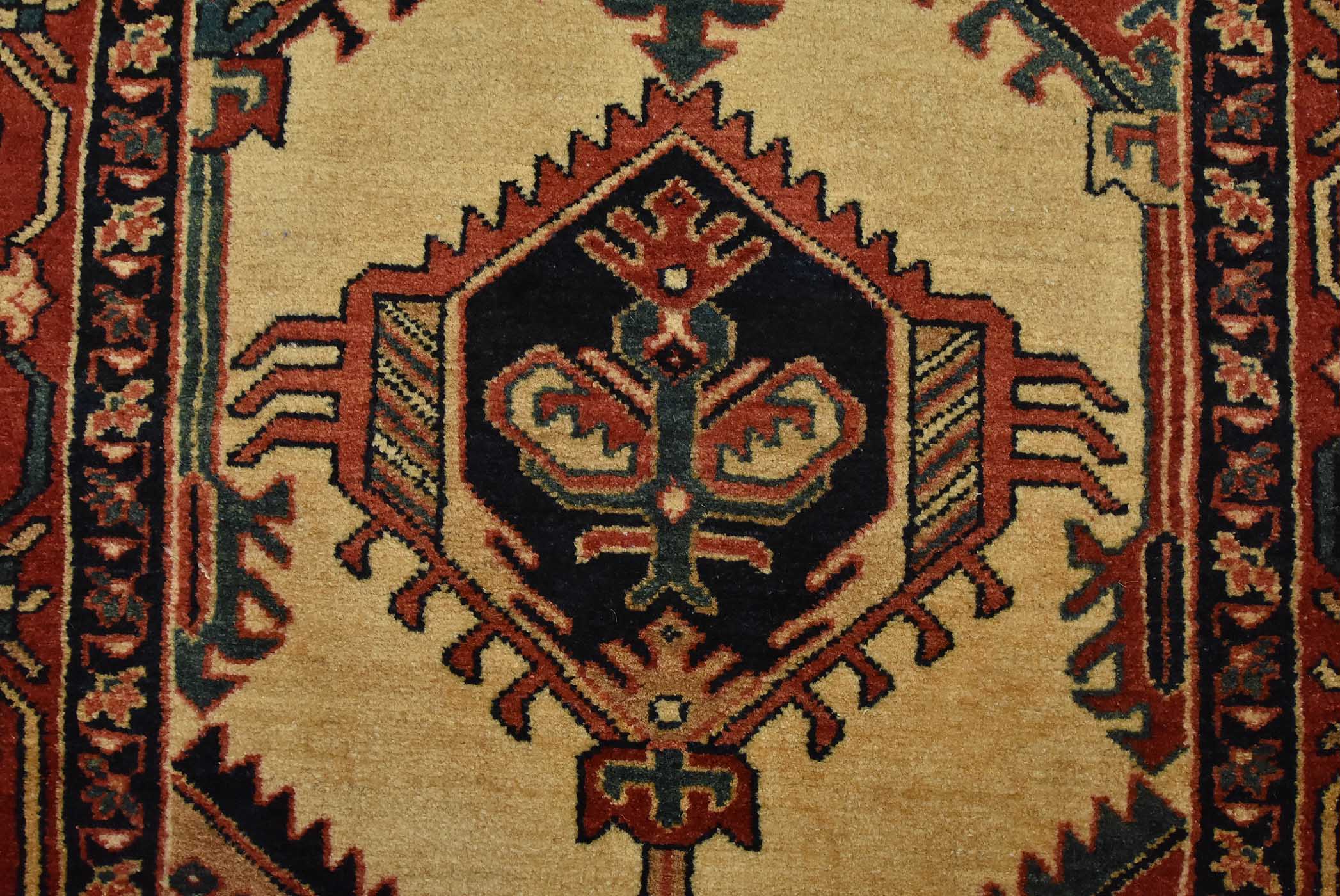 An authentic vintage tribal Heriz runner hand-knotted with fine wool and silk highlights and natural dyes. This intricately woven oriental rug features a row of geometric medallions set against a beige background. It has a full wool pile with no worn areas and is in very good condition.