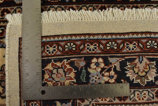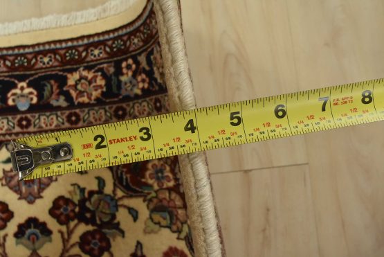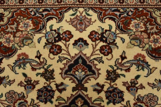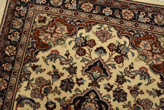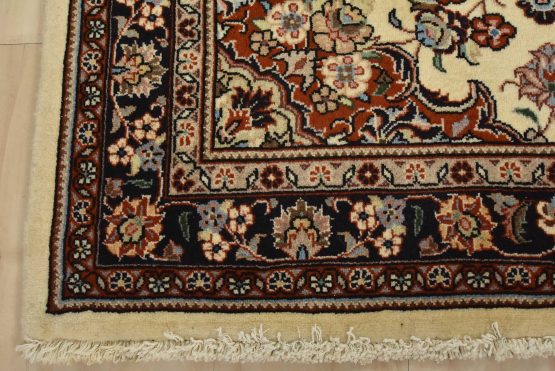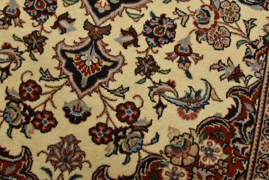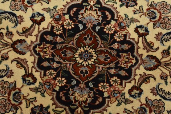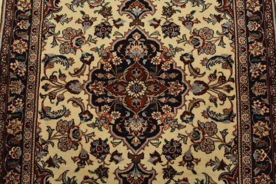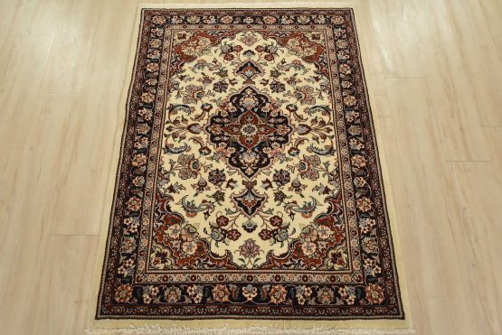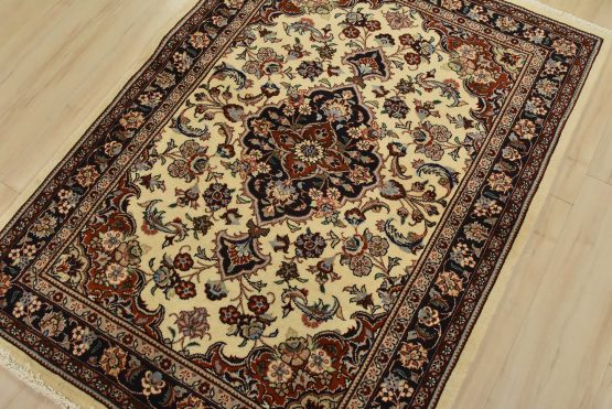 An authentic vintage traditional Kashmar rug hand-knotted with fine wool and natural dyes. This intricately woven rug features a central medallion surrounded by a floral design set against an ivory background. It has a full wool pile with no worm areas and is in very good condition.