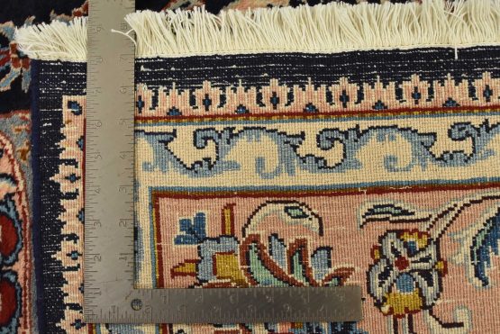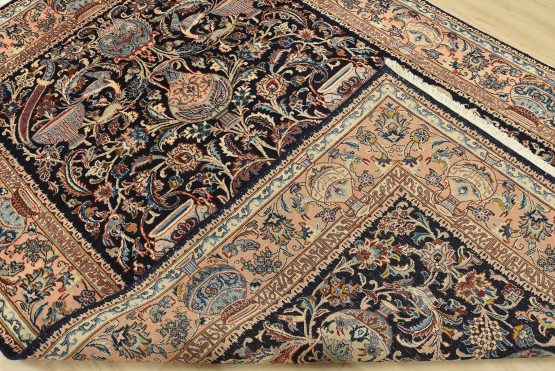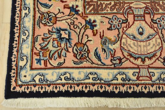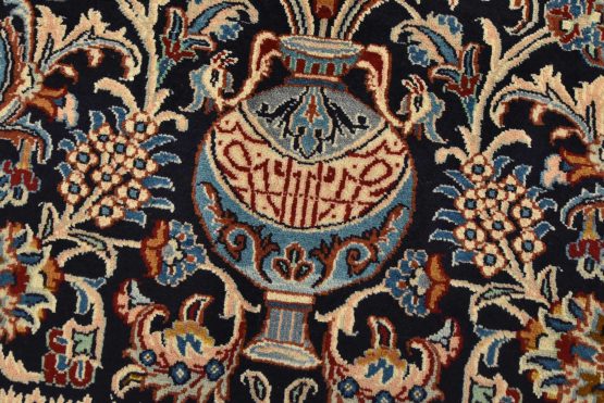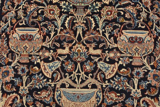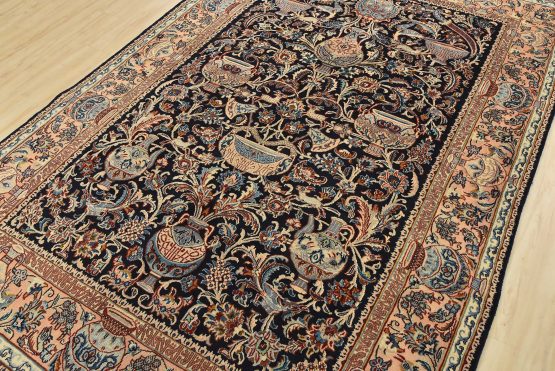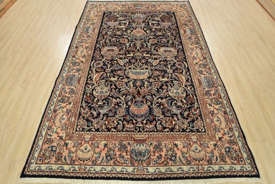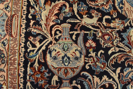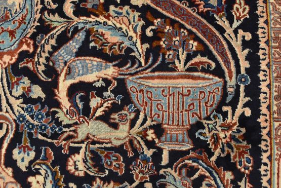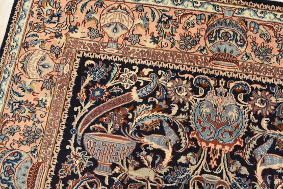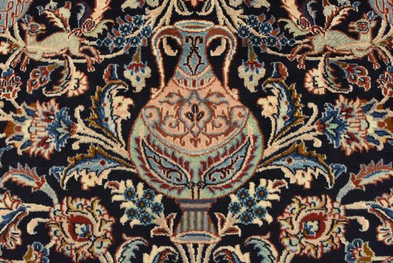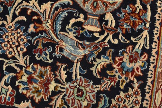 An authentic vintage traditional Kashmar rug hand-knotted with fine wool and natural dyes. This finely woven oriental rug showcases an all-over floral design featuring vases, birds, and animals. It has a full pile with no worn areas and is in very good condition.