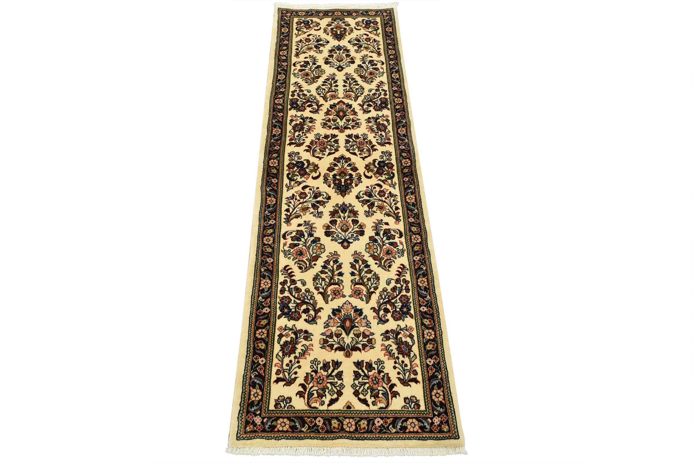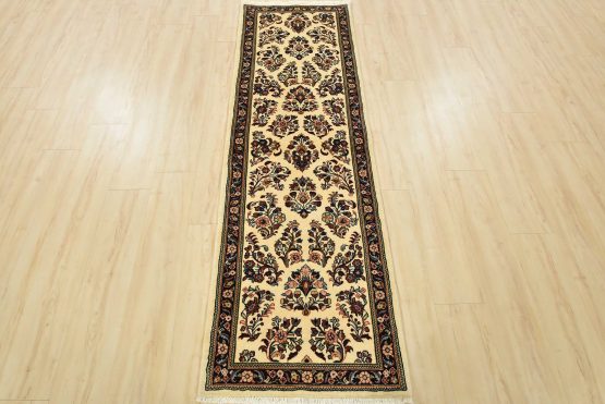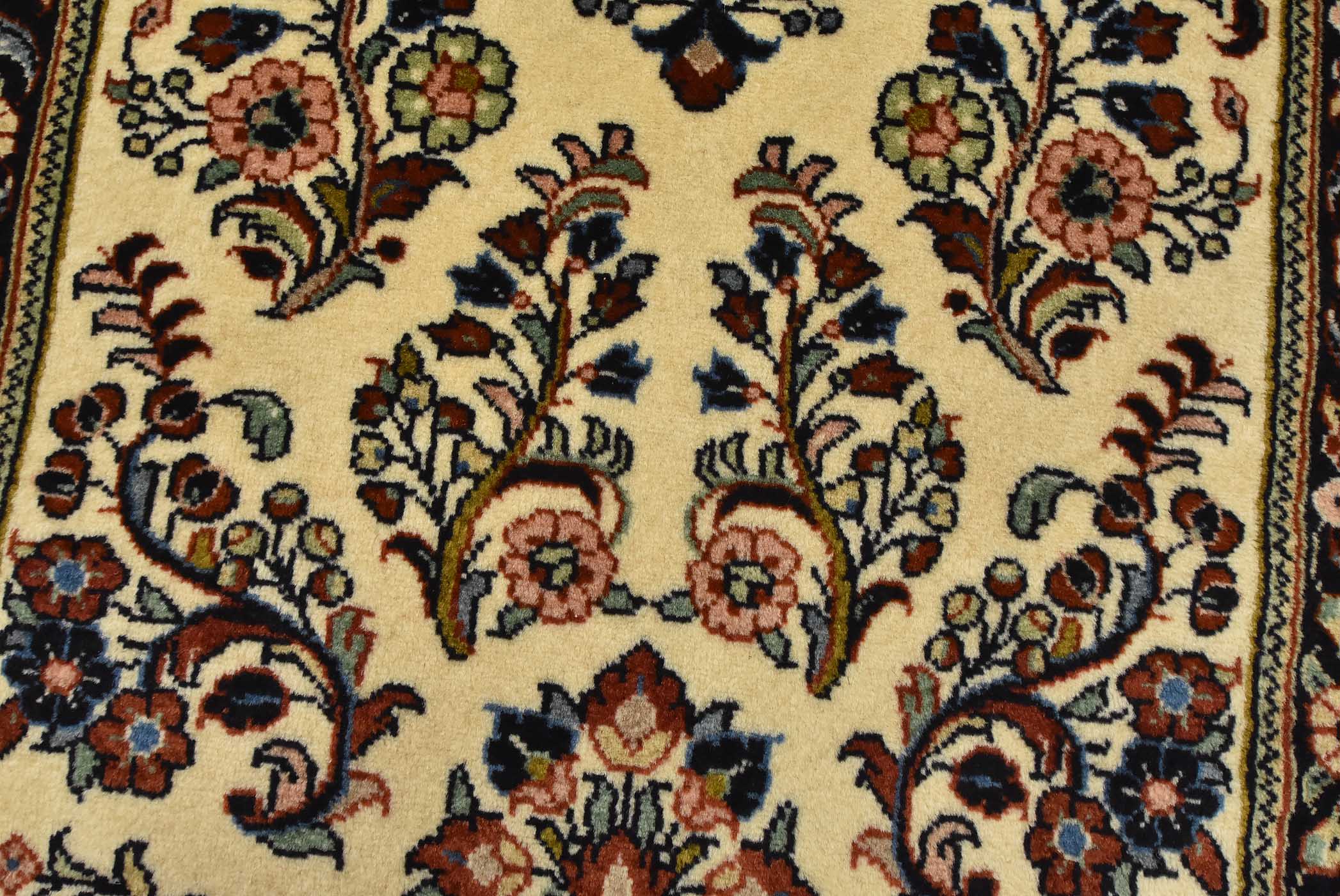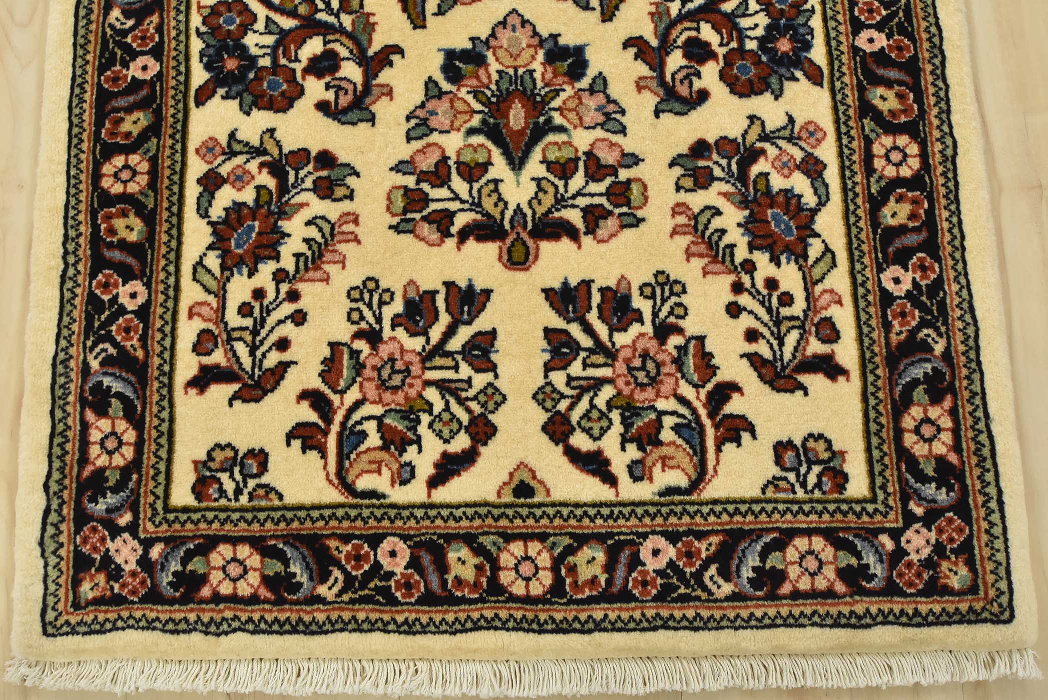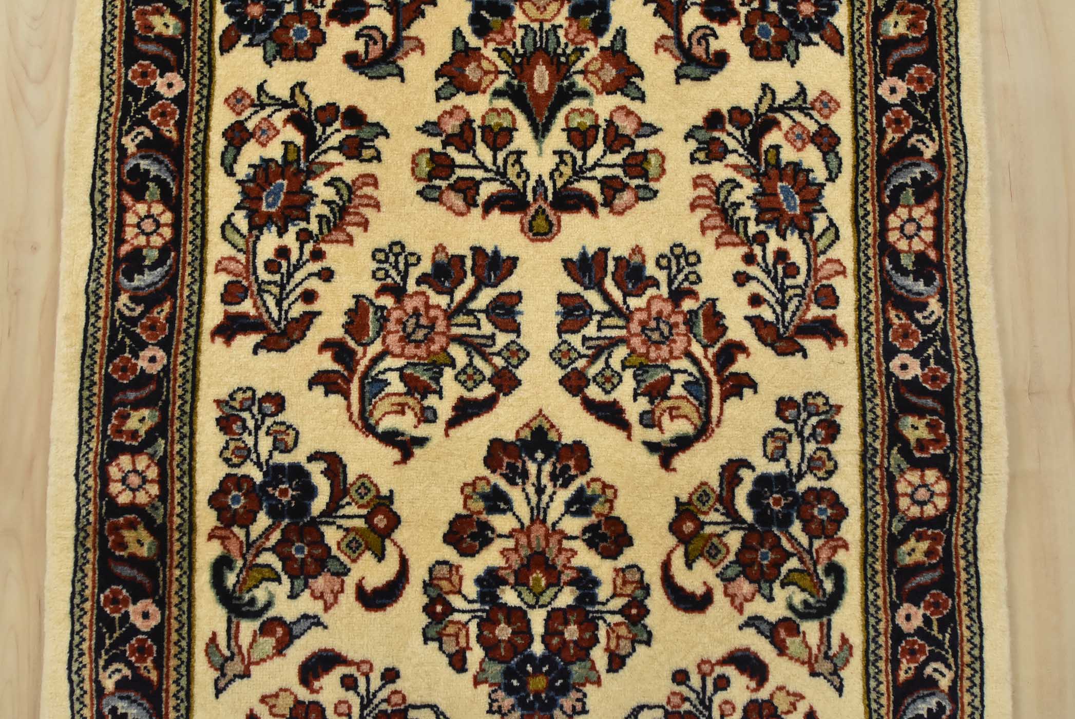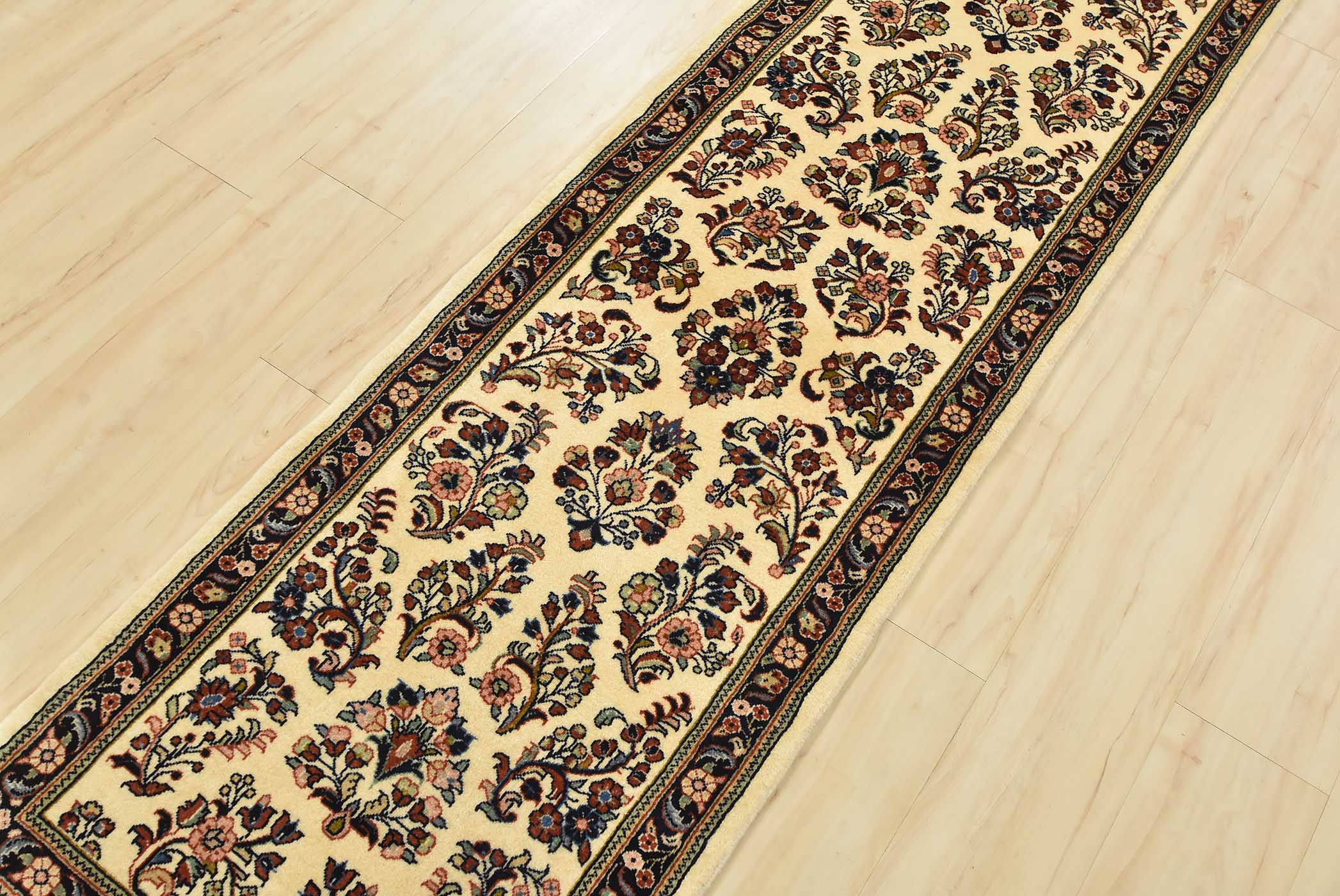 An authentic vintage traditional Kashmar runner hand-knotted with fine wool and natural dyes. This intricately woven oriental rug features a botanical design with flowers set against an ivory background. It has a full wool pile with no worn areas and is in very good condition.