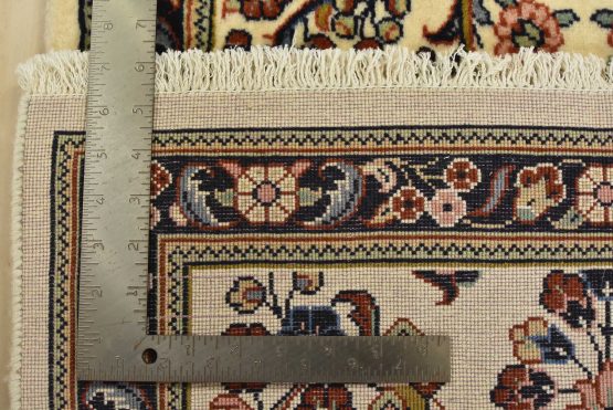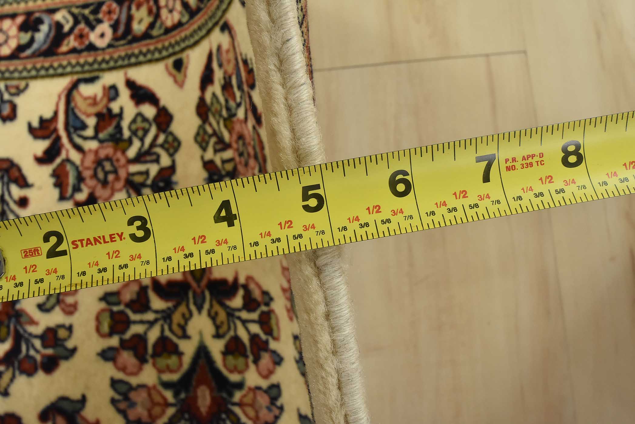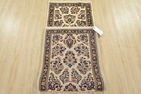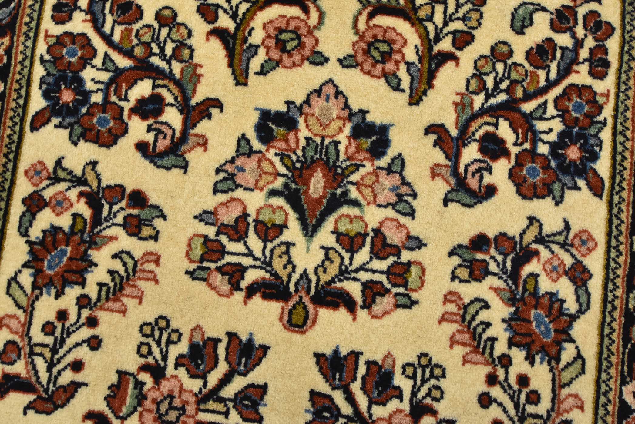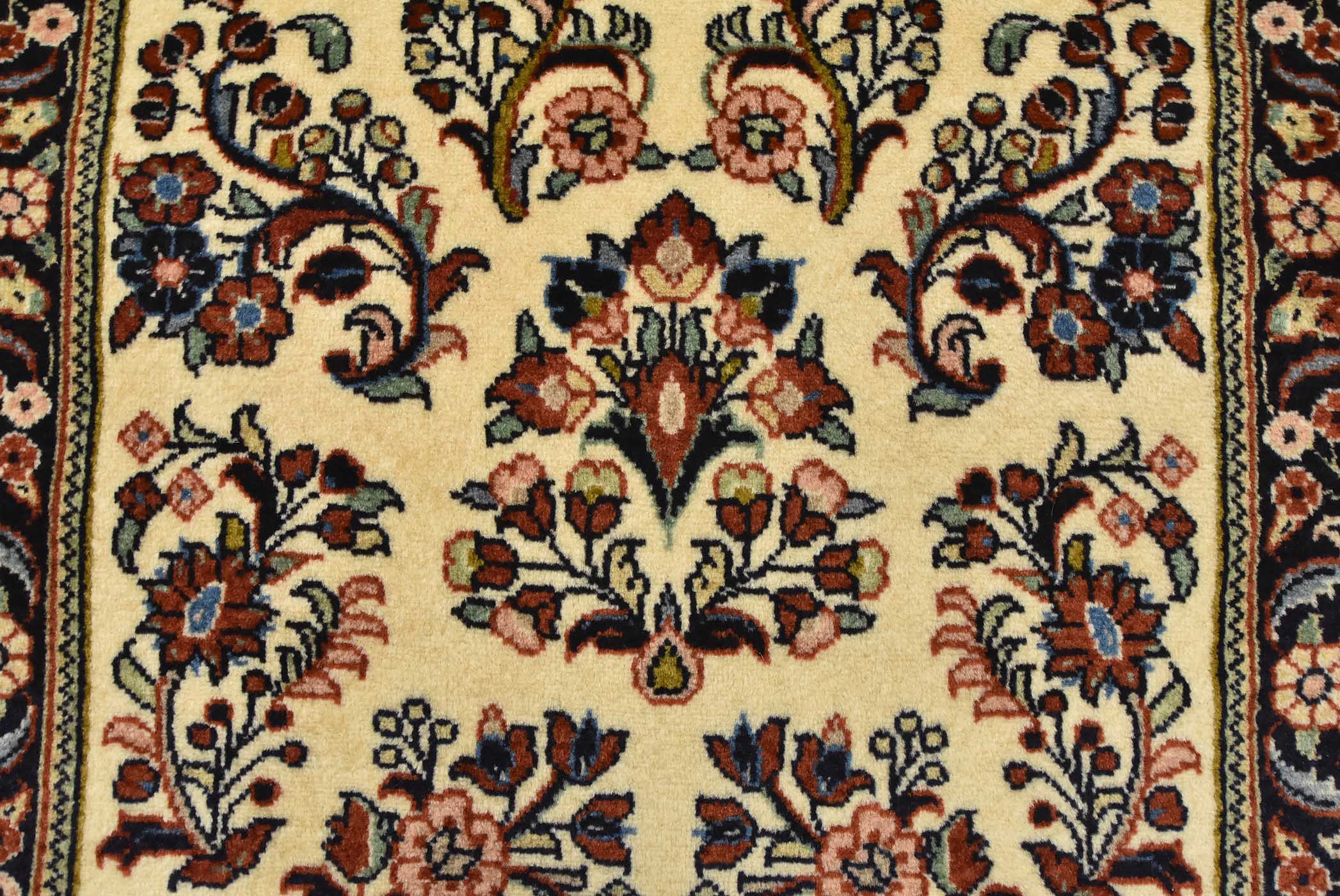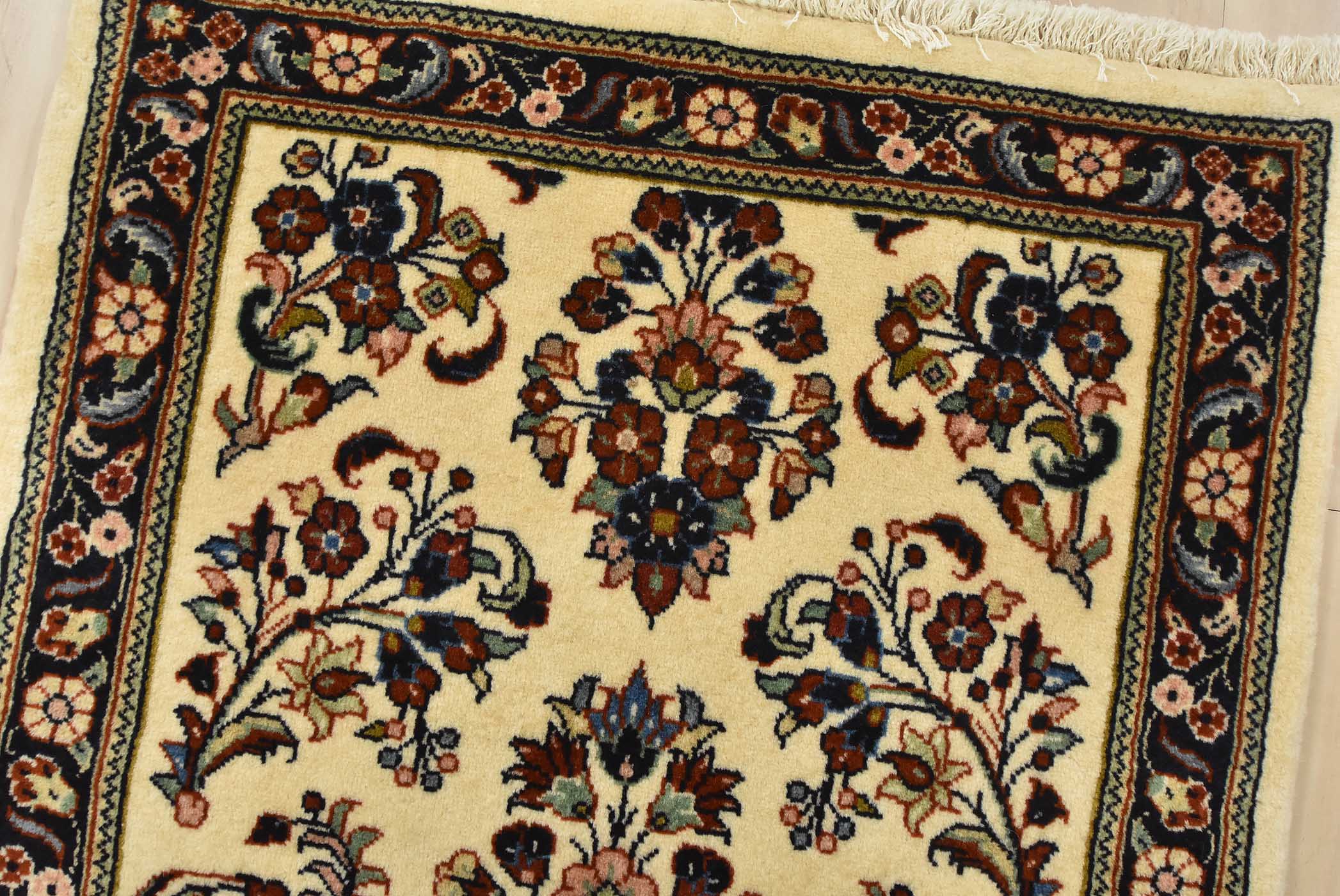 An authentic vintage traditional Kashmar runner hand-knotted with fine wool and natural dyes. This intricately woven oriental rug features a botanical design with flowers set against an ivory background. It has a full wool pile with no worn areas and is in very good condition.