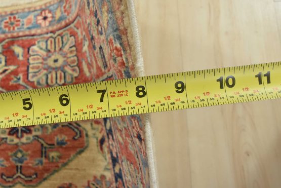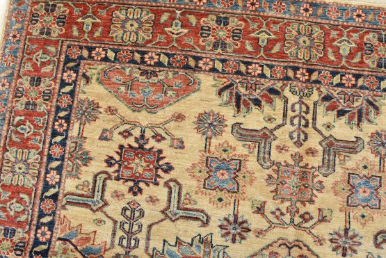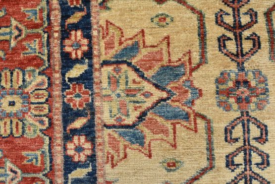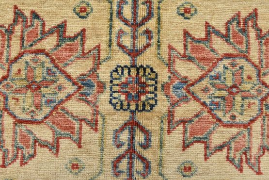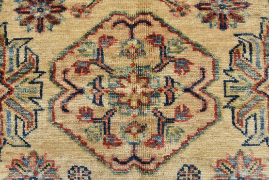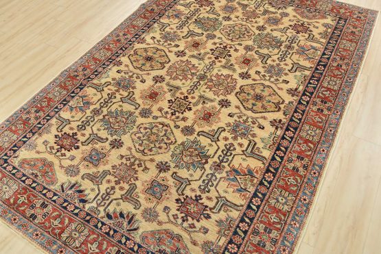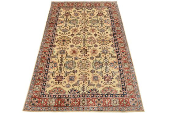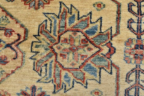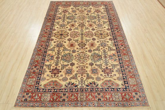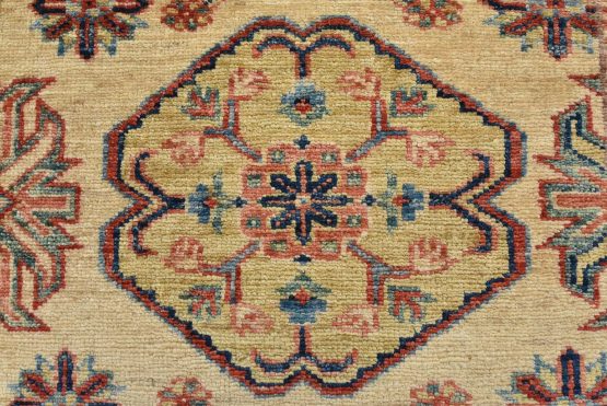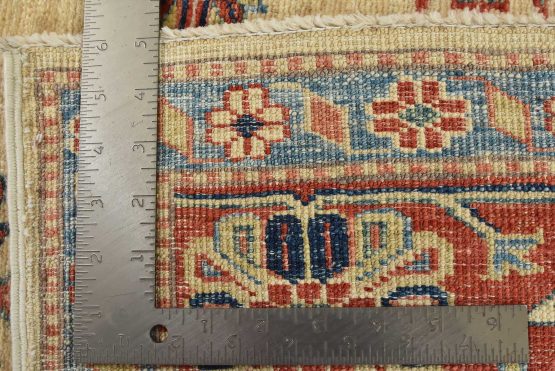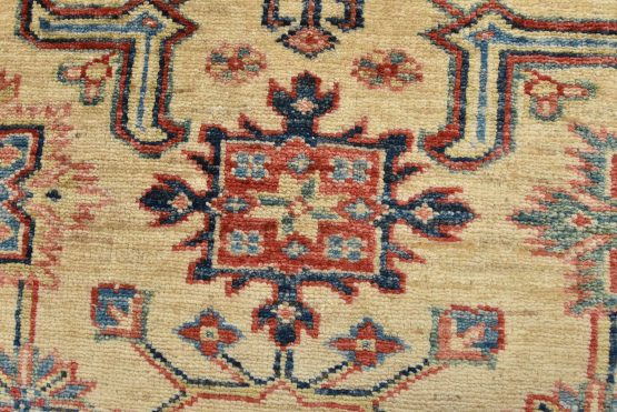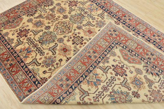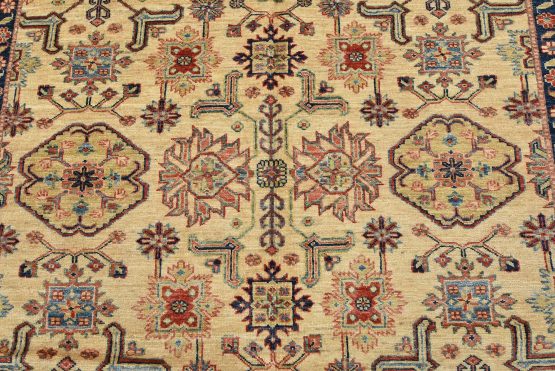 A traditional tribal Caucasian Kazak rug hand-knotted with an all-wool pile on a cotton foundation. This finely woven oriental rug features all-over geometric botanical motifs set against a beige background. It is new and in excellent condition.