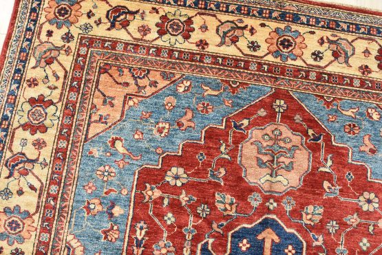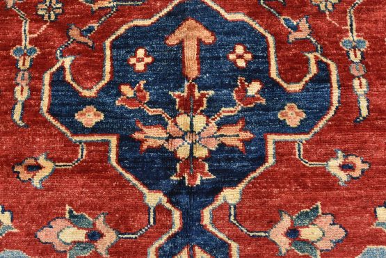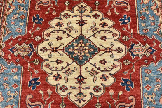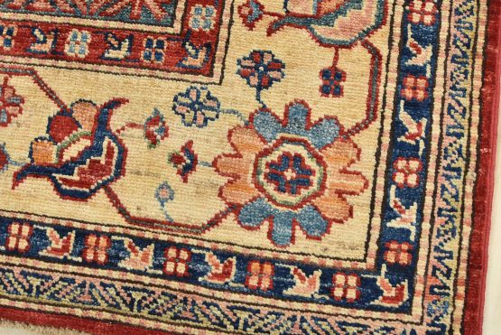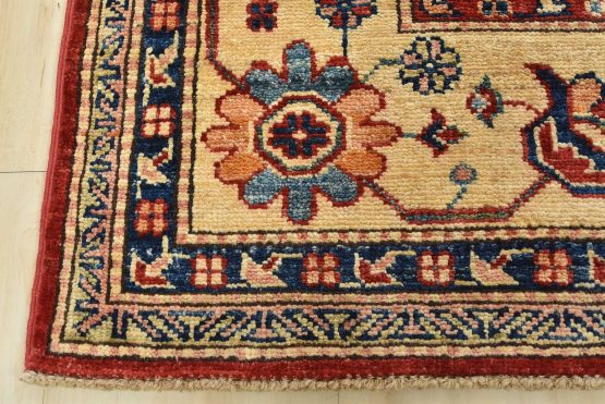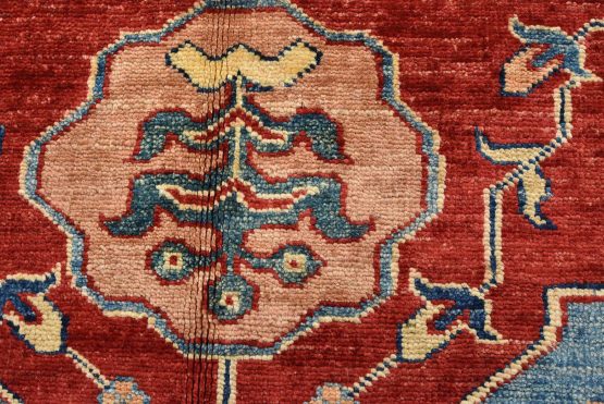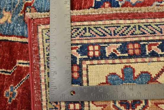 A traditional Caucasian Kazak rug hand-knotted with an all-wool pile on a cotton foundation. This finely woven oriental rug features a central medallion surrounded by a botanical design set against a red background. It is new and in excellent condition.