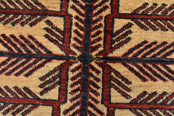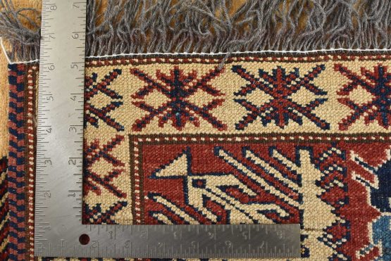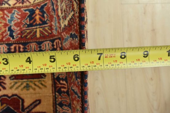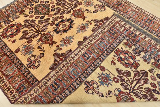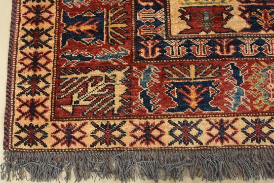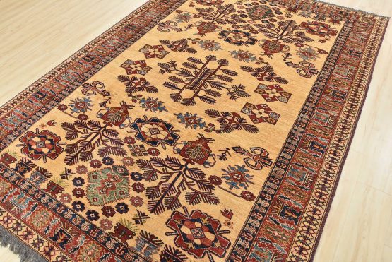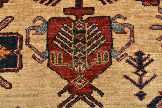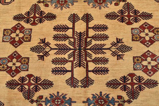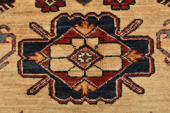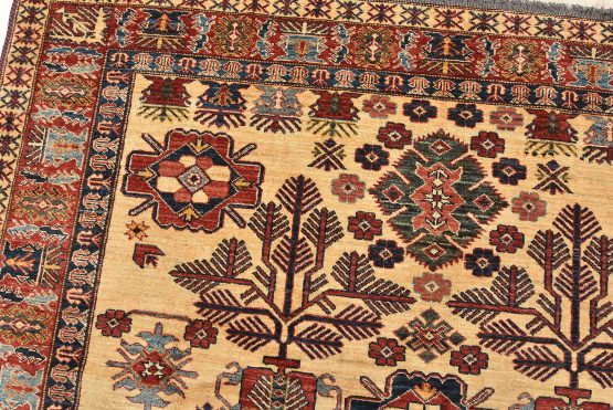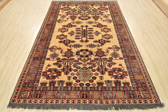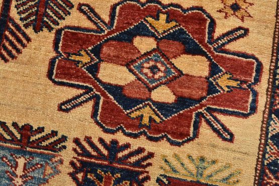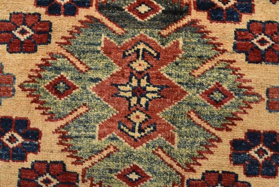 A traditional tribal Caucasian Kazak rug hand-knotted with an all-wool pile on a cotton foundation. This finely woven oriental rug features an all-over design of geometric botanical motifs set against a beige background. It is new and in excellent condition.