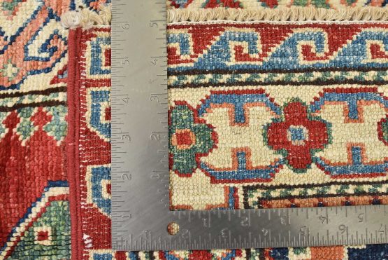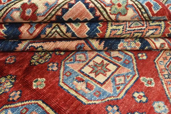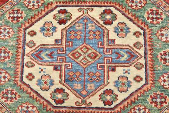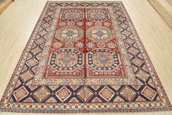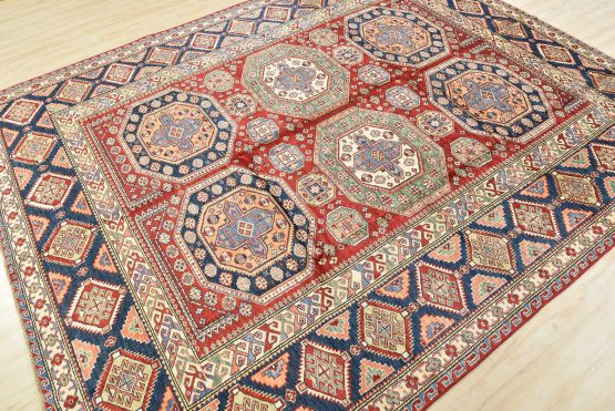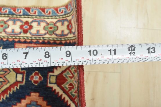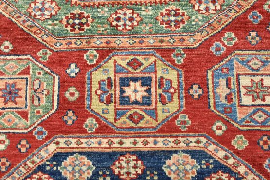 A tribal Caucasian Kazak rug hand-knotted with an all-wool pile on a cotton foundation. This finely woven oriental rug features rows of geometric medallions surrounded by small geometric motifs, set against a red background. It is new and in excellent condition.