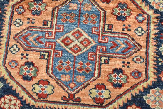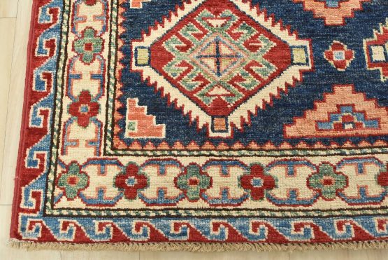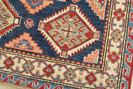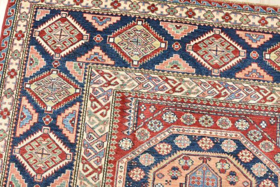 Original antique Kazak rugs from the Caucasus region inspire the creation of new Kazak rugs. These rugs are woven with fine wool using traditional Kazak patterns and finished with a low-cut pile to give them an authentic vintage look.