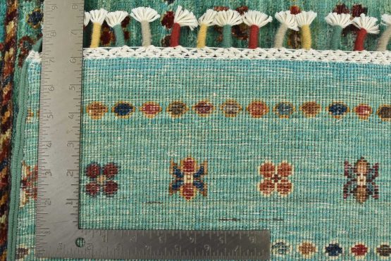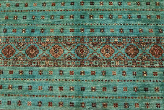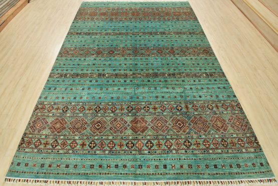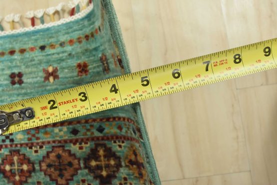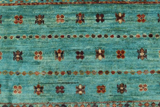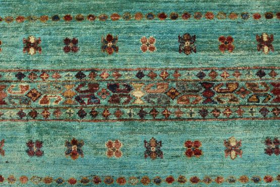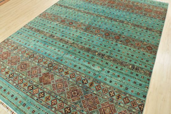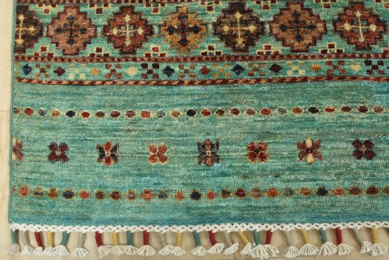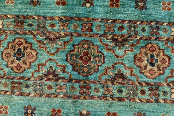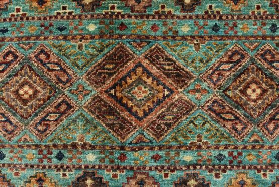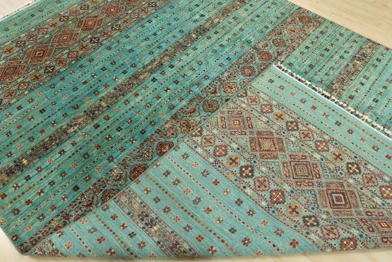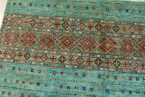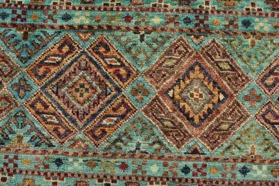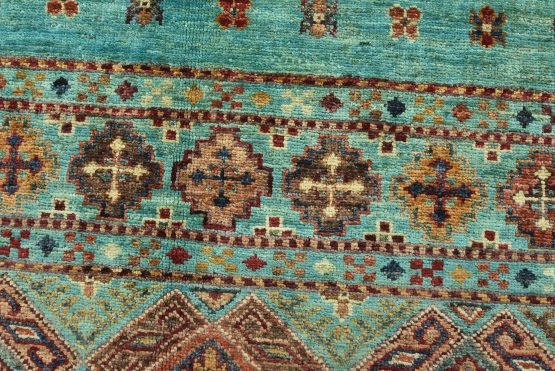 A tribal Khorjin rug hand-knotted with an all-wool pile on a cotton foundation. This finely woven oriental rug features an all-over pattern with rows of geometric motifs set against an aqua blue background. It is new and in excellent condition.