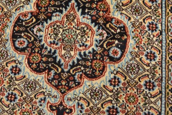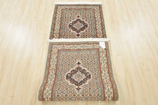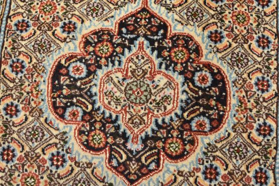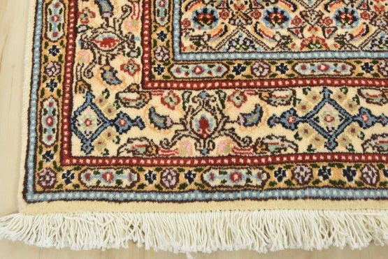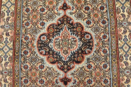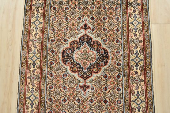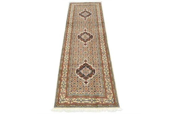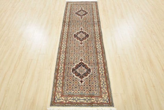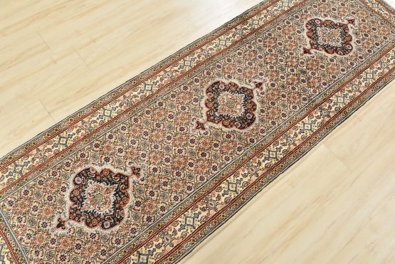 An authentic vintage traditional Mood runner hand-knotted with fine wool and natural dyes. This finely woven oriental rug features curvilinear medallions surrounded by an intricate Herati pattern set against an ivory background. It has a full wool pile with no worn areas and is in very good condition.