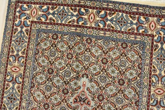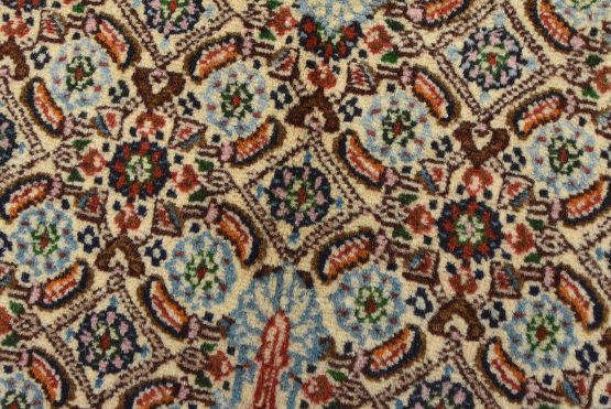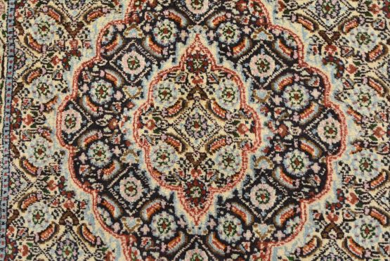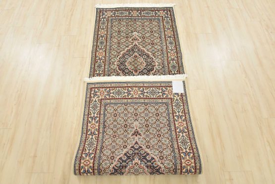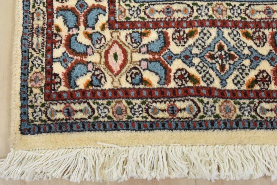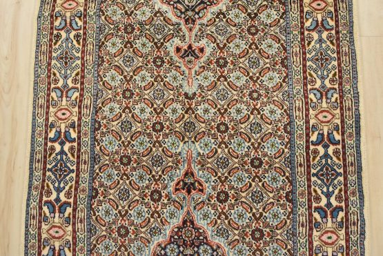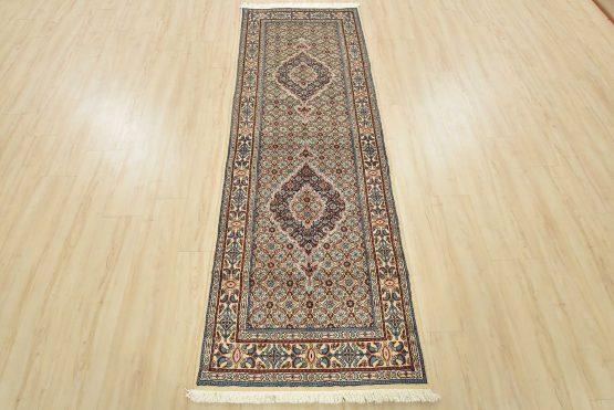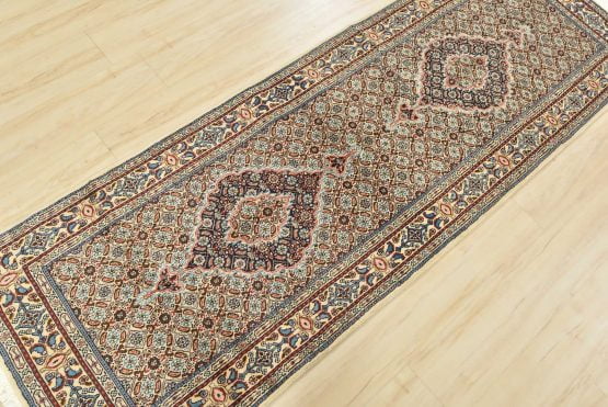An authentic vintage traditional Mood runner hand-knotted with fine wool and natural dyes. This finely woven oriental rug features oval-shaped medallions surrounded by an intricate Herati pattern set against a white background. It has a full wool pile with no worn areas and is in very good condition.