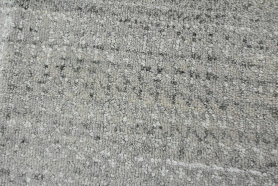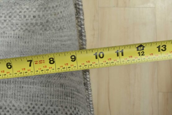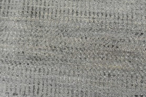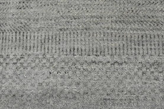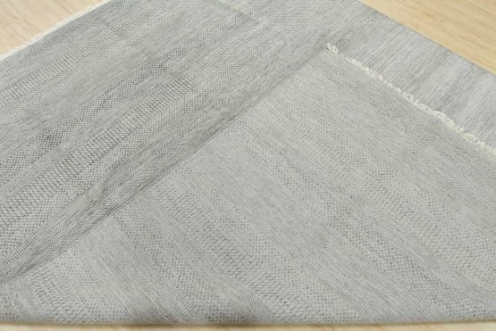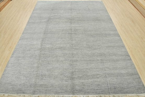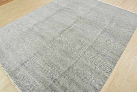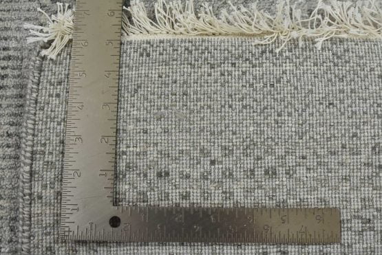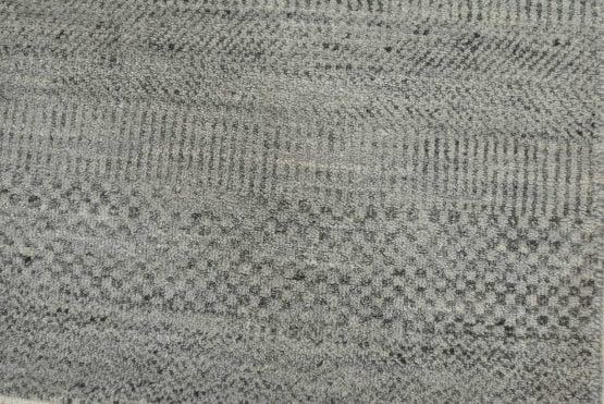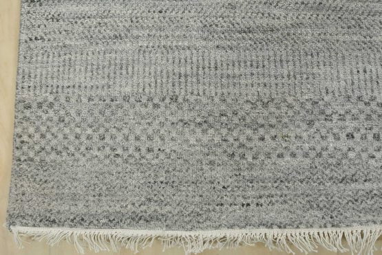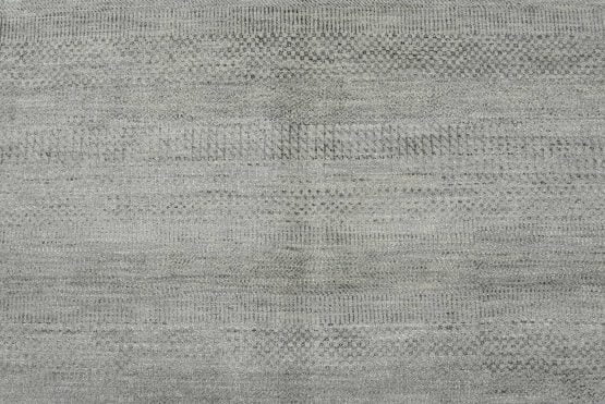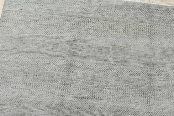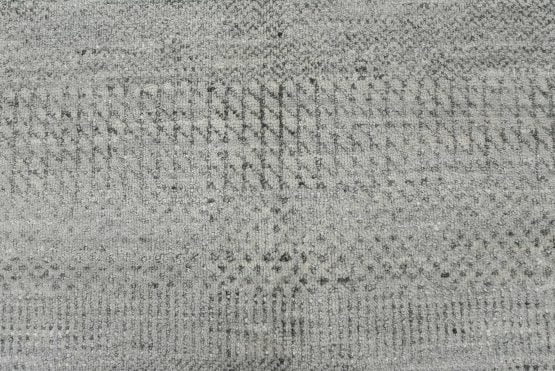 A contemporary rug hand-knotted with a wool pile on a cotton foundation. This finely woven area rug features intricate geometric patterns set against a gray background. It is new and in excellent condition.