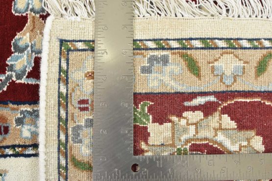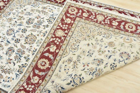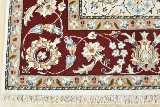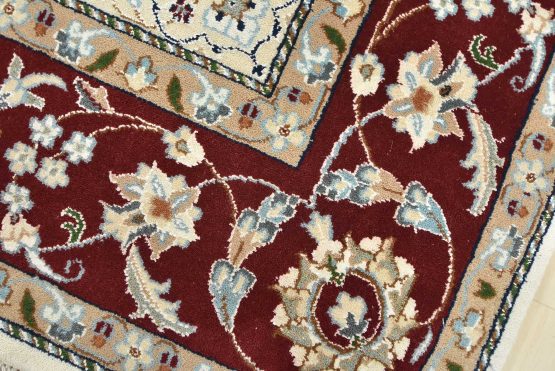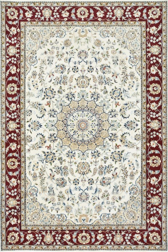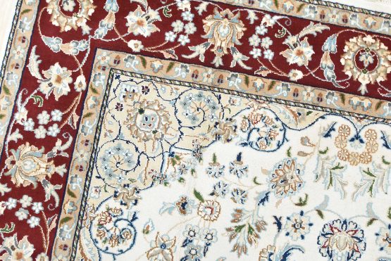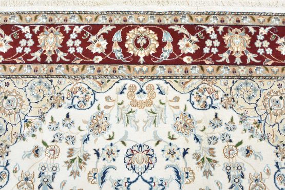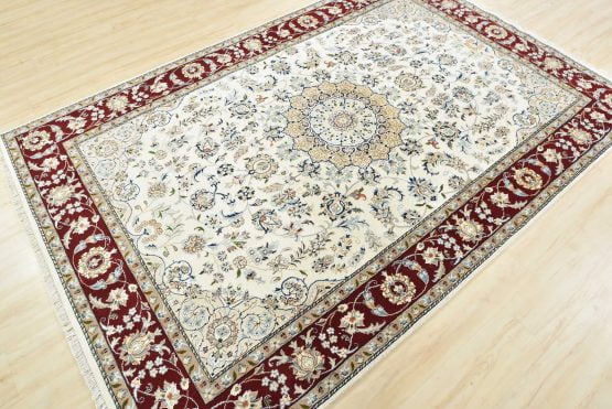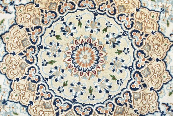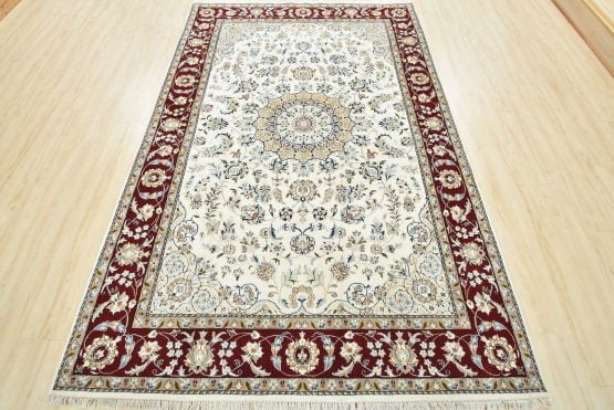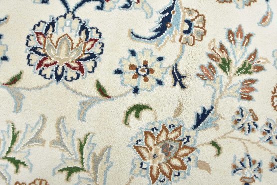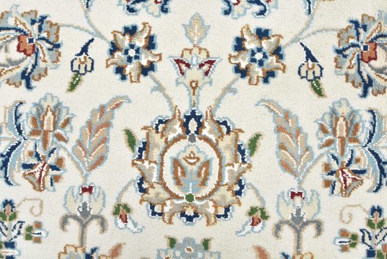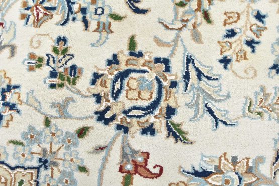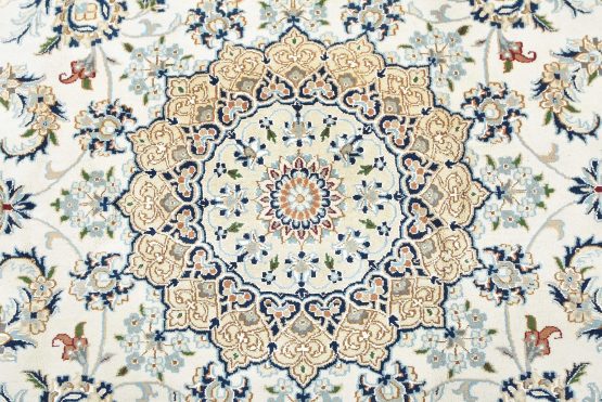A traditional Nain rug hand-knotted with an all-wool pile on a cotton foundation. This finely woven oriental rug features a central medallion surrounded by an intricate floral design set against a white background. It is new and in excellent condition.
