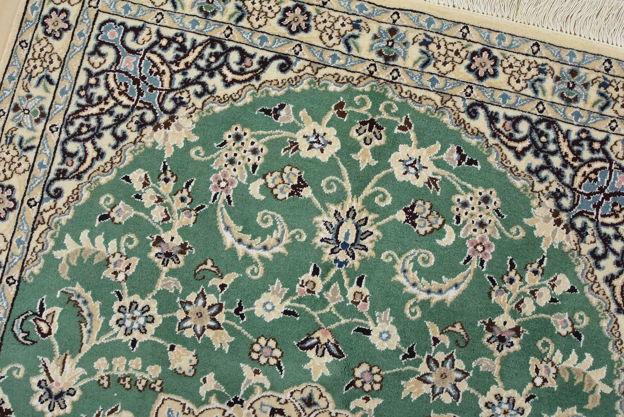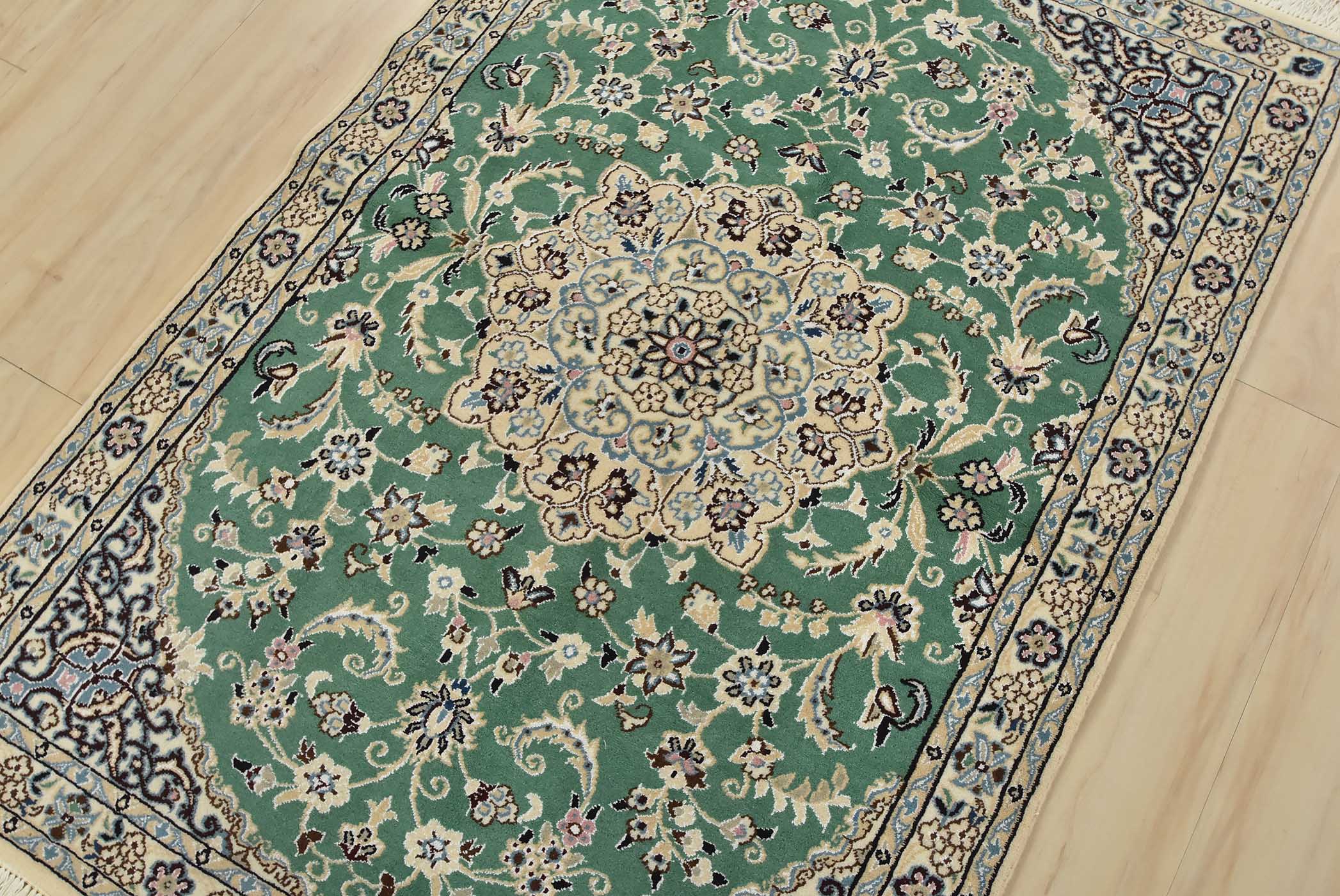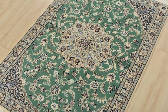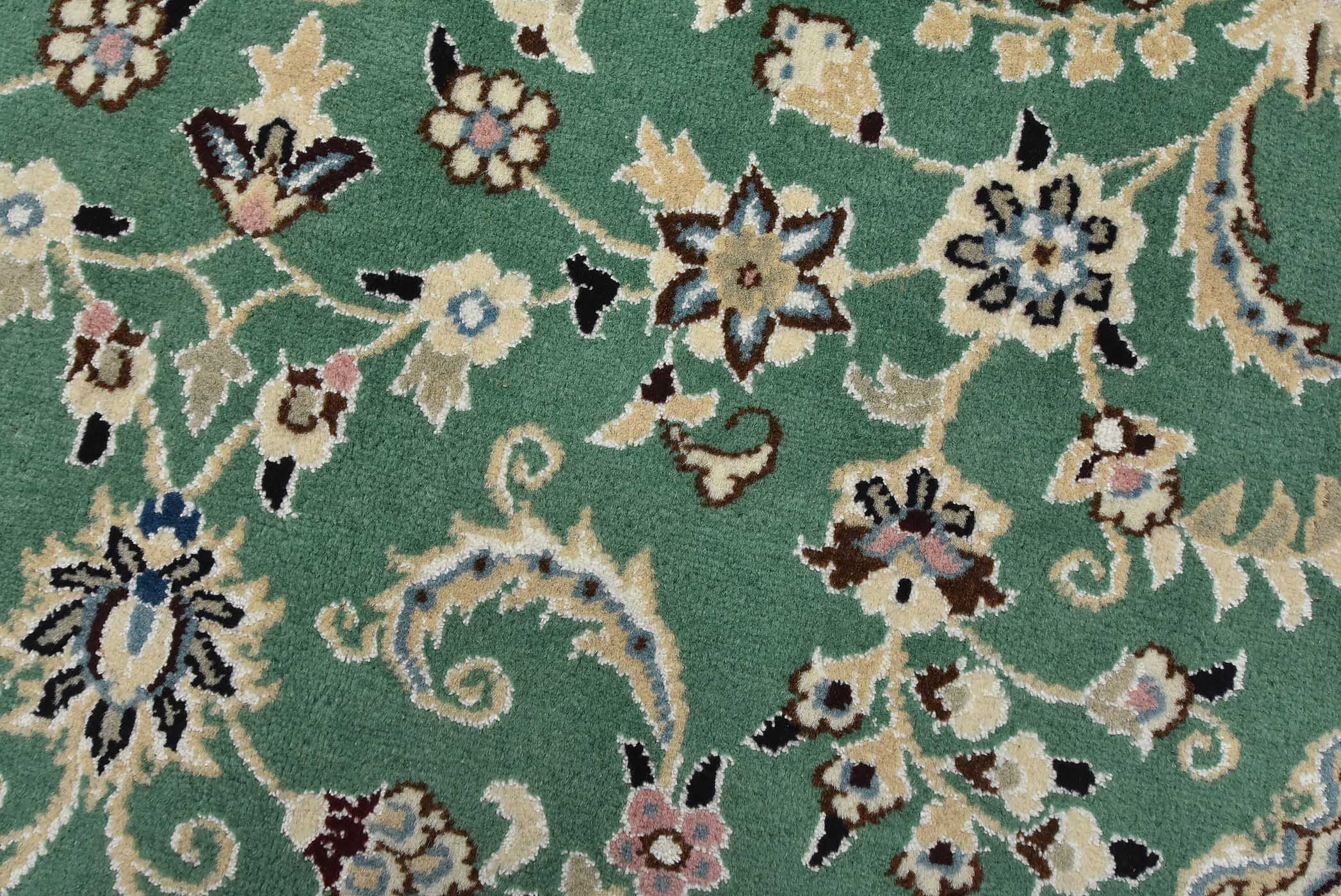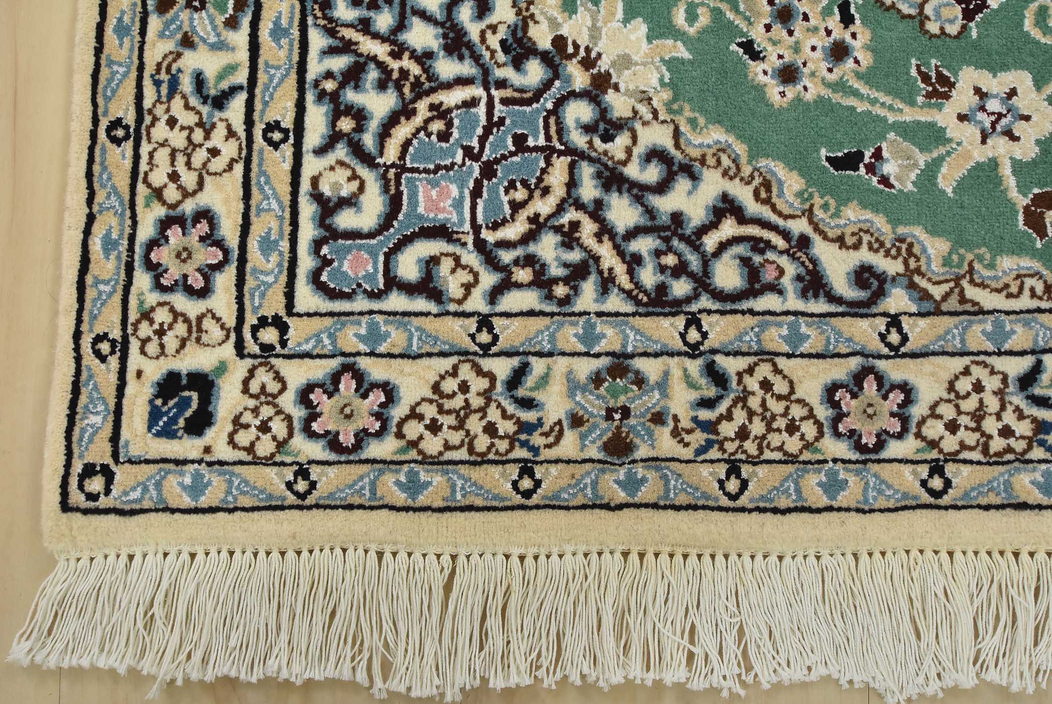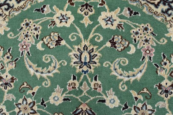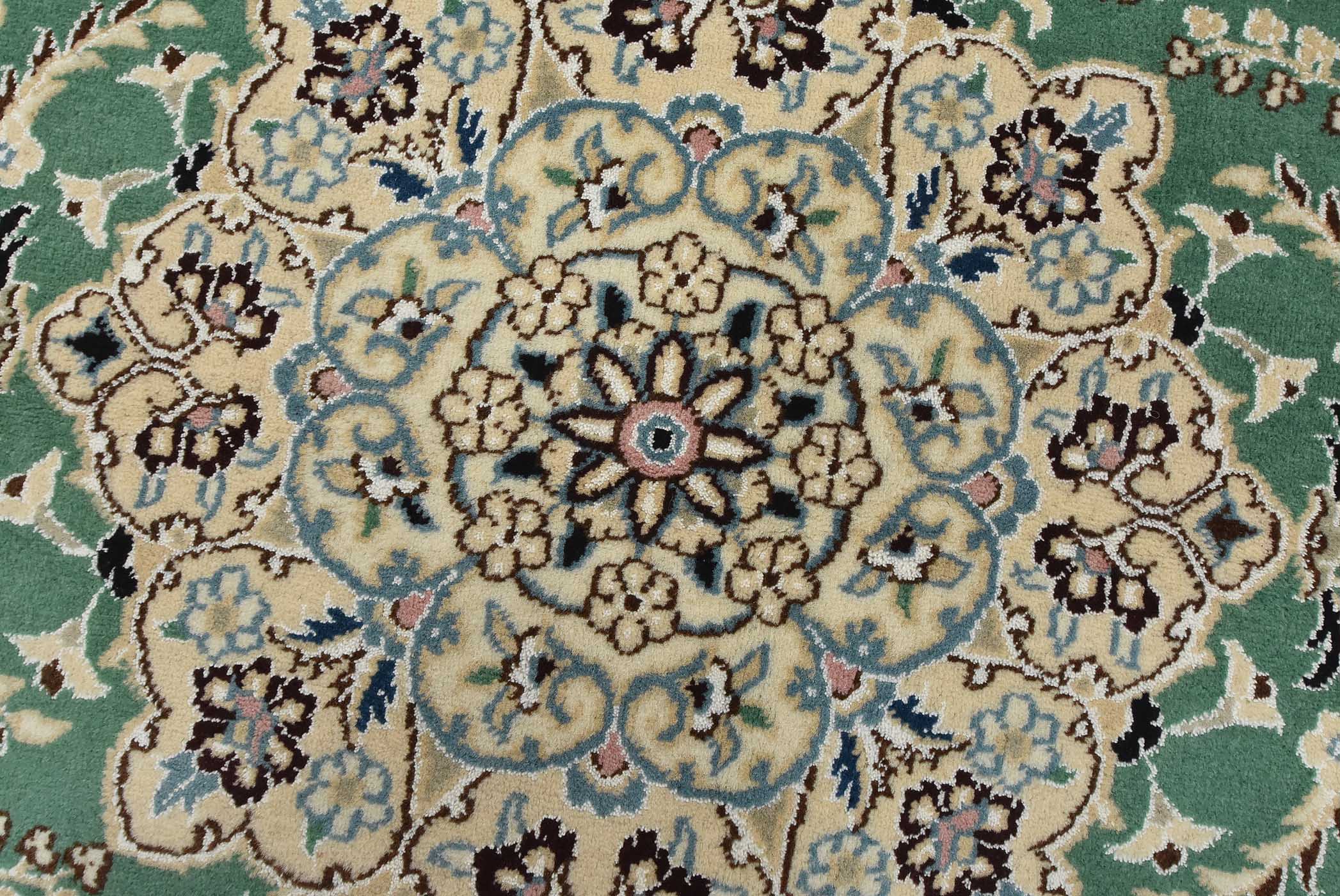 An authentic vintage traditional Nain rug, hand-knotted with fine wool and silk, dyed using natural colors. This intricately woven rug features a central medallion surrounded by a floral design set against a green background. It has a full wool pile with no worn areas and is in very good condition.