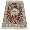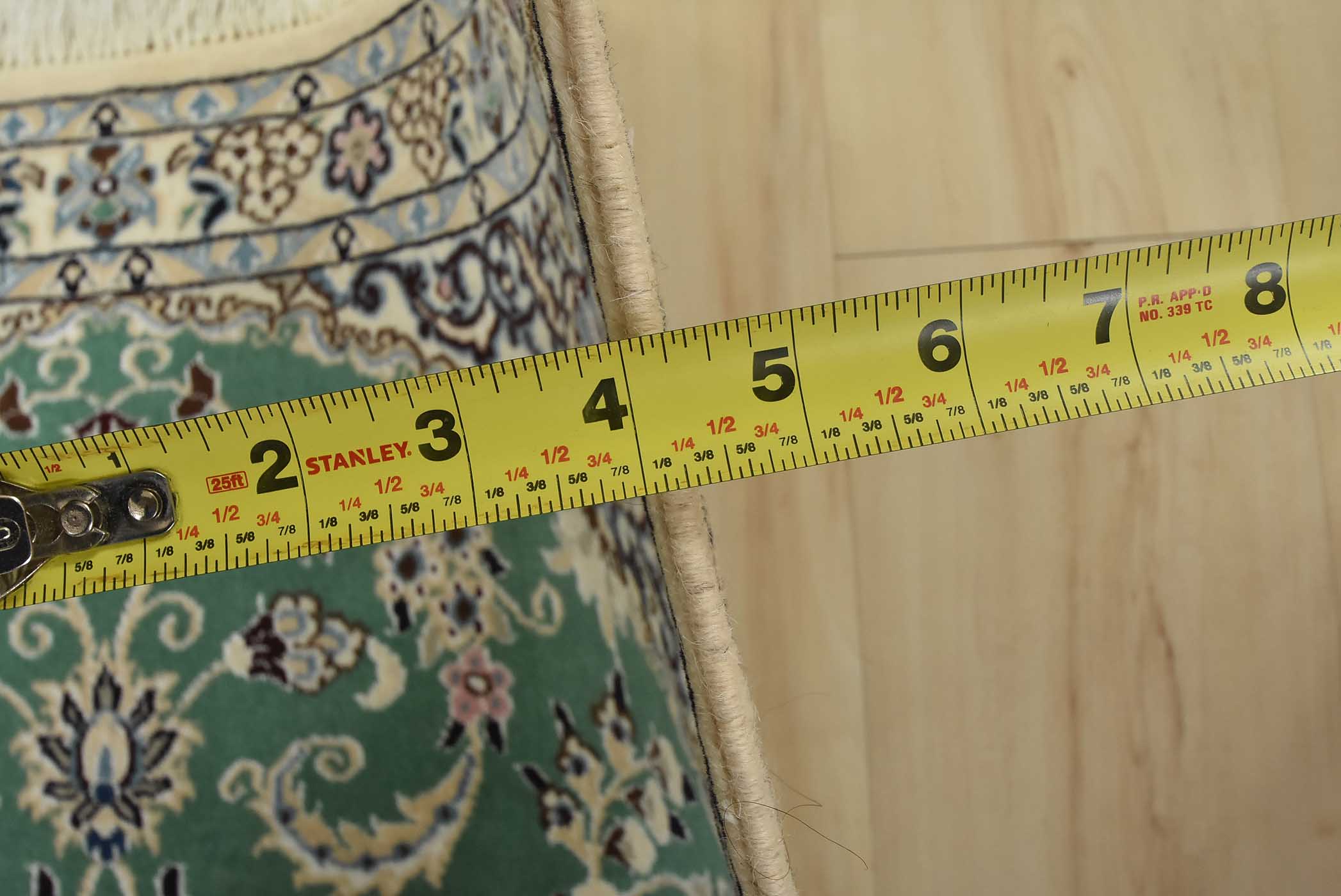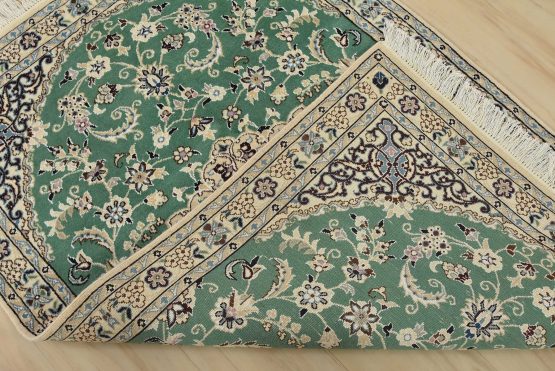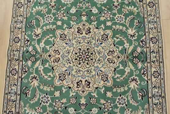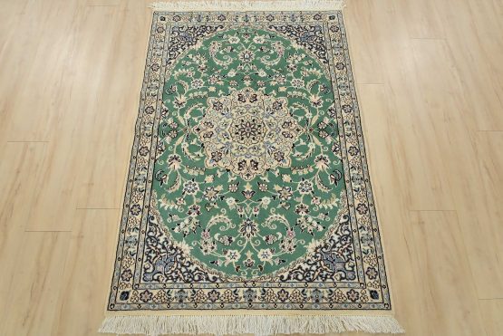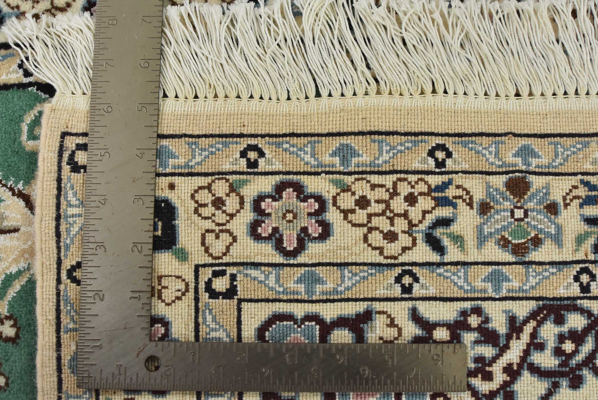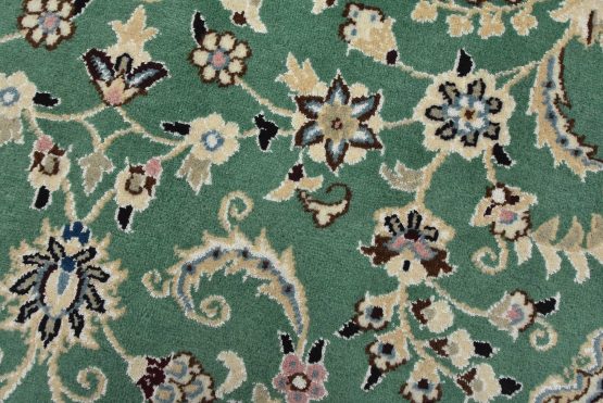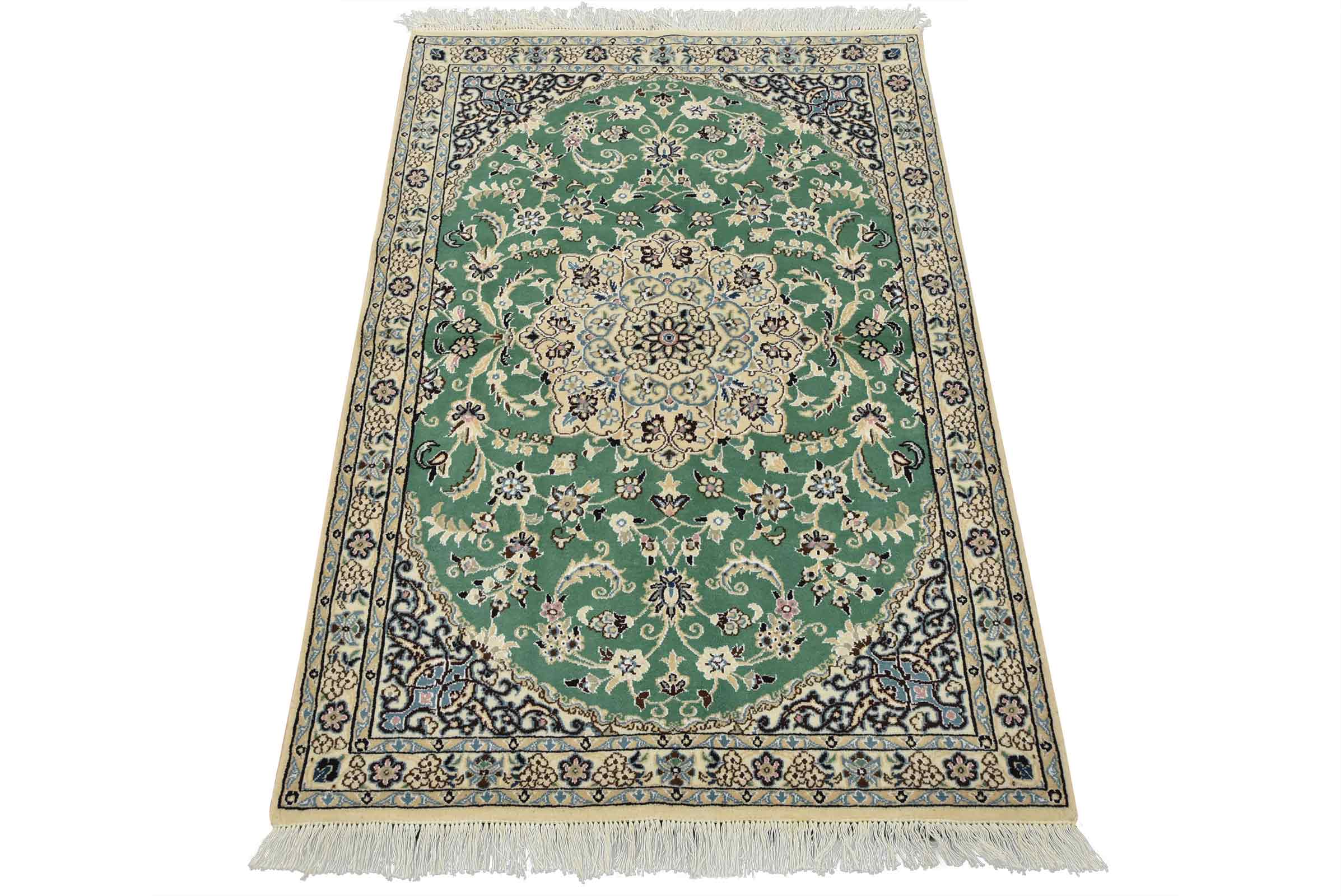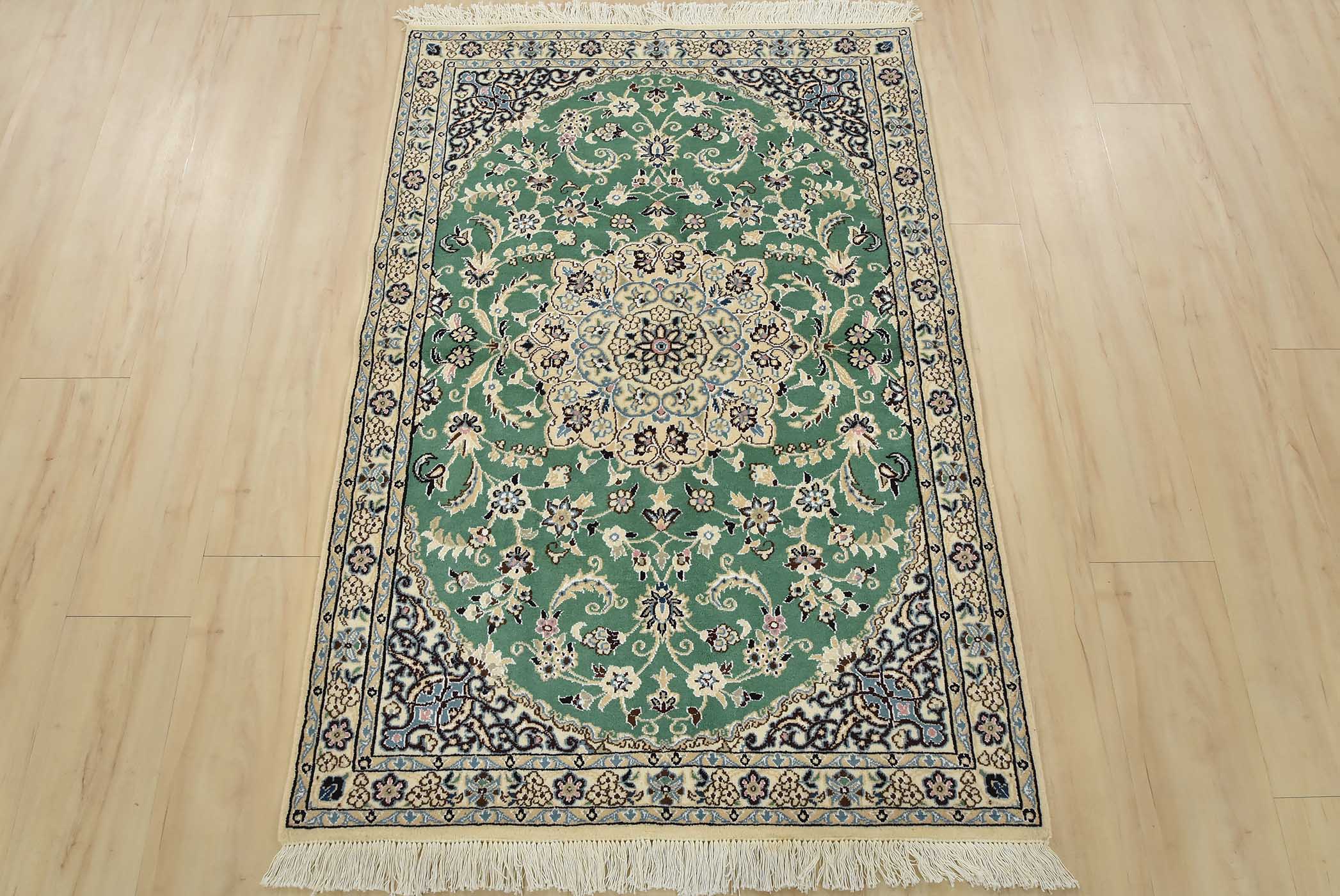 An authentic vintage traditional Nain rug, hand-knotted with fine wool and silk, dyed using natural colors. This intricately woven rug features a central medallion surrounded by a floral design set against a green background. It has a full wool pile with no worn areas and is in very good condition.