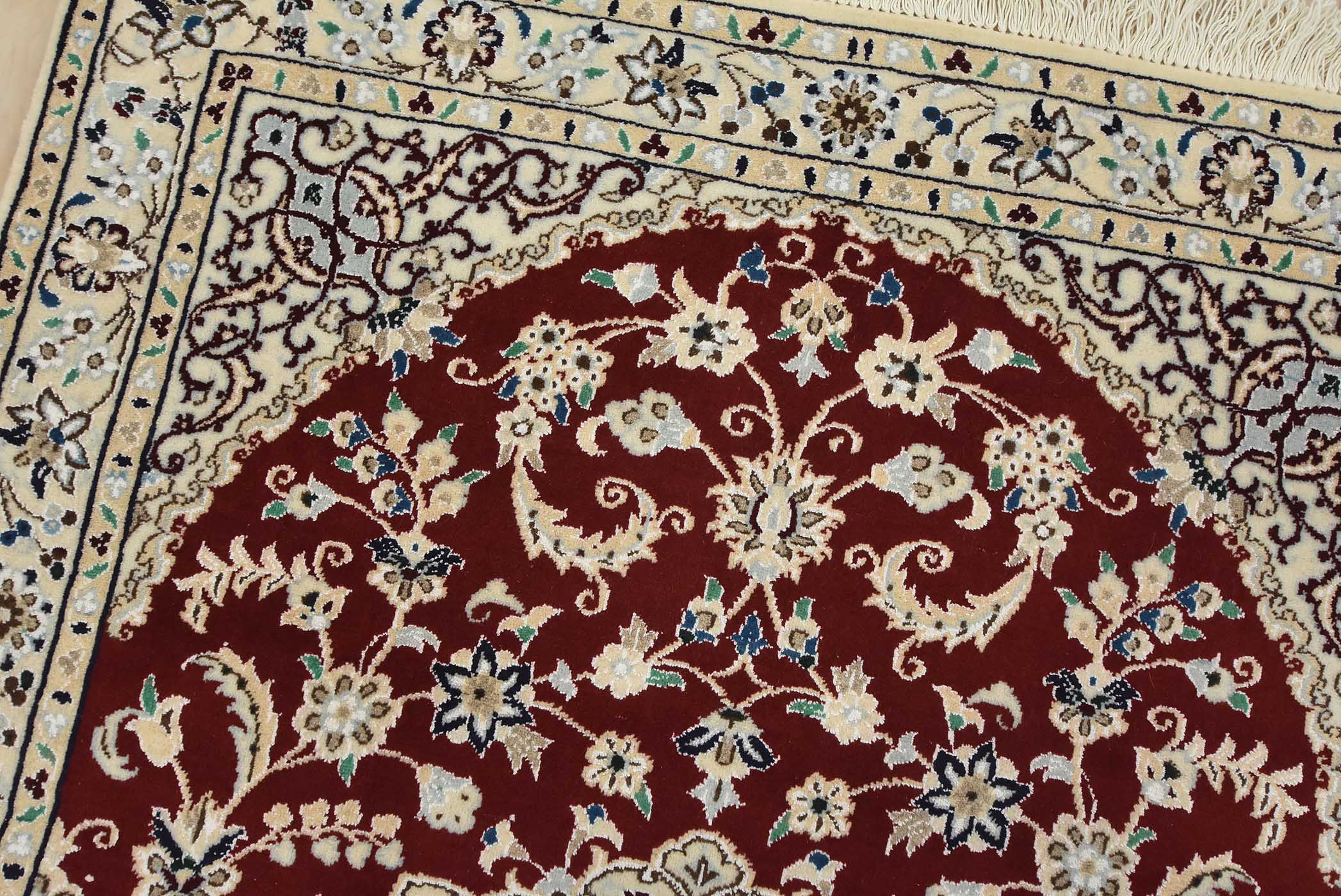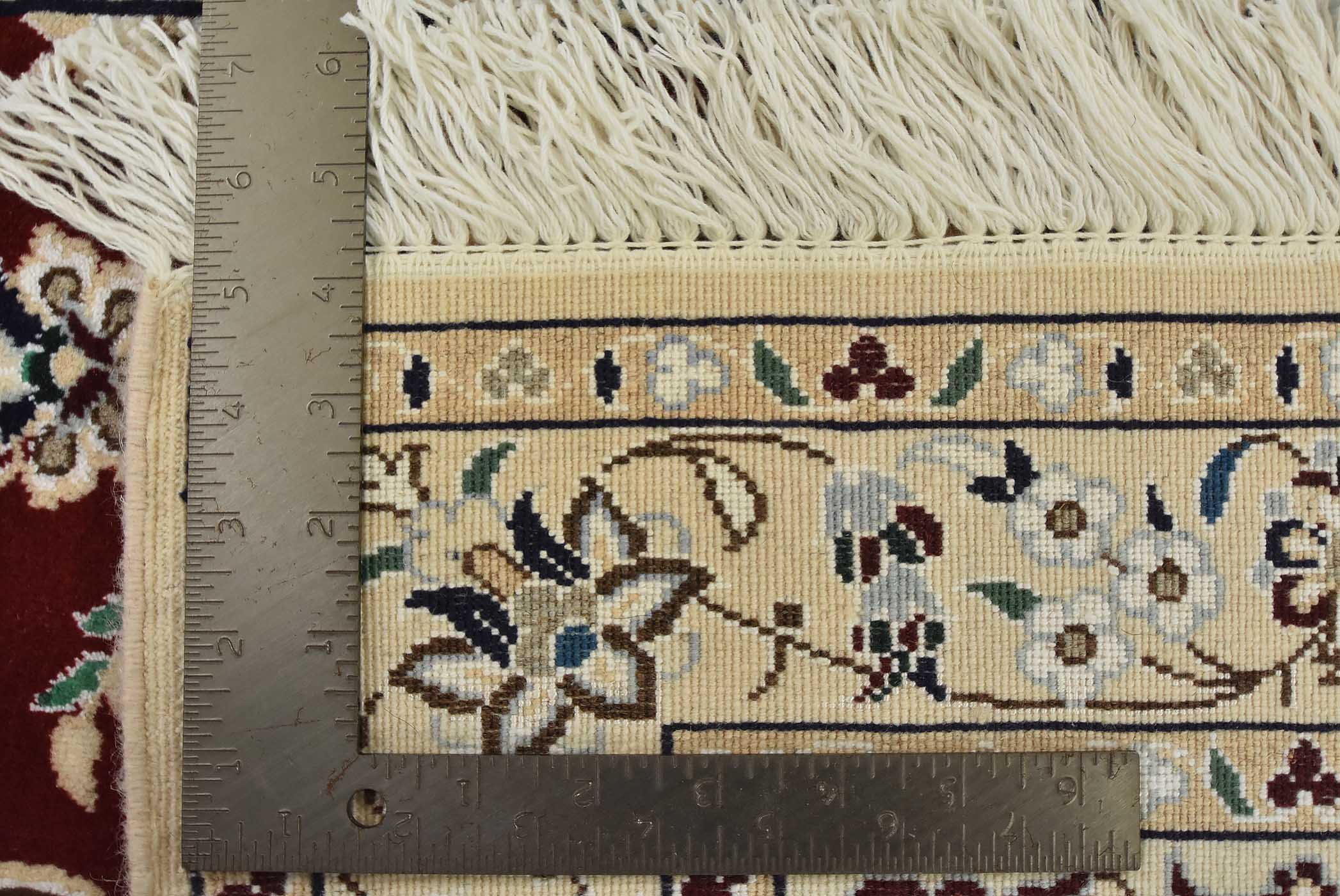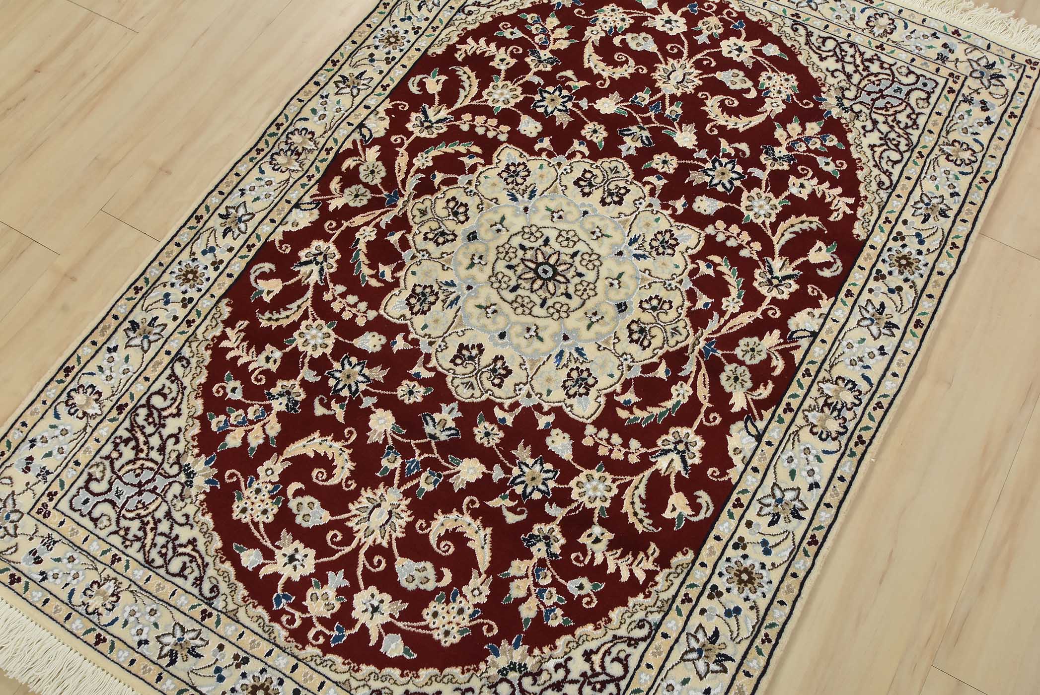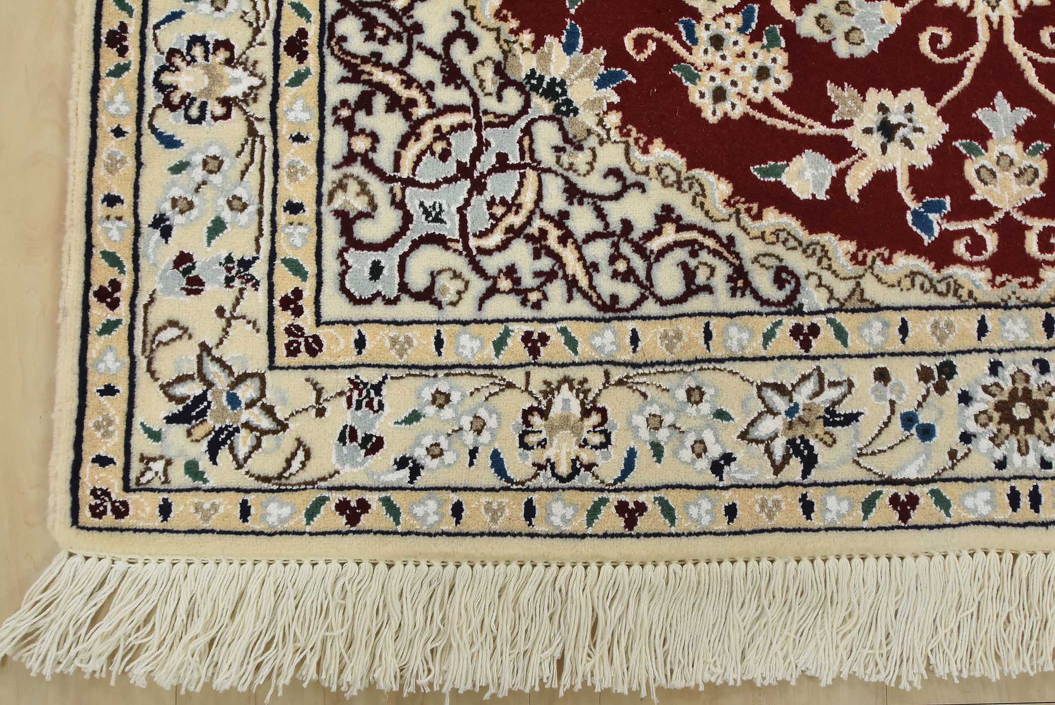 An authentic vintage traditional Nain rug, hand-knotted with fine wool and silk, dyed using natural colors. This intricately woven rug features a central medallion surrounded by a floral design set against a red background. It has a full wool pile with no worn areas and is in very good condition.