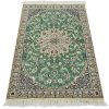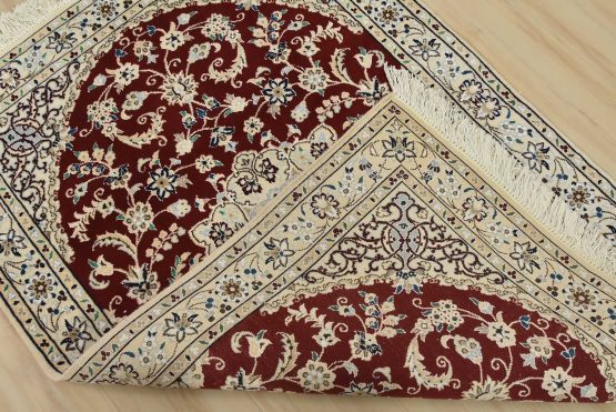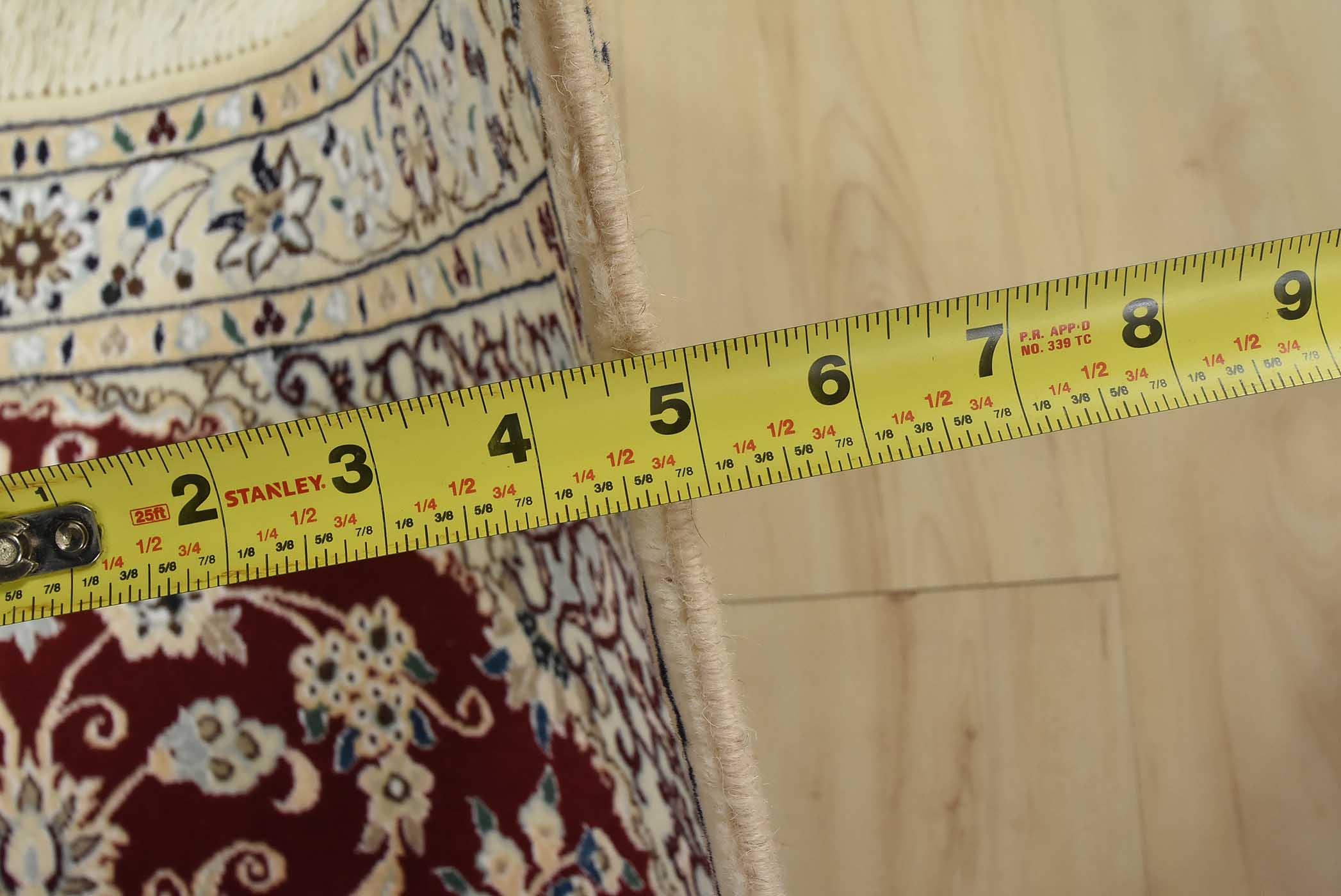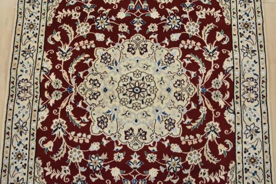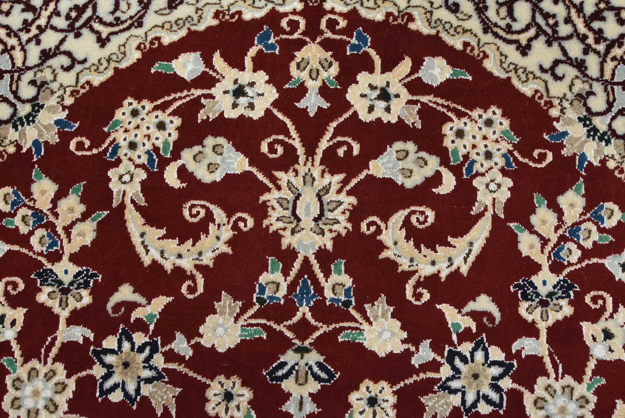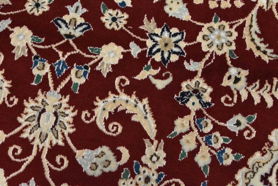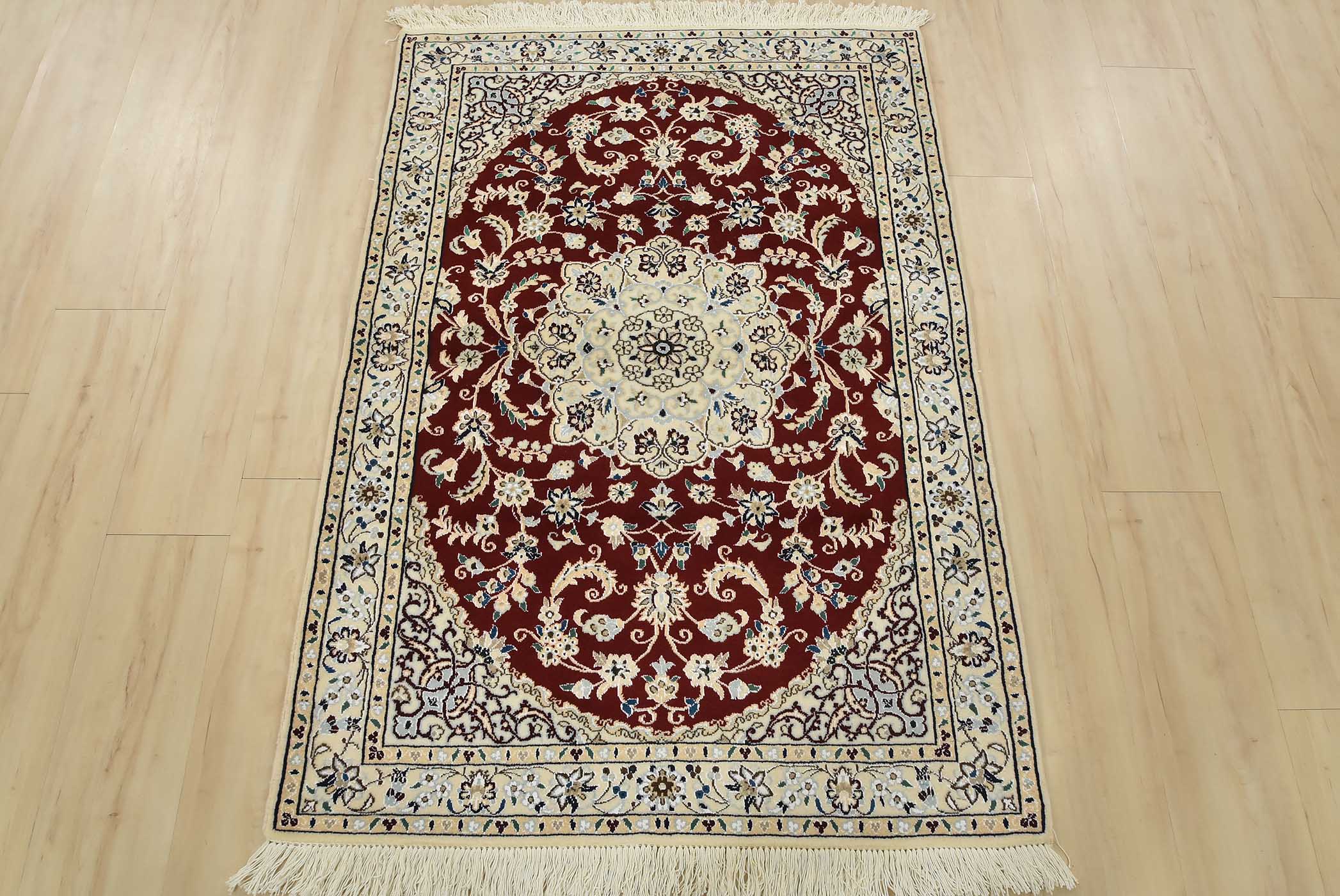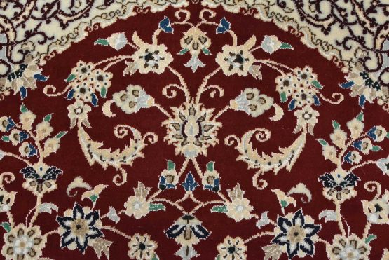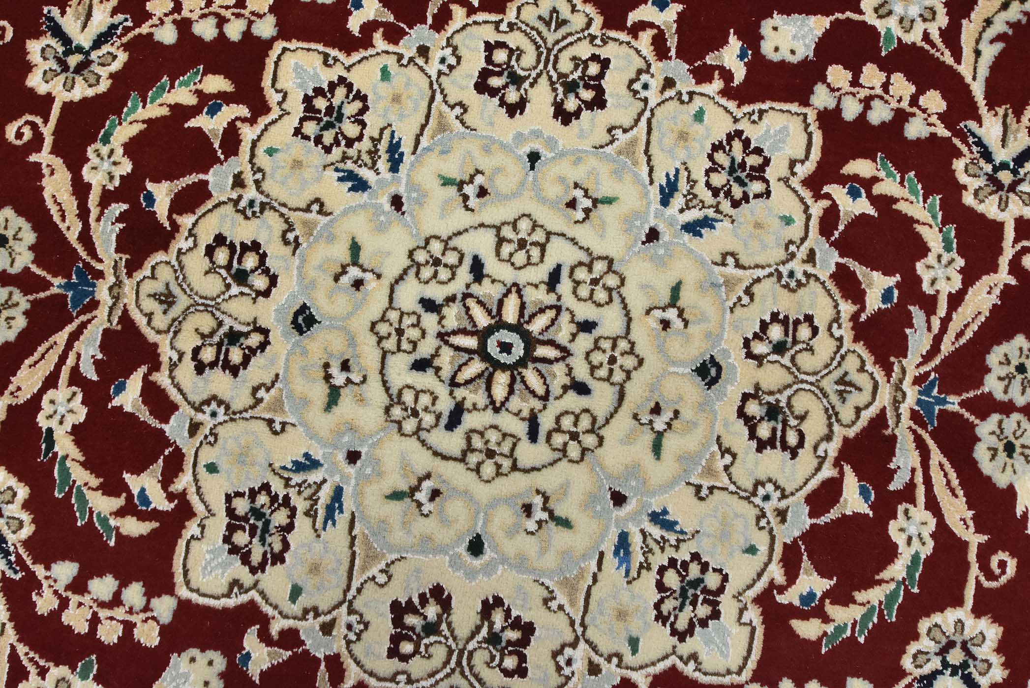An authentic vintage traditional Nain rug, hand-knotted with fine wool and silk, dyed using natural colors. This intricately woven rug features a central medallion surrounded by a floral design set against a red background. It has a full wool pile with no worn areas and is in very good condition.