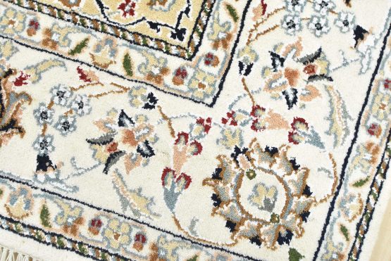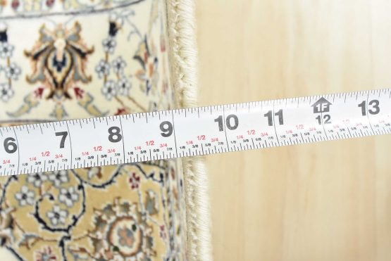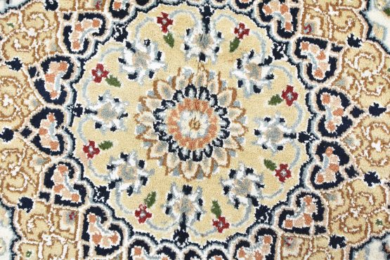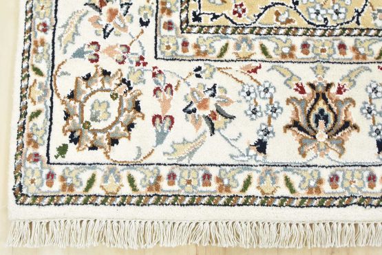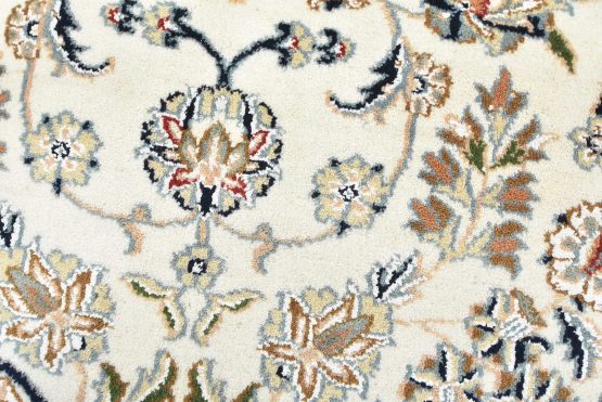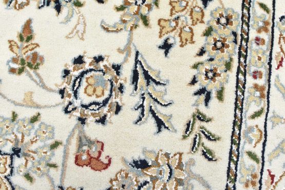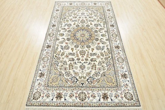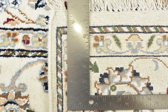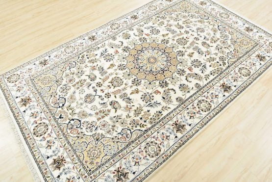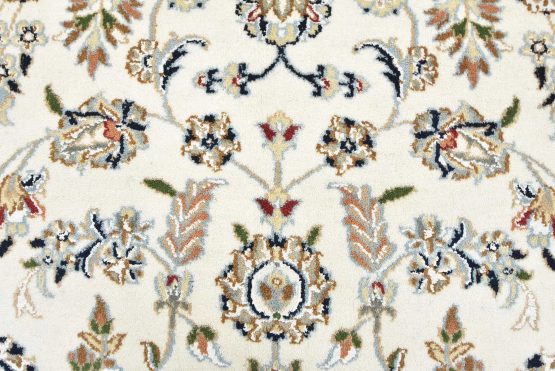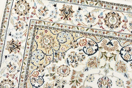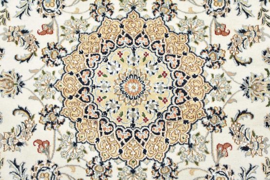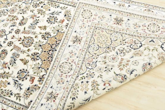 A traditional Nain rug hand-knotted with an all-wool pile on a cotton foundation. This finely woven oriental rug features a central medallion surrounded by an intricate floral design set against a white background. It is new and in excellent condition.