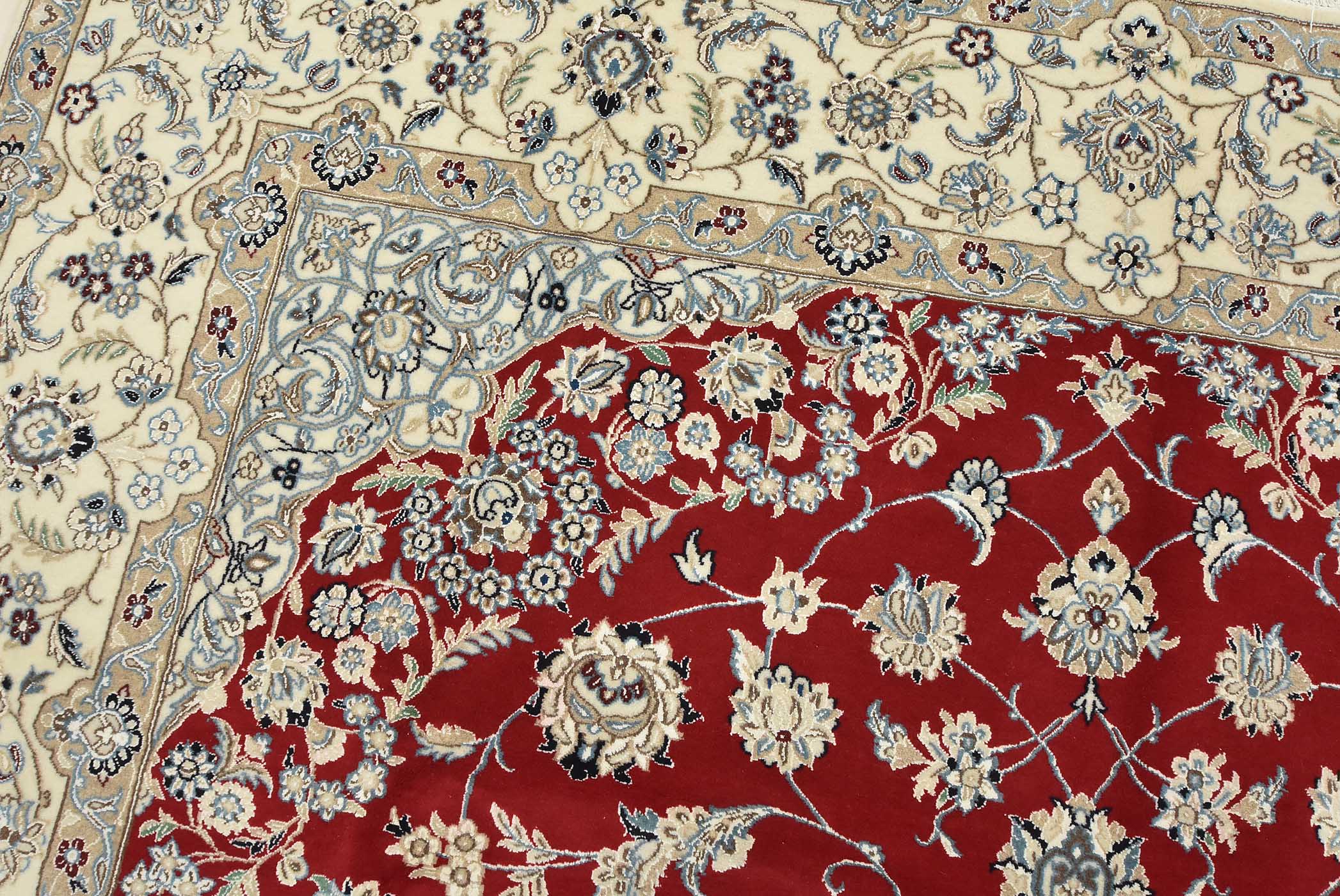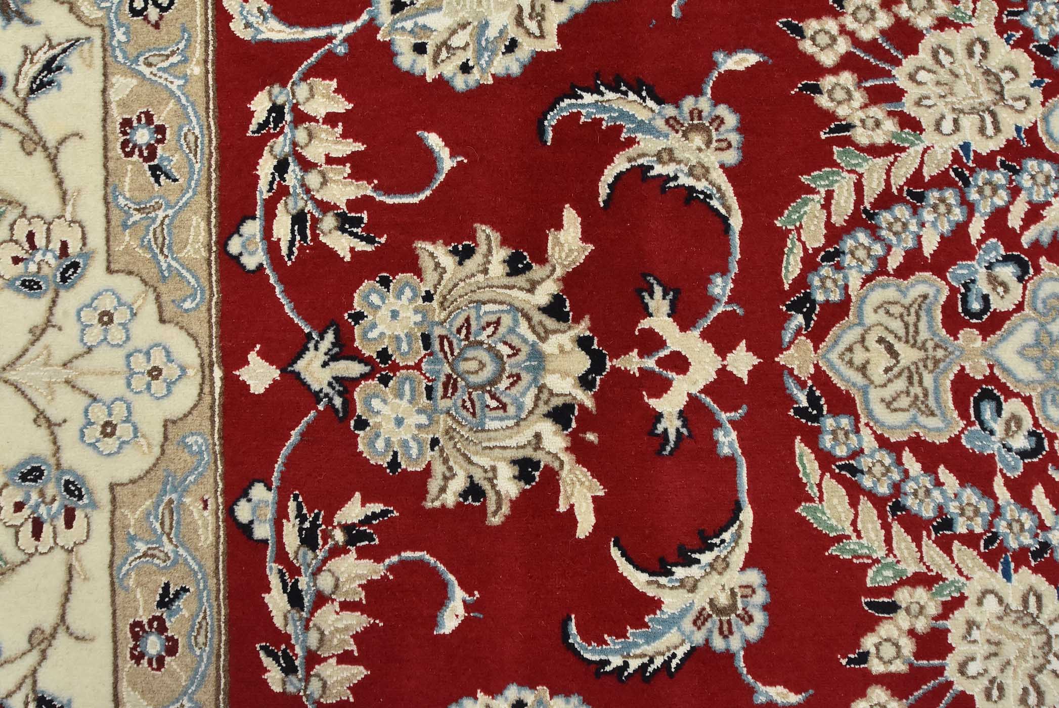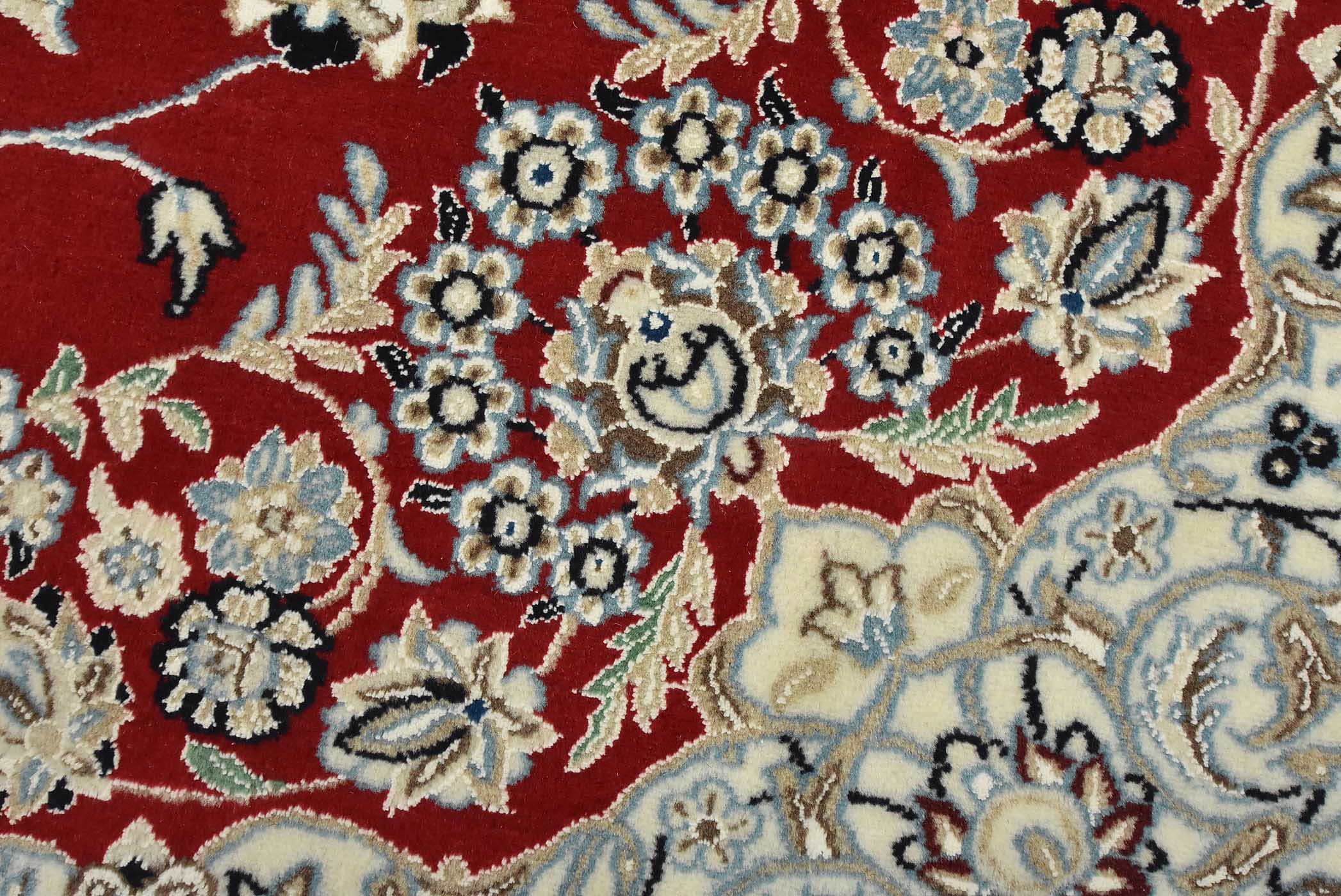 An authentic vintage traditional Nain rug hand-knotted with fine wool and natural dyes. This intricately woven rug features a central medallion surrounded by a floral design set against a red background. It has a full wool pile with no worn areas and is in very good condition.