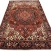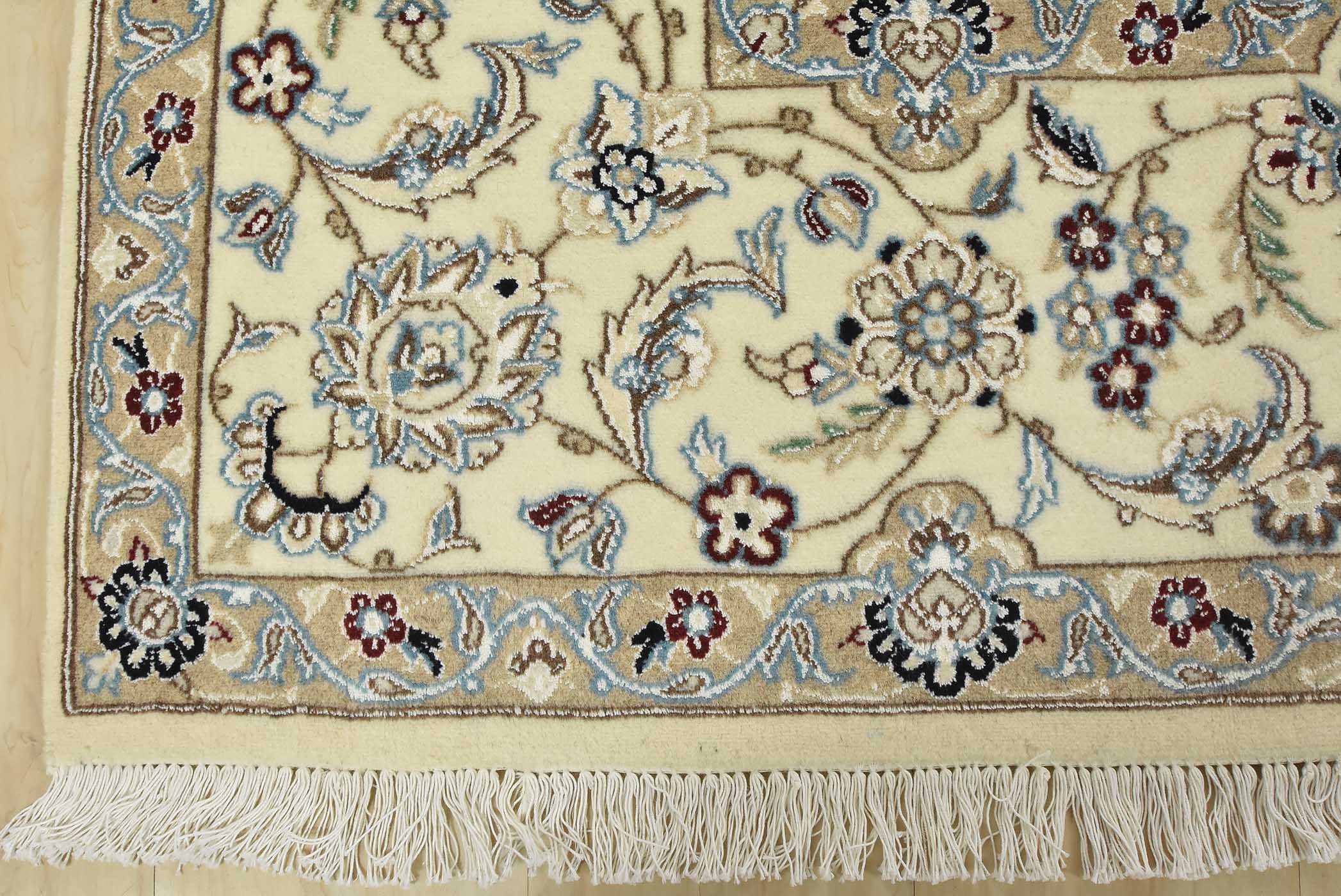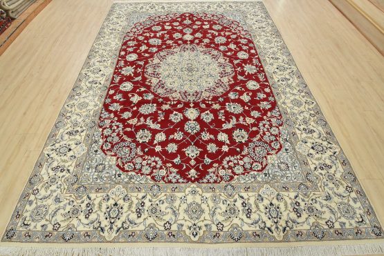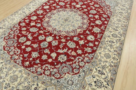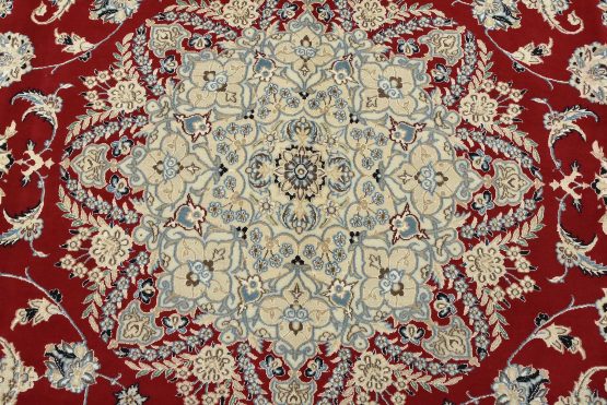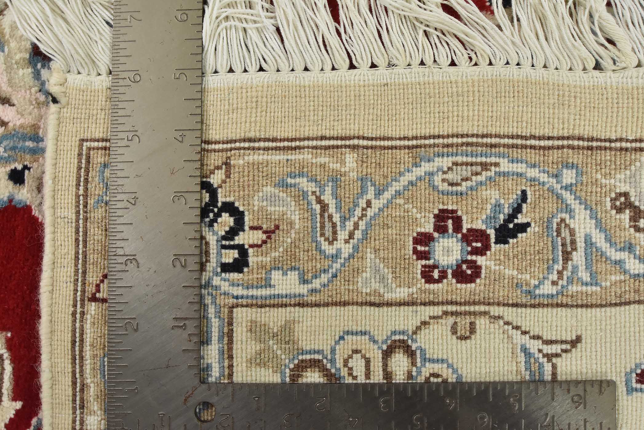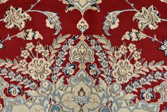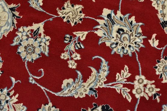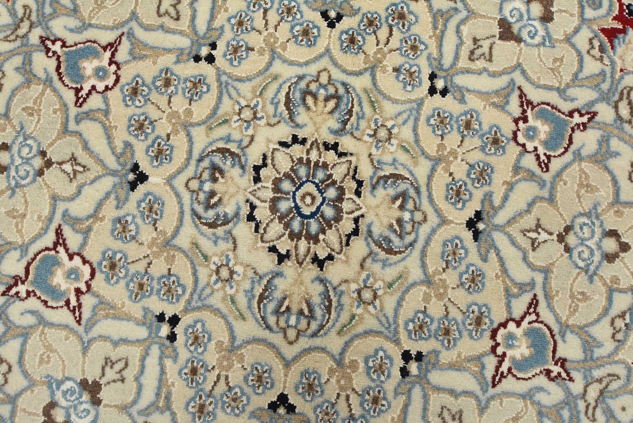 An authentic vintage traditional Nain rug hand-knotted with fine wool and natural dyes. This intricately woven rug features a central medallion surrounded by a floral design set against a red background. It has a full wool pile with no worn areas and is in very good condition.