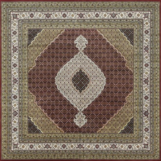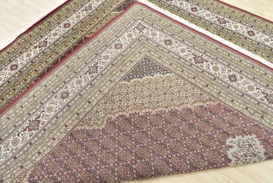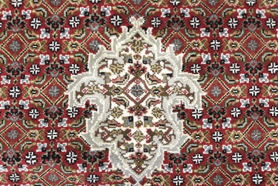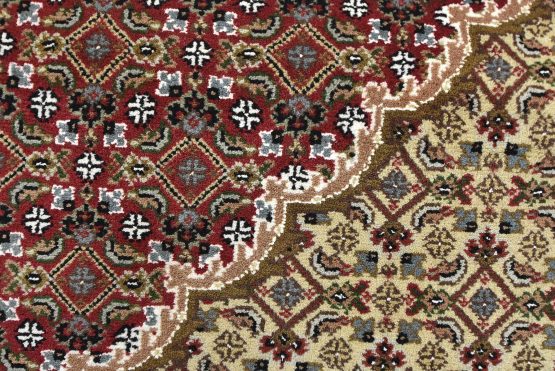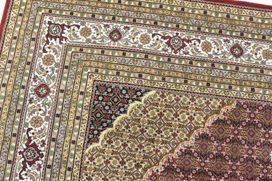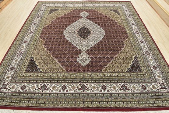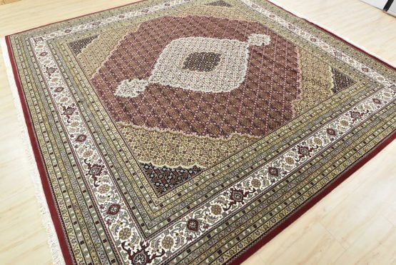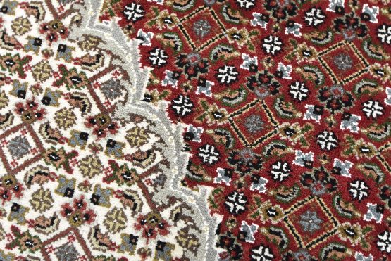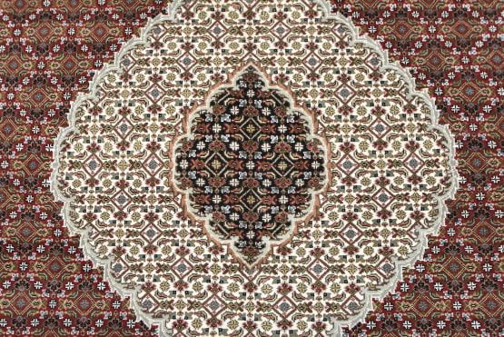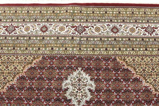 A traditional Tabriz Mahi rug hand-knotted with an all-wool pile on a cotton foundation. This finely woven oriental rug features a central medallion surrounded by an intricate Herati pattern set against a red background. It is new and in excellent condition.
