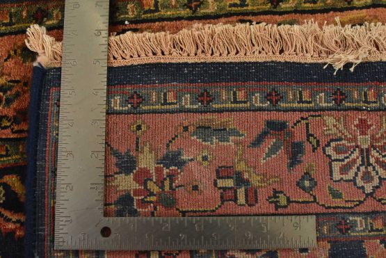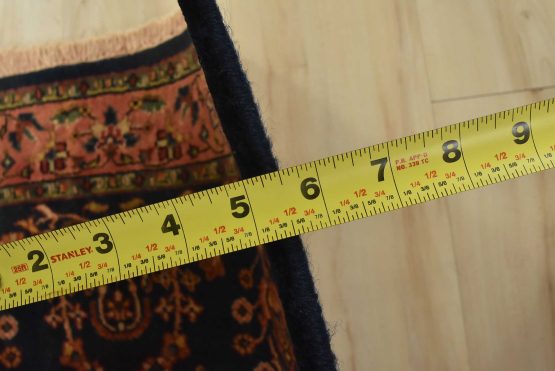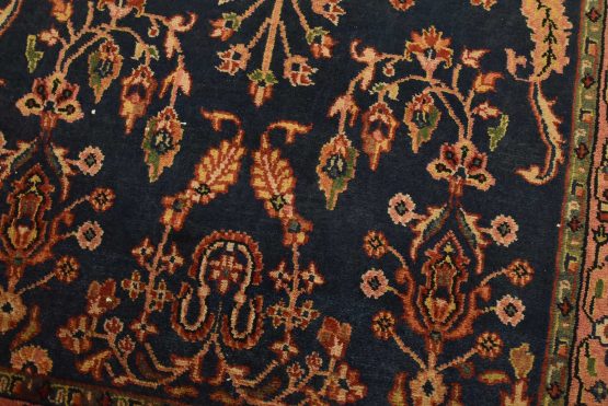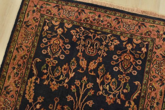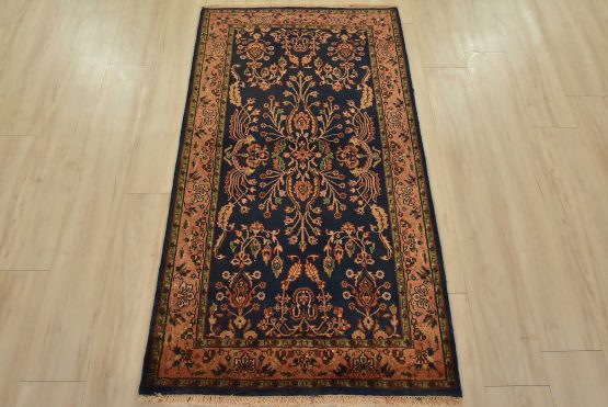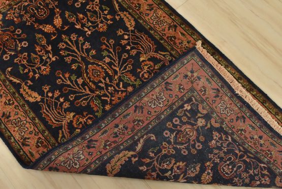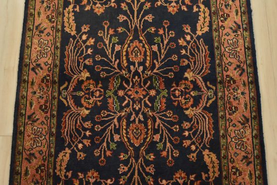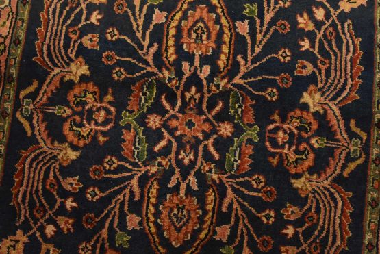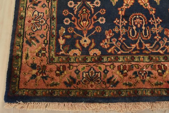 A traditional Sarouk rug hand-knotted with an all-wool pile on a cotton foundation. This finely woven oriental rug features an all-over floral pattern set against a dark blue background. It is new and in excellent condition.