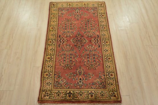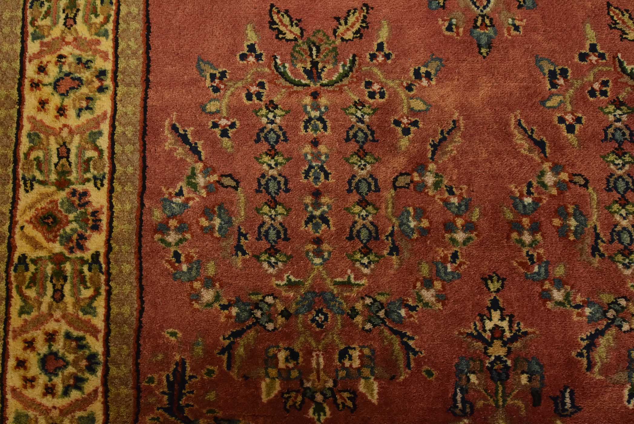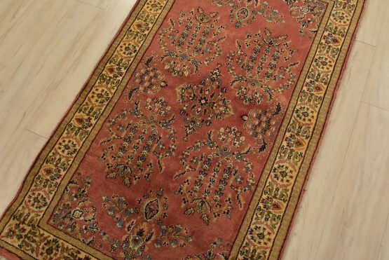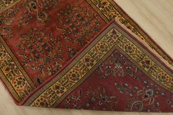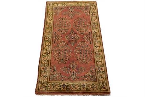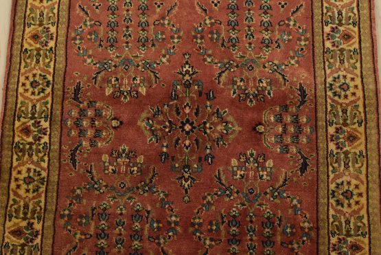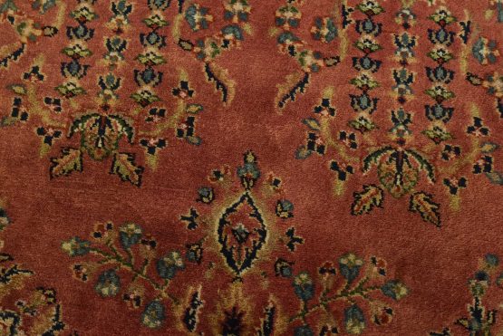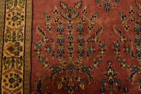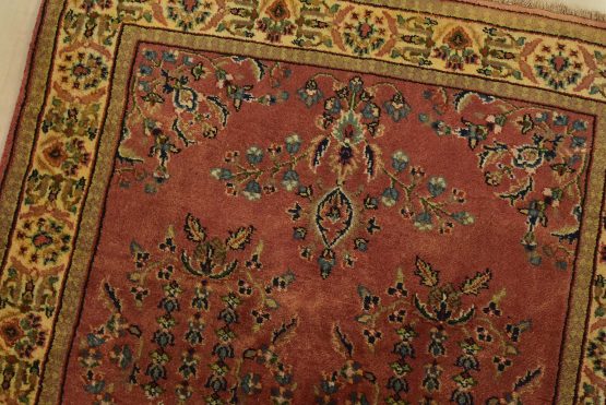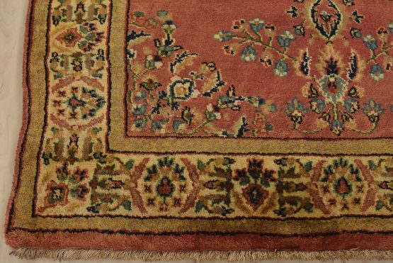 A traditional Sarouk rug hand-knotted with an all-wool pile on a cotton foundation. This finely woven oriental rug features an all-over floral pattern set against a pink background. It is new and in excellent condition.