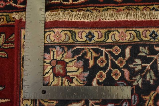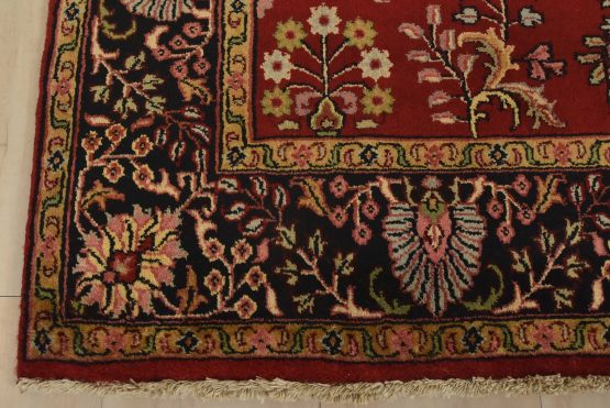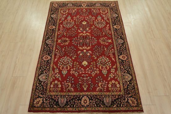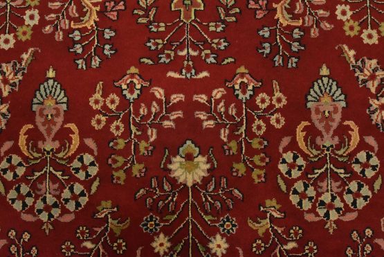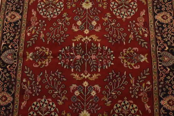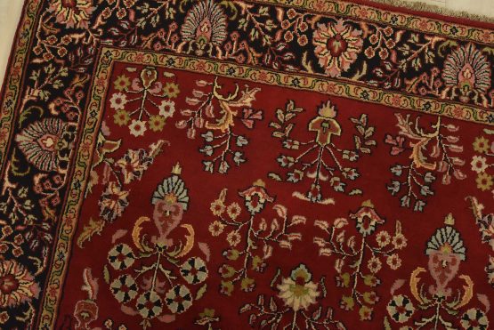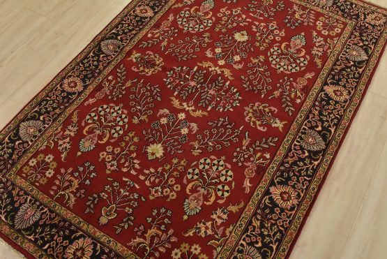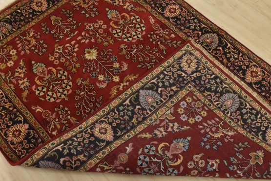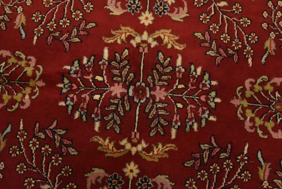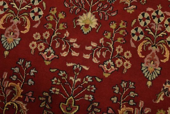 A traditional Sarouk rug hand-knotted with an all-wool pile on a cotton foundation. This finely woven oriental rug features an all-over floral pattern set against a red background. It is new and in excellent condition.
