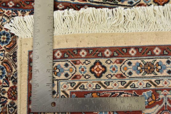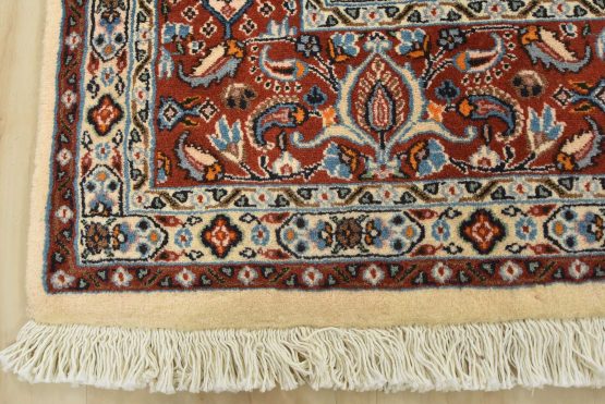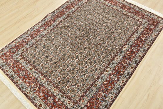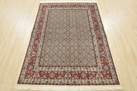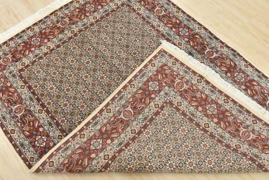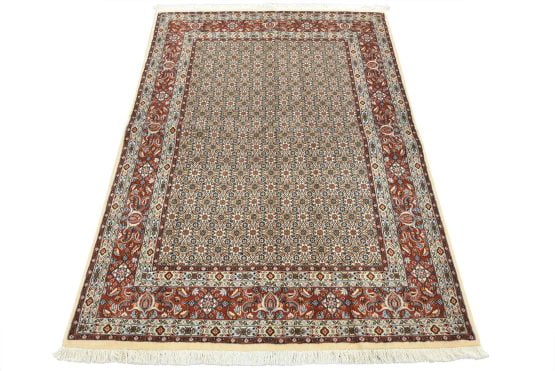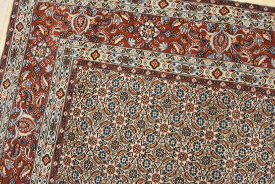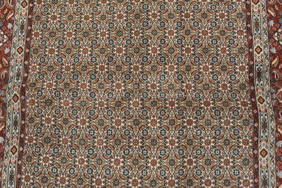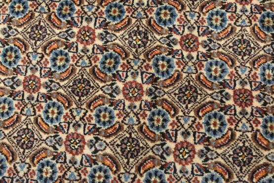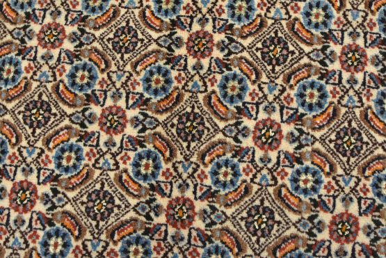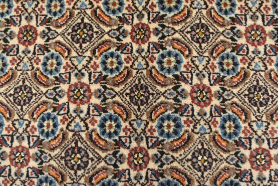 An authentic vintage traditional Mood rug hand-knotted with fine wool and natural dyes. This finely woven oriental rug features an intricate all-over Herati pattern set against an ivory background. It has a full wool pile with no worn areas and is in very good condition.