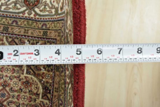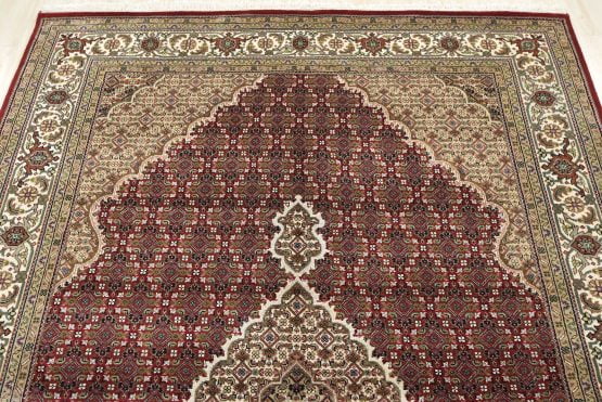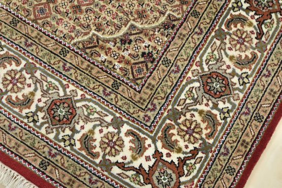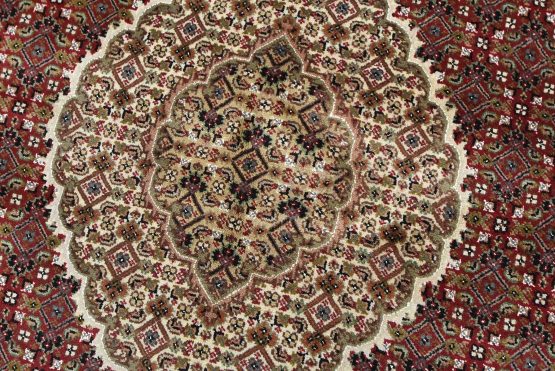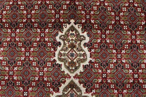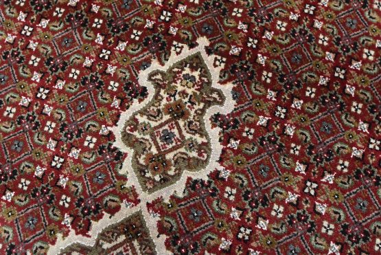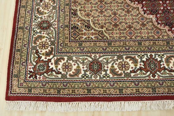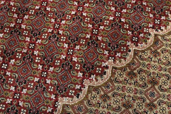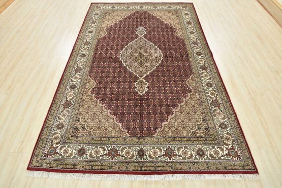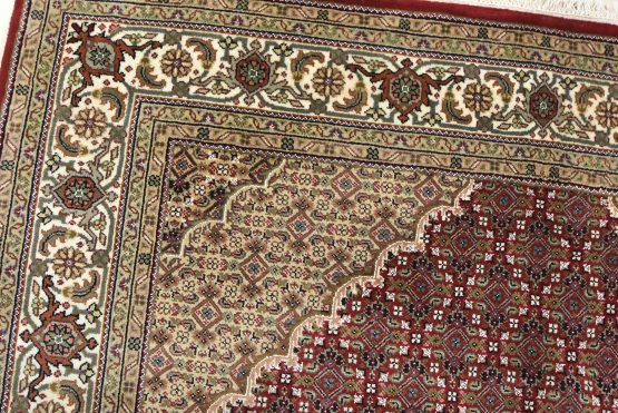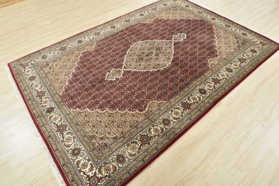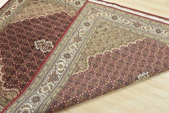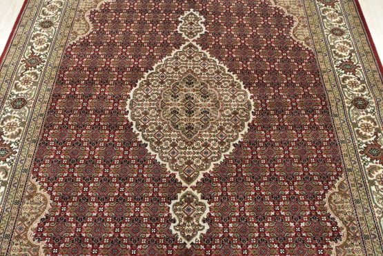 A traditional Tabriz Mahi rug hand-knotted with an all-wool pile on a cotton foundation. This finely woven oriental rug features a central medallion surrounded by an intricate Herati pattern set against a red background. It is new and in excellent condition.