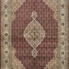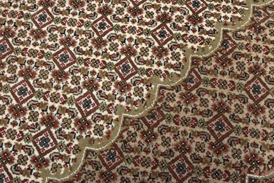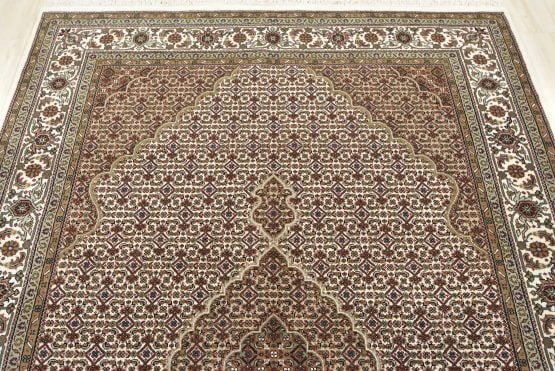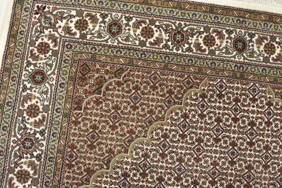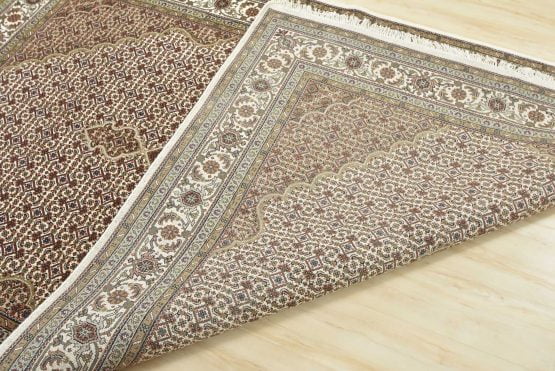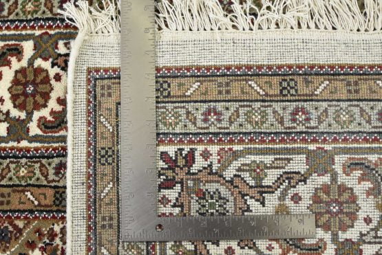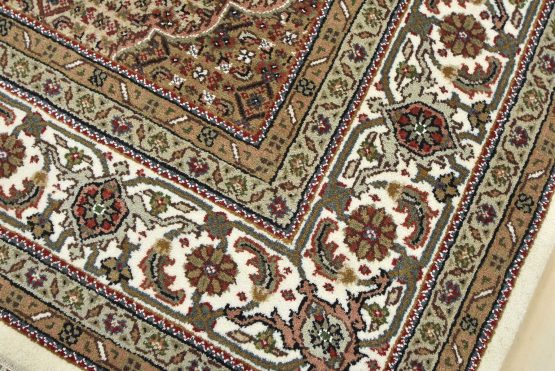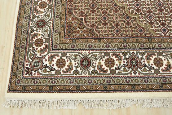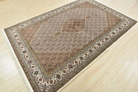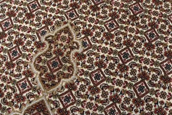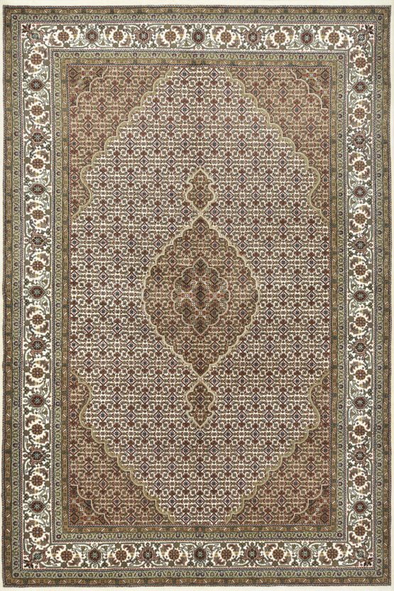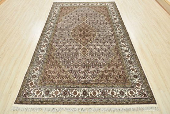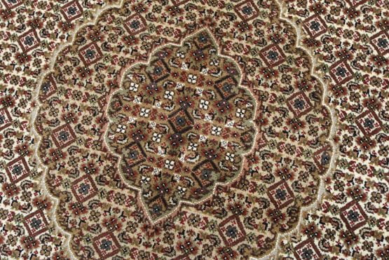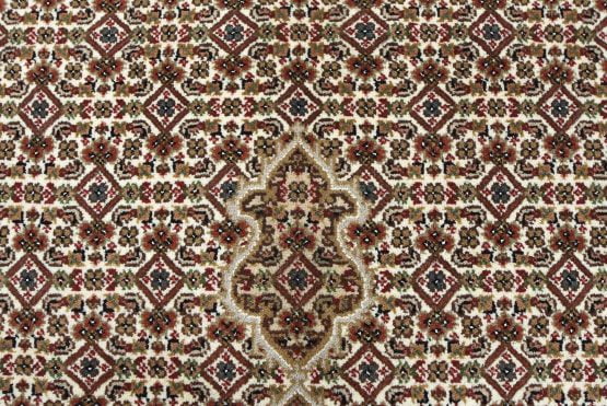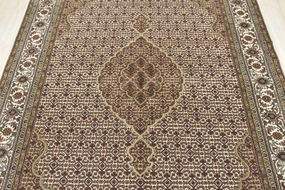 A traditional Tabriz Mahi rug hand-knotted with an all-wool pile on a cotton foundation. This finely woven oriental rug features a central medallion surrounded by an intricate Herati pattern set against an ivory background. It is new and in excellent condition.