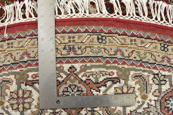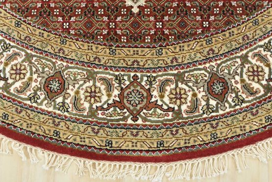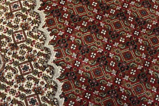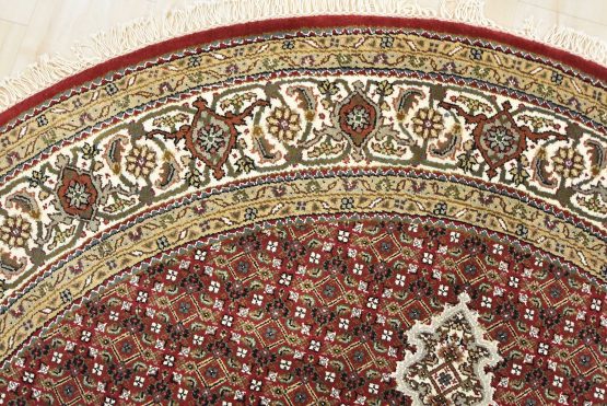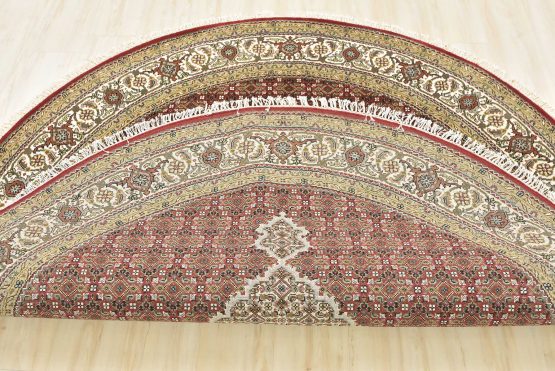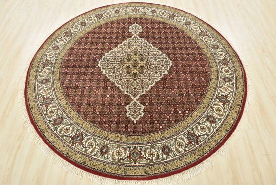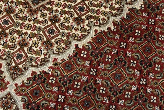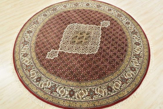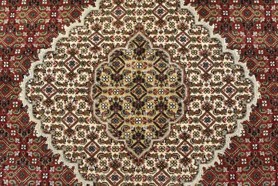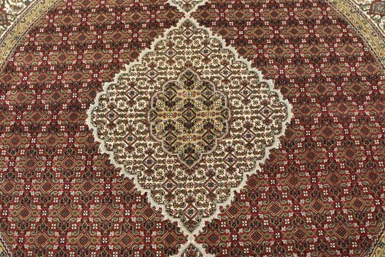 A traditional Tabriz Mahi rug hand-knotted with an all-wool pile on a cotton foundation. This finely woven oriental rug features a central medallion surrounded by an intricate Herati pattern set against a red background. It is new and in excellent condition.