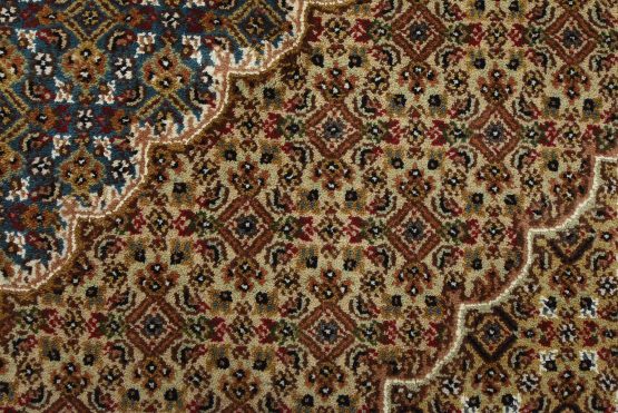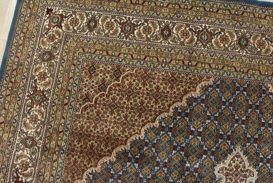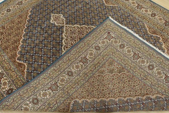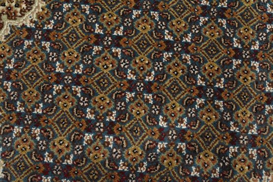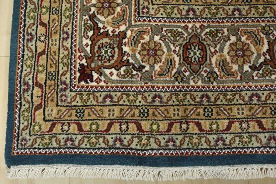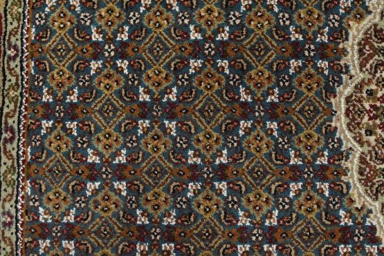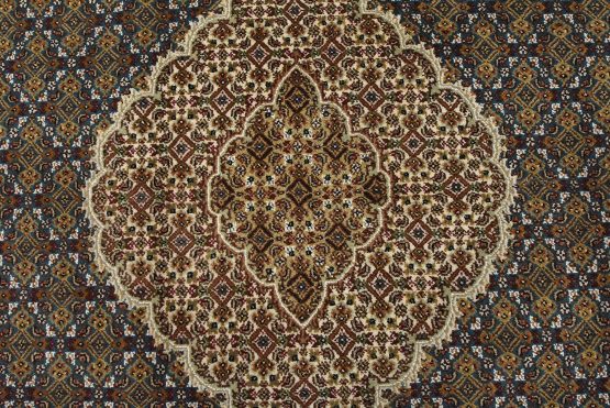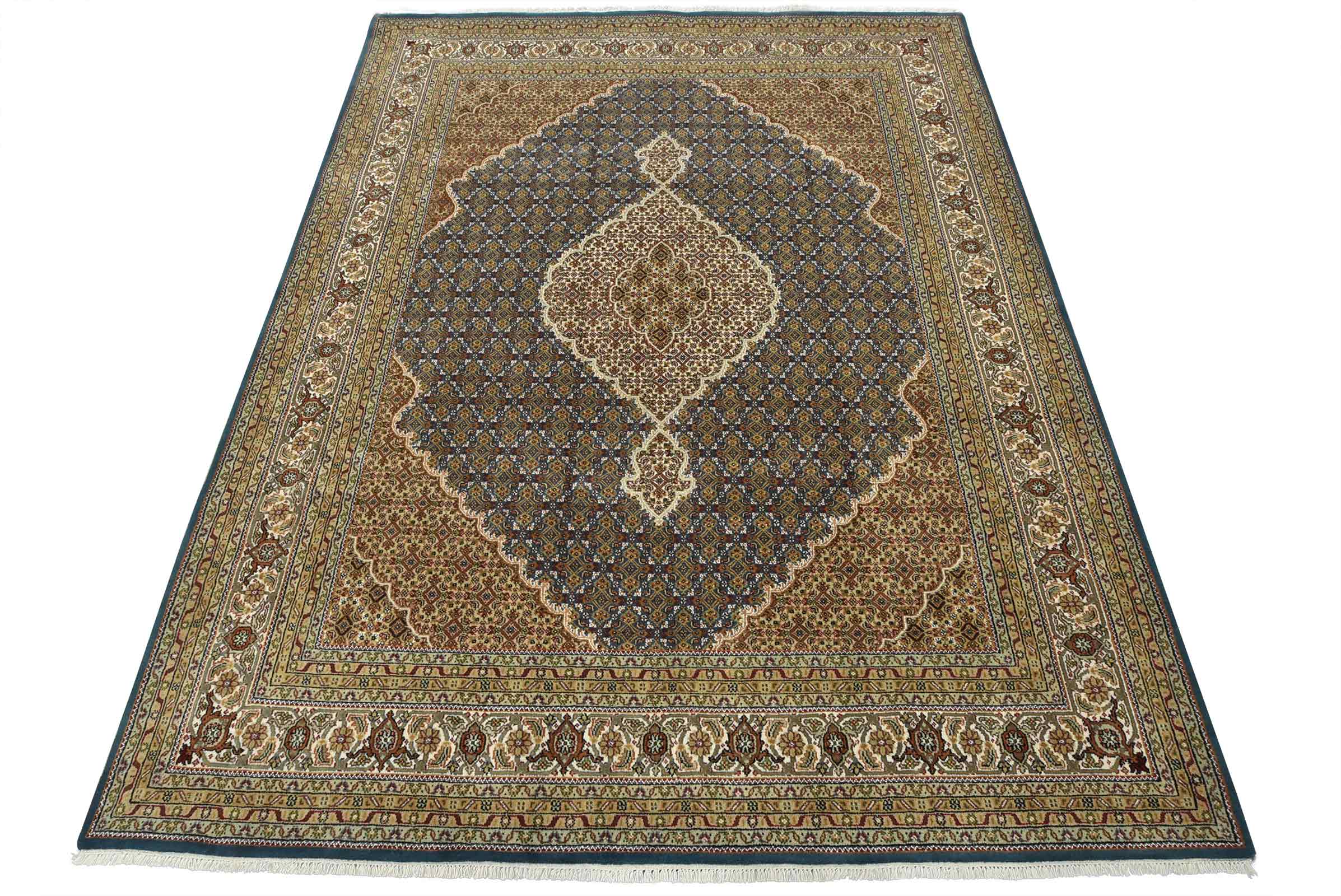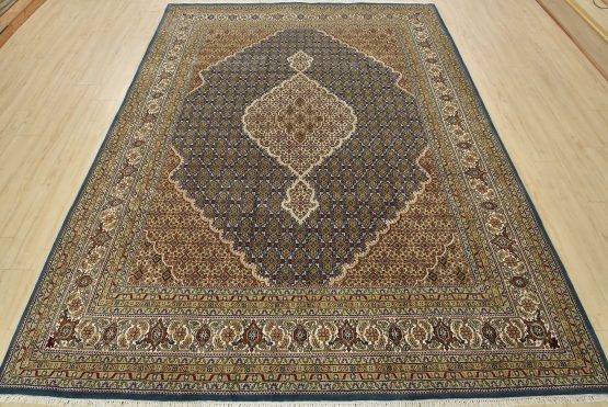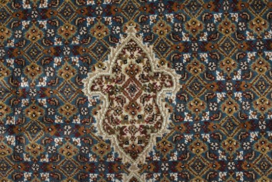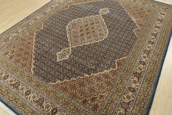 A traditional Tabriz Mahi rug hand-knotted with an all-wool pile on a cotton foundation. This finely woven oriental rug features a central medallion surrounded by a small-scale Herati pattern set against a blue background. It is new and in excellent condition.