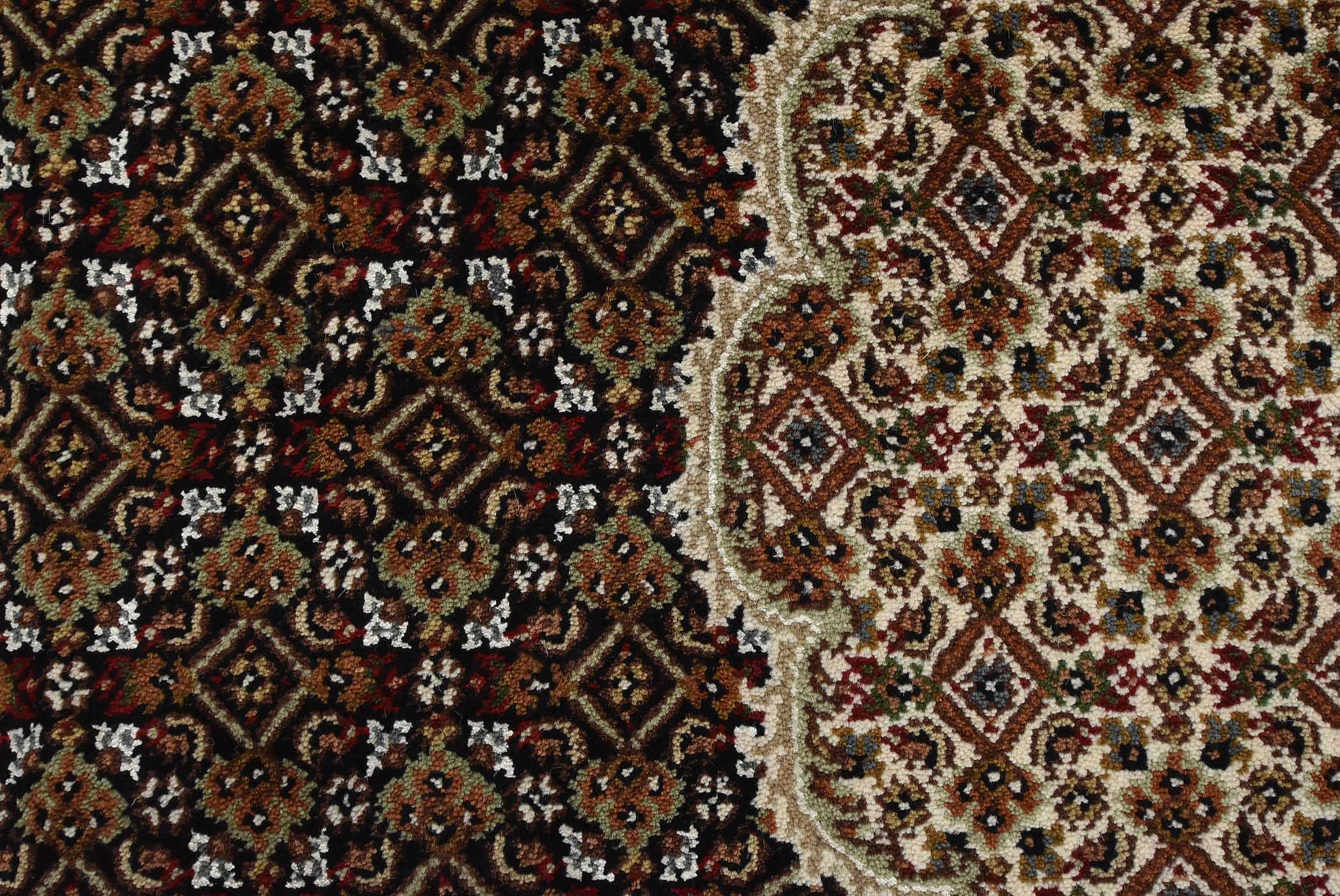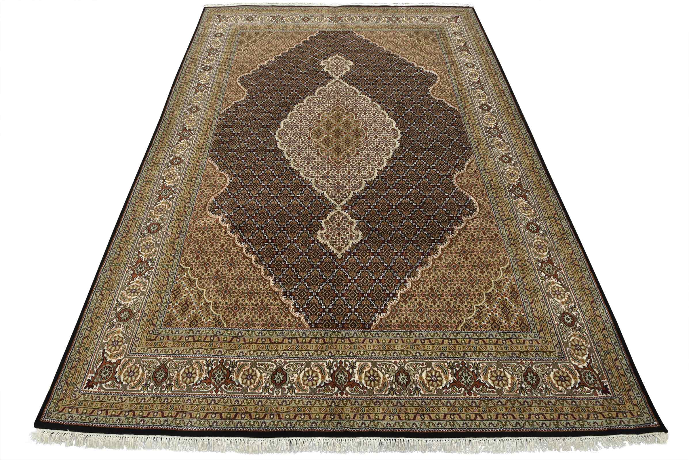 A traditional Tabriz Mahi rug hand-knotted with an all-wool pile on a cotton foundation. This finely woven oriental rug features a central medallion surrounded by a small-scale Herati pattern set against a black background. It is new and in excellent condition.