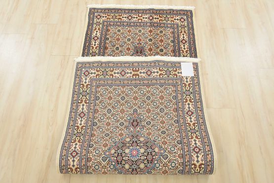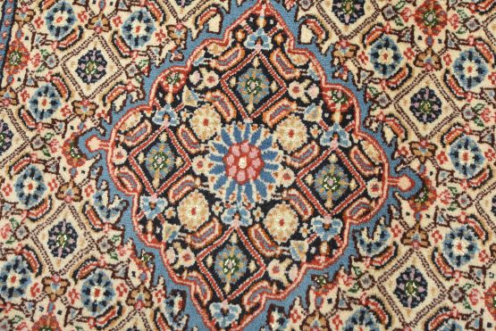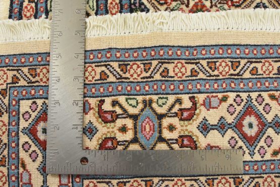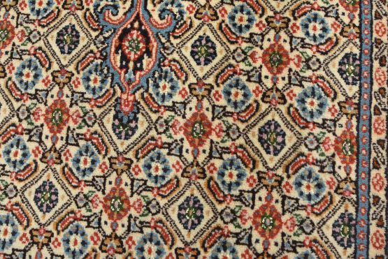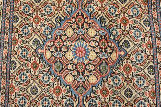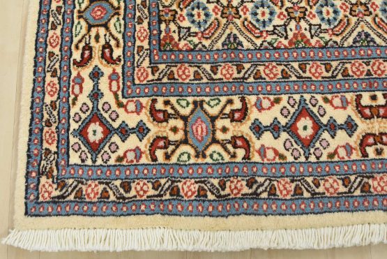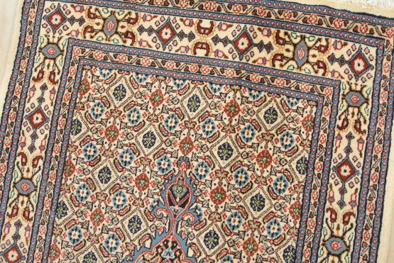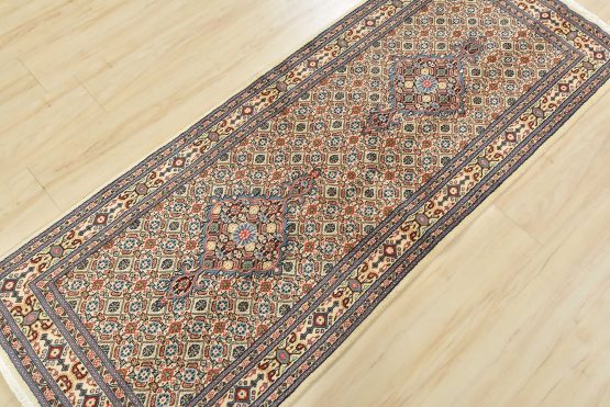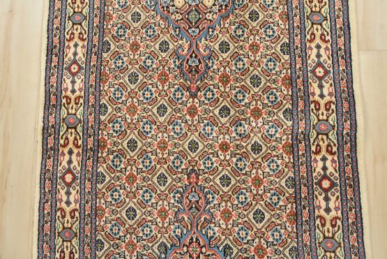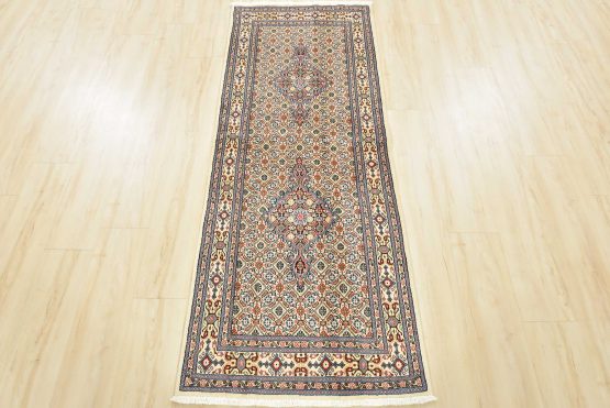 An authentic vintage traditional Mood runner hand-knotted with fine wool and natural dyes. This finely woven oriental rug features curvilinear medallions surrounded by an intricate Herati pattern set against an ivory background. It has a full wool pile with no worn areas and is in very good condition.