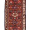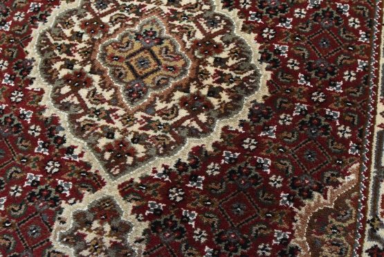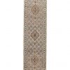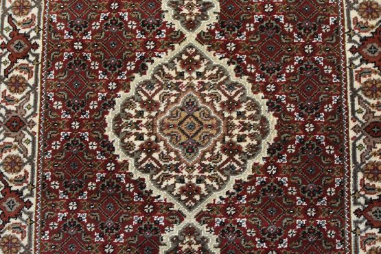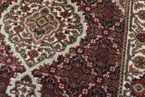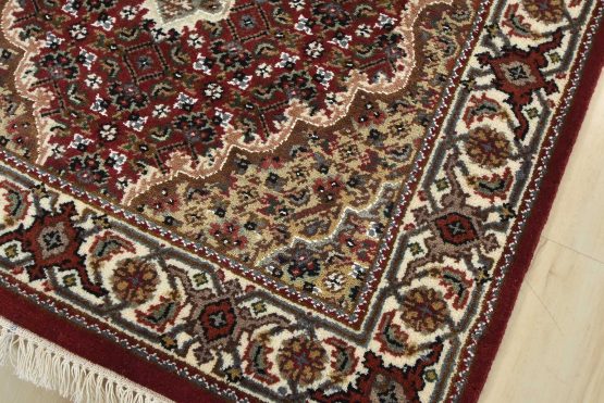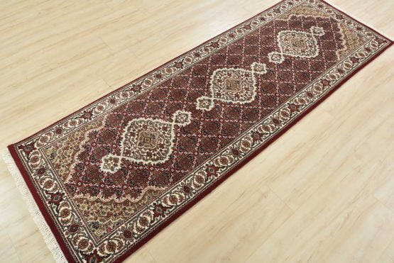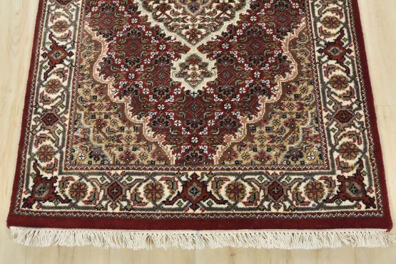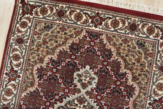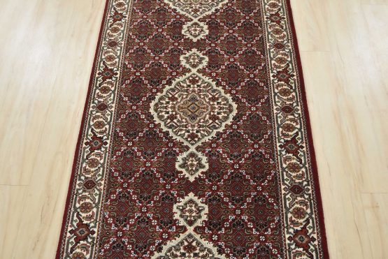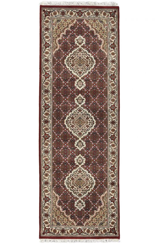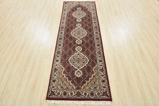A traditional Tabriz Mahi runner hand-knotted with an all-wool pile on a cotton foundation. This oriental rug features medallions surrounded by an intricate Herati pattern set against a red background. It is new and in excellent condition.