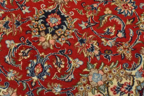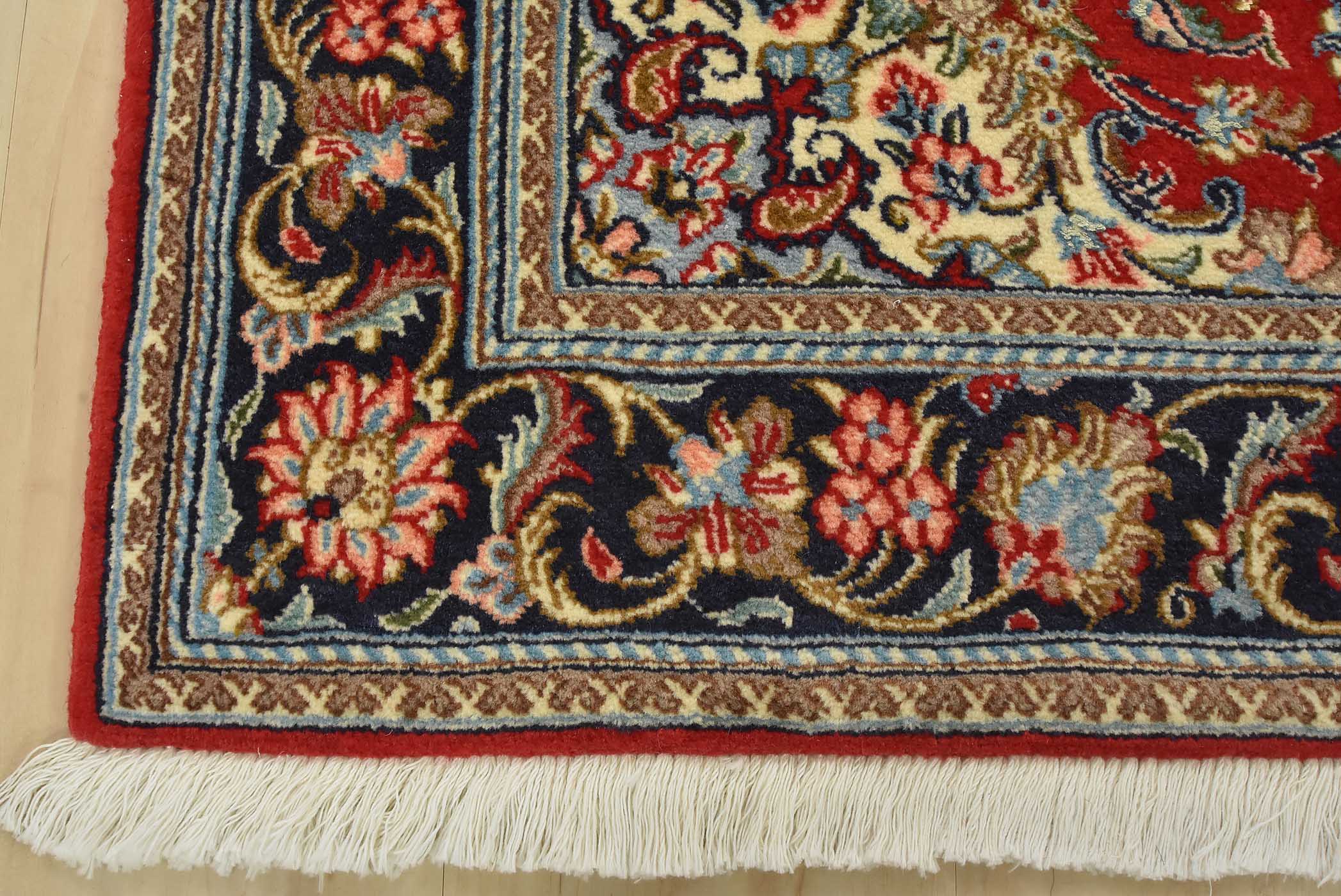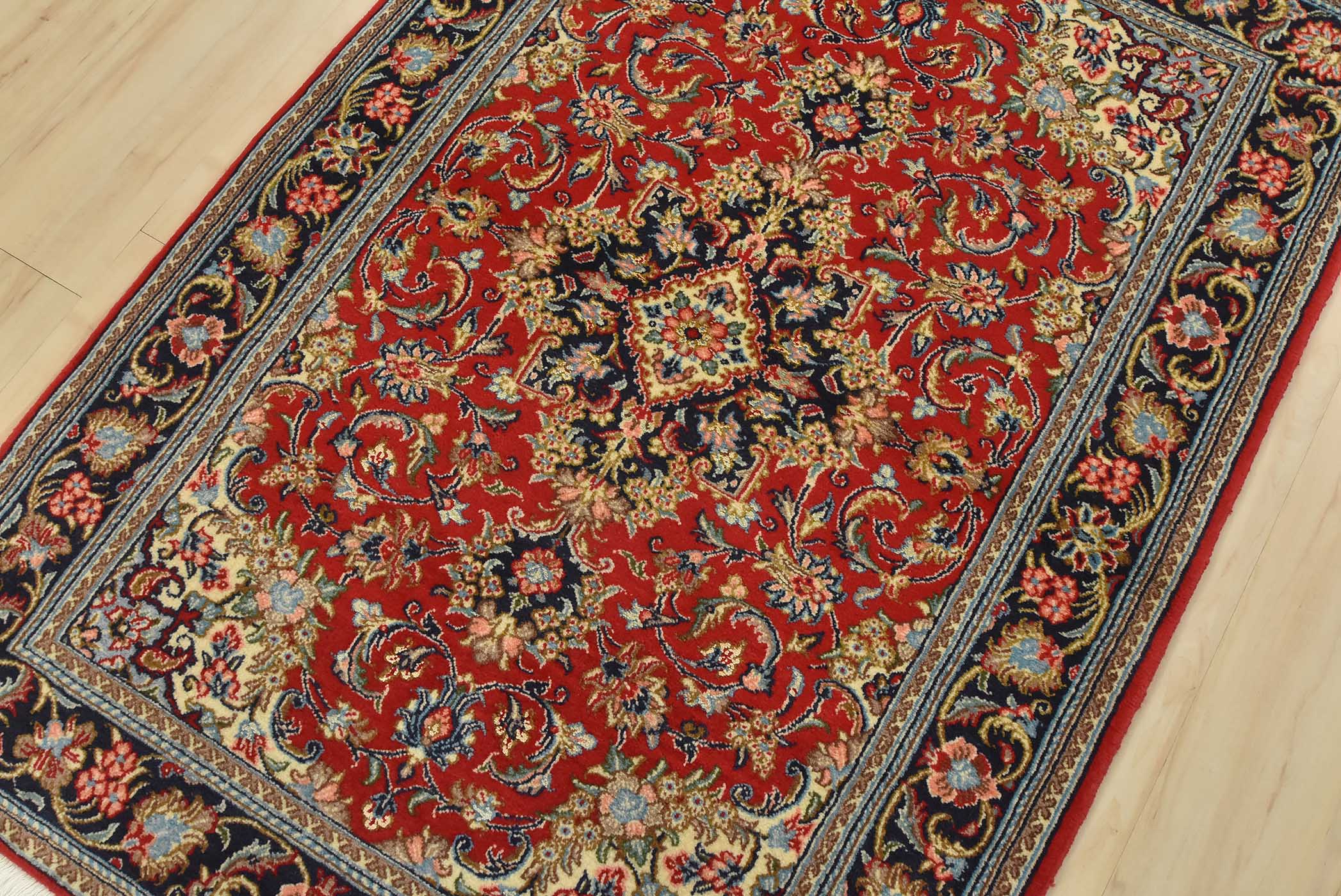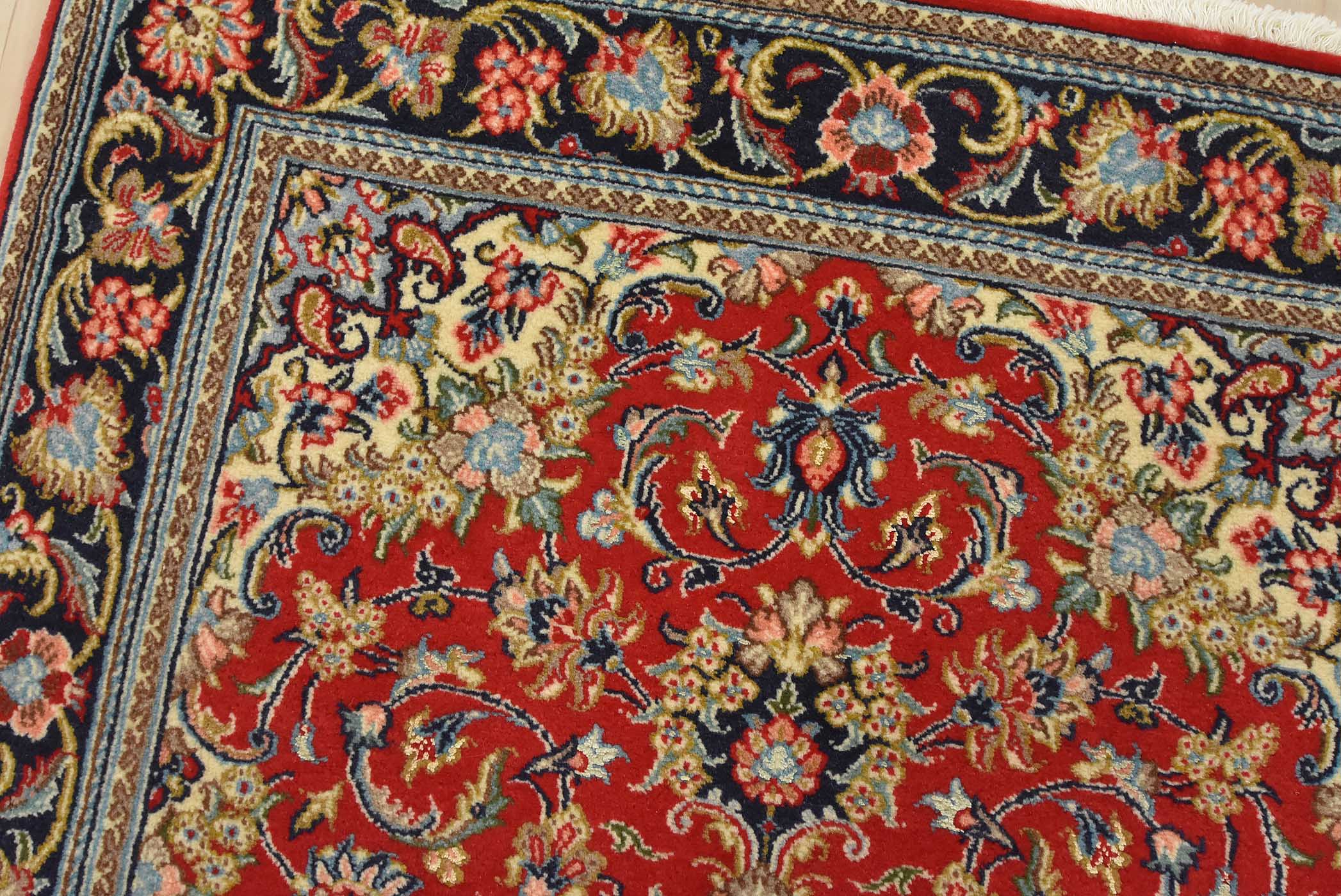 An authentic vintage traditional Qom rug, hand-knotted with fine wool and silk highlights, using natural dyes. This intricately woven rug features a central medallion surrounded by a floral design set against a red background. It has a full wool pile with no worn areas and is in very good condition.