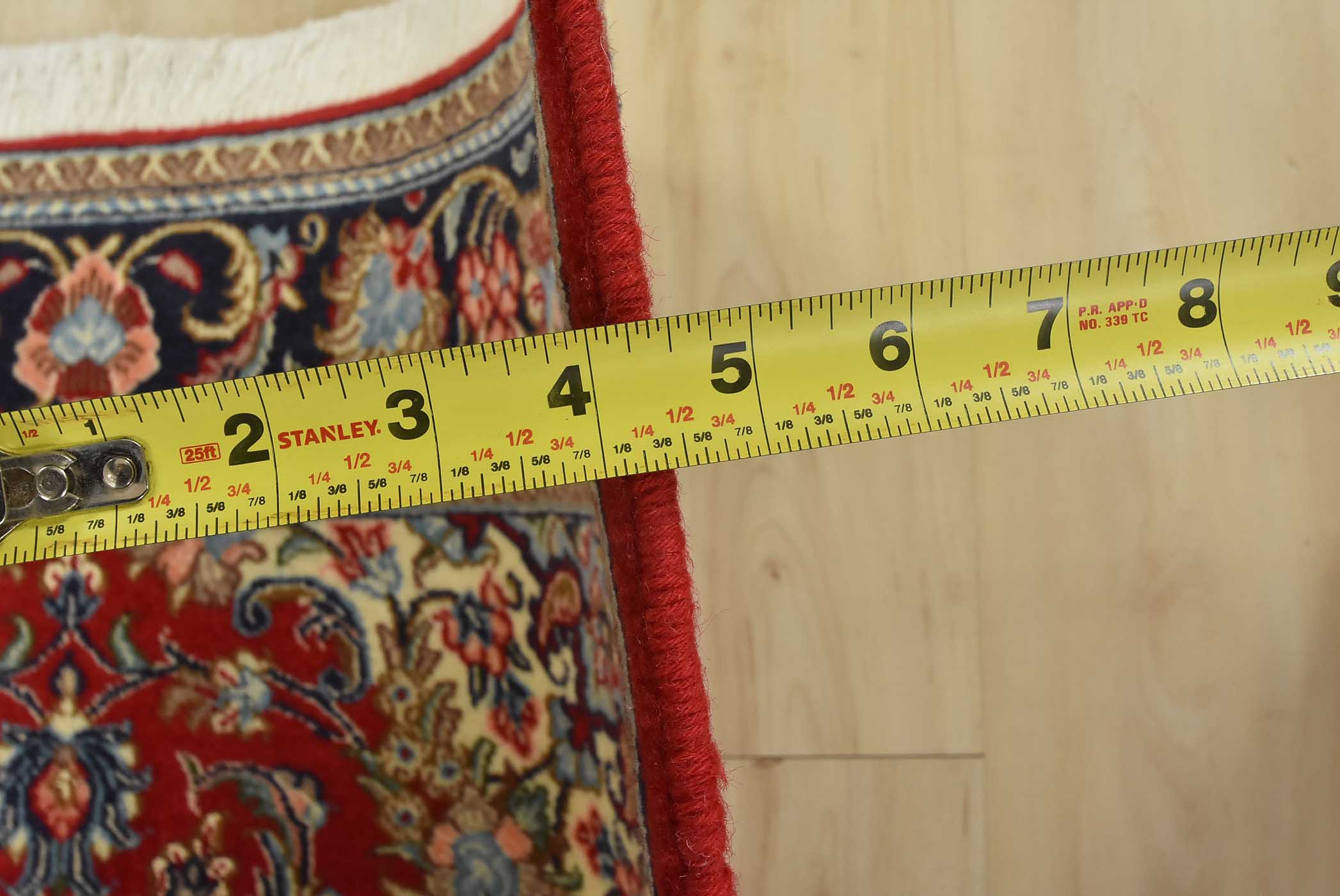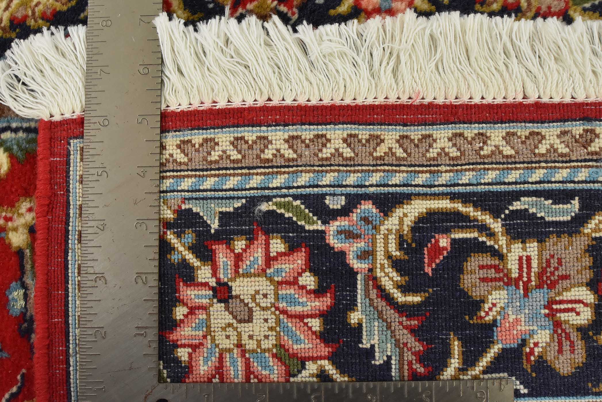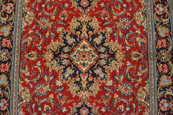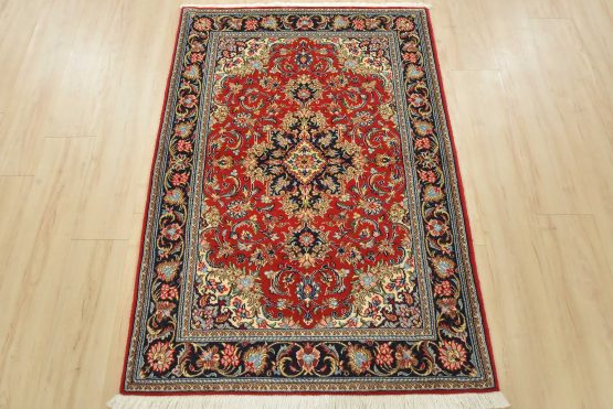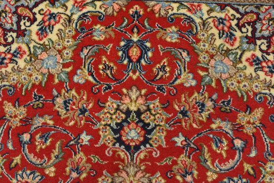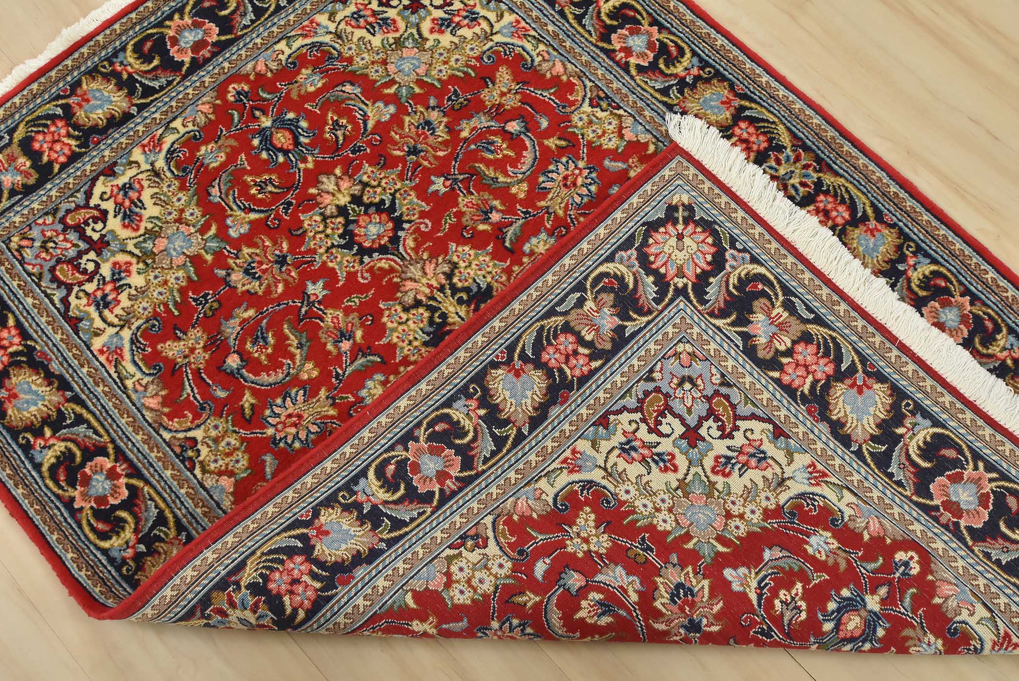 An authentic vintage traditional Qom rug, hand-knotted with fine wool and silk highlights, using natural dyes. This intricately woven rug features a central medallion surrounded by a floral design set against a red background. It has a full wool pile with no worn areas and is in very good condition.