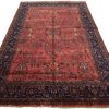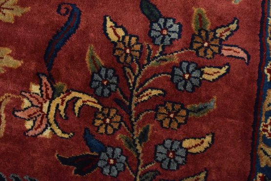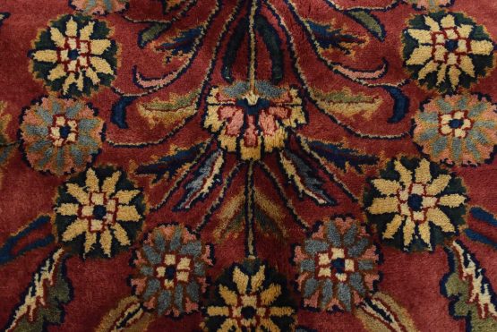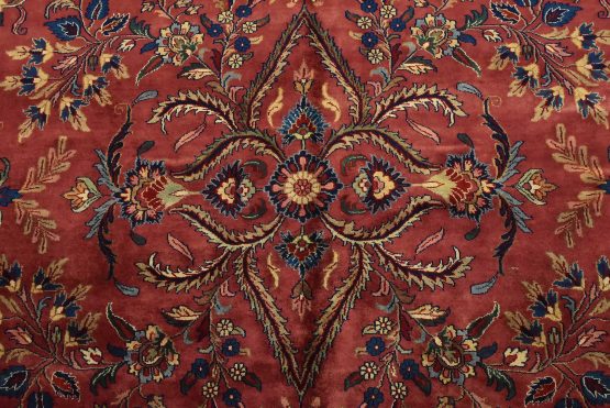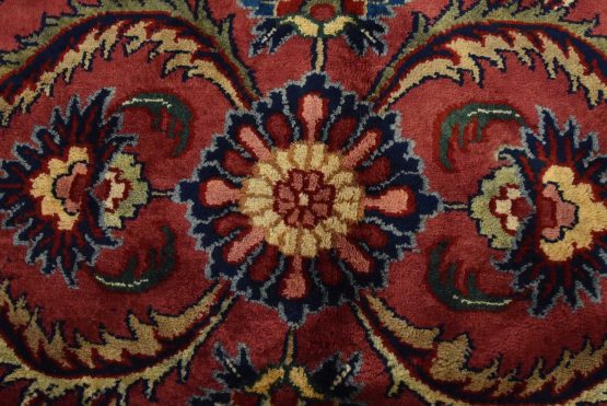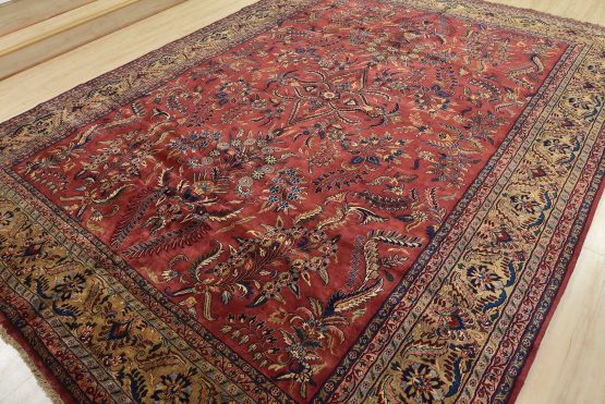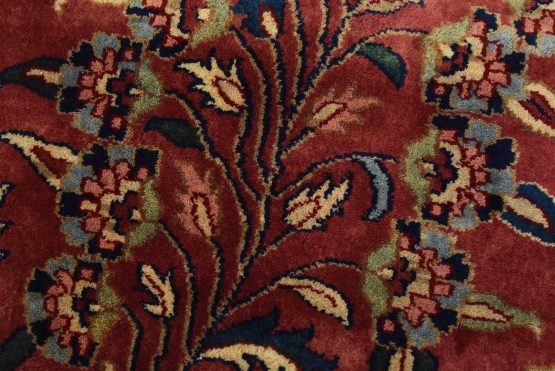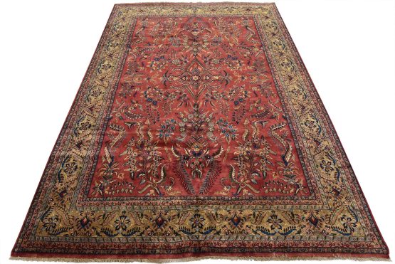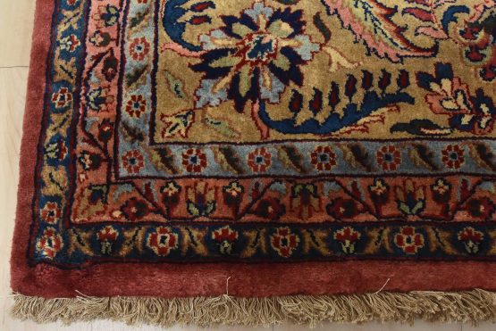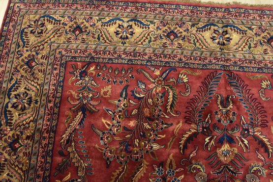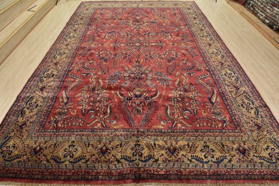 A vintage traditional Sarouk rug hand-knotted with an all-wool pile on a cotton foundation. This finely woven oriental rug features an all-over floral design set against a pink background. There is a tiny worn area on the back, see photos. Otherwise, this rug has a full wool pile and is in very good condition.